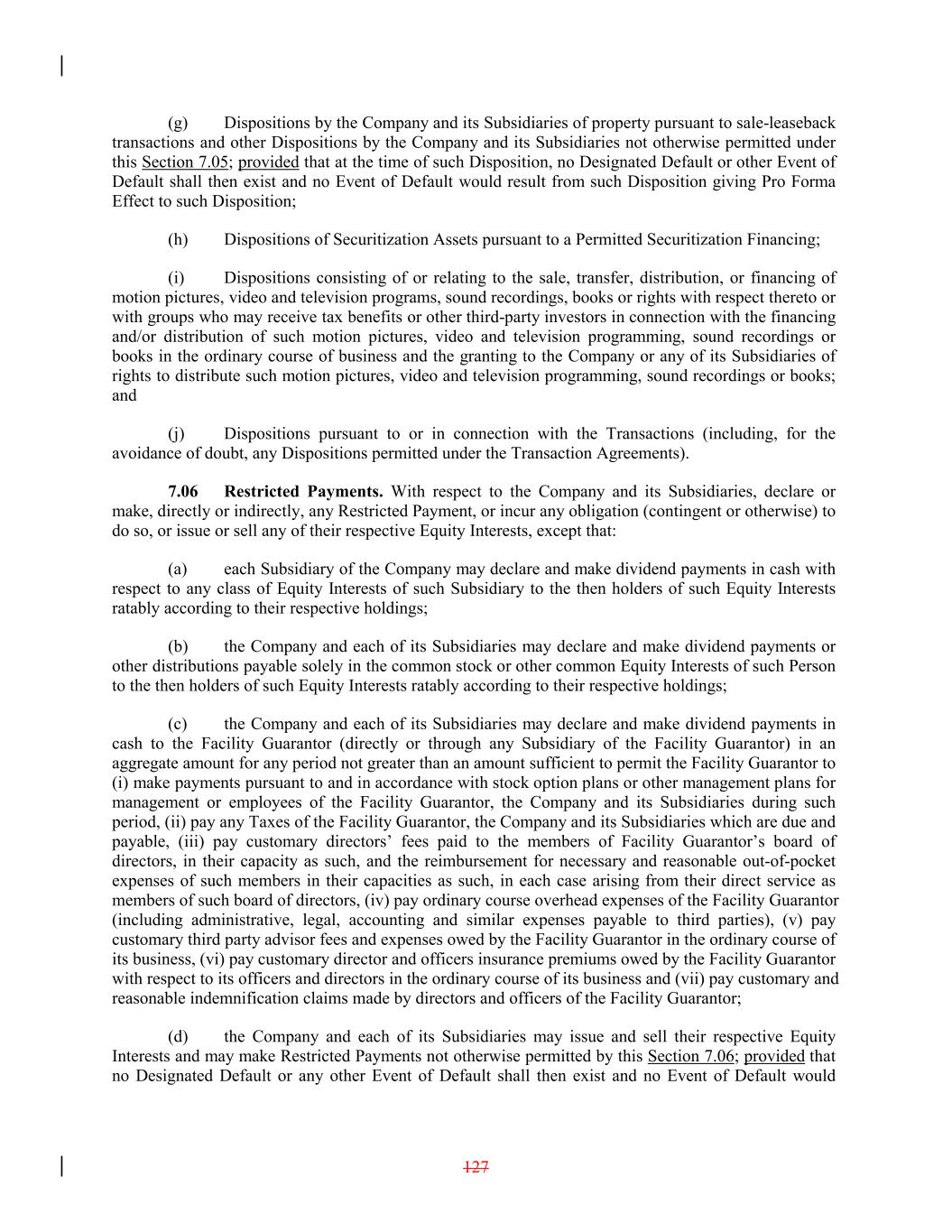 (g) Dispositions by the Company and its Subsidiaries of property pursuant to sale-leaseback transactions and other Dispositions by the Company and its Subsidiaries not otherwise permitted under this Section 7.05; provided that at the time of such Disposition, no Designated Default or other Event of Default shall then exist and no Event of Default would result from such Disposition giving Pro Forma Effect to such Disposition; (h) Dispositions of Securitization Assets pursuant to a Permitted Securitization Financing; (i) Dispositions consisting of or relating to the sale, transfer, distribution, or financing of motion pictures, video and television programs, sound recordings, books or rights with respect thereto or with groups who may receive tax benefits or other third-party investors in connection with the financing and/or distribution of such motion pictures, video and television programming, sound recordings or books in the ordinary course of business and the granting to the Company or any of its Subsidiaries of rights to distribute such motion pictures, video and television programming, sound recordings or books; and (j) Dispositions pursuant to or in connection with the Transactions (including, for the avoidance of doubt, any Dispositions permitted under the Transaction Agreements). 7.06 Restricted Payments. With respect to the Company and its Subsidiaries, declare or make, directly or indirectly, any Restricted Payment, or incur any obligation (contingent or otherwise) to do so, or issue or sell any of their respective Equity Interests, except that: (a) each Subsidiary of the Company may declare and make dividend payments in cash with respect to any class of Equity Interests of such Subsidiary to the then holders of such Equity Interests ratably according to their respective holdings; (b) the Company and each of its Subsidiaries may declare and make dividend payments or other distributions payable solely in the common stock or other common Equity Interests of such Person to the then holders of such Equity Interests ratably according to their respective holdings; (c) the Company and each of its Subsidiaries may declare and make dividend payments in cash to the Facility Guarantor (directly or through any Subsidiary of the Facility Guarantor) in an aggregate amount for any period not greater than an amount sufficient to permit the Facility Guarantor to (i) make payments pursuant to and in accordance with stock option plans or other management plans for management or employees of the Facility Guarantor, the Company and its Subsidiaries during such period, (ii) pay any Taxes of the Facility Guarantor, the Company and its Subsidiaries which are due and payable, (iii) pay customary directors’ fees paid to the members of Facility Guarantor’s board of directors, in their capacity as such, and the reimbursement for necessary and reasonable out-of-pocket expenses of such members in their capacities as such, in each case arising from their direct service as members of such board of directors, (iv) pay ordinary course overhead expenses of the Facility Guarantor (including administrative, legal, accounting and similar expenses payable to third parties), (v) pay customary third party advisor fees and expenses owed by the Facility Guarantor in the ordinary course of its business, (vi) pay customary director and officers insurance premiums owed by the Facility Guarantor with respect to its officers and directors in the ordinary course of its business and (vii) pay customary and reasonable indemnification claims made by directors and officers of the Facility Guarantor; (d) the Company and each of its Subsidiaries may issue and sell their respective Equity Interests and may make Restricted Payments not otherwise permitted by this Section 7.06; provided that no Designated Default or any other Event of Default shall then exist and no Event of Default would 127