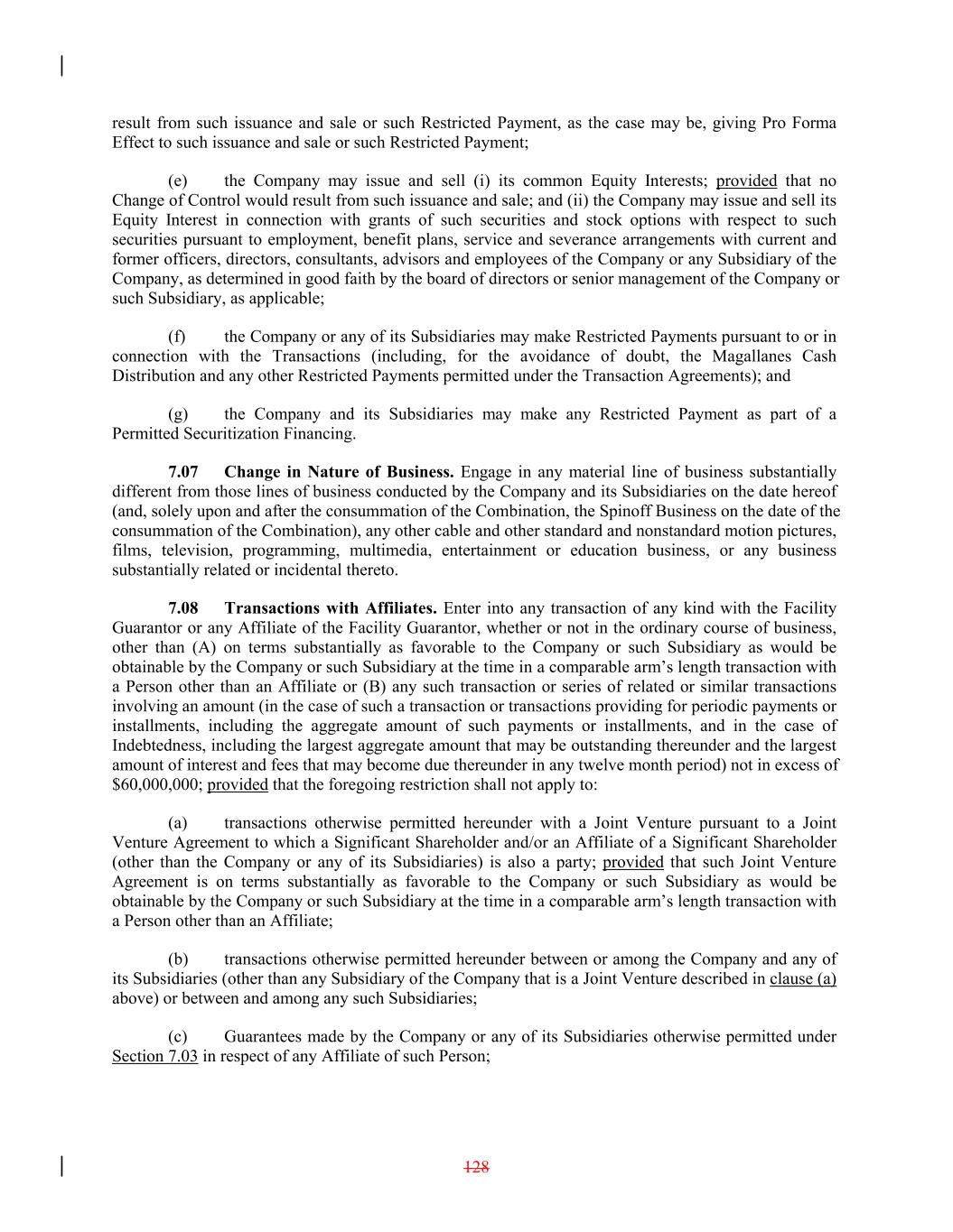 result from such issuance and sale or such Restricted Payment, as the case may be, giving Pro Forma Effect to such issuance and sale or such Restricted Payment; (e) the Company may issue and sell (i) its common Equity Interests; provided that no Change of Control would result from such issuance and sale; and (ii) the Company may issue and sell its Equity Interest in connection with grants of such securities and stock options with respect to such securities pursuant to employment, benefit plans, service and severance arrangements with current and former officers, directors, consultants, advisors and employees of the Company or any Subsidiary of the Company, as determined in good faith by the board of directors or senior management of the Company or such Subsidiary, as applicable; (f) the Company or any of its Subsidiaries may make Restricted Payments pursuant to or in connection with the Transactions (including, for the avoidance of doubt, the Magallanes Cash Distribution and any other Restricted Payments permitted under the Transaction Agreements); and (g) the Company and its Subsidiaries may make any Restricted Payment as part of a Permitted Securitization Financing. 7.07 Change in Nature of Business. Engage in any material line of business substantially different from those lines of business conducted by the Company and its Subsidiaries on the date hereof (and, solely upon and after the consummation of the Combination, the Spinoff Business on the date of the consummation of the Combination), any other cable and other standard and nonstandard motion pictures, films, television, programming, multimedia, entertainment or education business, or any business substantially related or incidental thereto. 7.08 Transactions with Affiliates. Enter into any transaction of any kind with the Facility Guarantor or any Affiliate of the Facility Guarantor, whether or not in the ordinary course of business, other than (A) on terms substantially as favorable to the Company or such Subsidiary as would be obtainable by the Company or such Subsidiary at the time in a comparable arm’s length transaction with a Person other than an Affiliate or (B) any such transaction or series of related or similar transactions involving an amount (in the case of such a transaction or transactions providing for periodic payments or installments, including the aggregate amount of such payments or installments, and in the case of Indebtedness, including the largest aggregate amount that may be outstanding thereunder and the largest amount of interest and fees that may become due thereunder in any twelve month period) not in excess of $60,000,000; provided that the foregoing restriction shall not apply to: (a) transactions otherwise permitted hereunder with a Joint Venture pursuant to a Joint Venture Agreement to which a Significant Shareholder and/or an Affiliate of a Significant Shareholder (other than the Company or any of its Subsidiaries) is also a party; provided that such Joint Venture Agreement is on terms substantially as favorable to the Company or such Subsidiary as would be obtainable by the Company or such Subsidiary at the time in a comparable arm’s length transaction with a Person other than an Affiliate; (b) transactions otherwise permitted hereunder between or among the Company and any of its Subsidiaries (other than any Subsidiary of the Company that is a Joint Venture described in clause (a) above) or between and among any such Subsidiaries; (c) Guarantees made by the Company or any of its Subsidiaries otherwise permitted under Section 7.03 in respect of any Affiliate of such Person; 128
