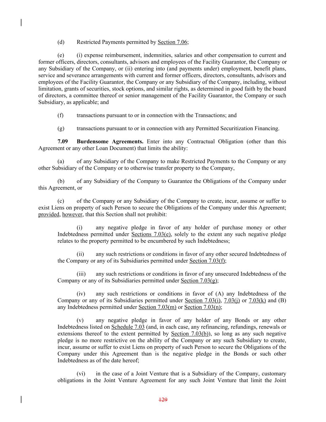 (d) Restricted Payments permitted by Section 7.06; (e) (i) expense reimbursement, indemnities, salaries and other compensation to current and former officers, directors, consultants, advisors and employees of the Facility Guarantor, the Company or any Subsidiary of the Company, or (ii) entering into (and payments under) employment, benefit plans, service and severance arrangements with current and former officers, directors, consultants, advisors and employees of the Facility Guarantor, the Company or any Subsidiary of the Company, including, without limitation, grants of securities, stock options, and similar rights, as determined in good faith by the board of directors, a committee thereof or senior management of the Facility Guarantor, the Company or such Subsidiary, as applicable; and (f) transactions pursuant to or in connection with the Transactions; and (g) transactions pursuant to or in connection with any Permitted Securitization Financing. 7.09 Burdensome Agreements. Enter into any Contractual Obligation (other than this Agreement or any other Loan Document) that limits the ability: (a) of any Subsidiary of the Company to make Restricted Payments to the Company or any other Subsidiary of the Company or to otherwise transfer property to the Company, (b) of any Subsidiary of the Company to Guarantee the Obligations of the Company under this Agreement, or (c) of the Company or any Subsidiary of the Company to create, incur, assume or suffer to exist Liens on property of such Person to secure the Obligations of the Company under this Agreement; provided, however, that this Section shall not prohibit: (i) any negative pledge in favor of any holder of purchase money or other Indebtedness permitted under Sections 7.03(e), solely to the extent any such negative pledge relates to the property permitted to be encumbered by such Indebtedness; (ii) any such restrictions or conditions in favor of any other secured Indebtedness of the Company or any of its Subsidiaries permitted under Section 7.03(f); (iii) any such restrictions or conditions in favor of any unsecured Indebtedness of the Company or any of its Subsidiaries permitted under Section 7.03(g); (iv) any such restrictions or conditions in favor of (A) any Indebtedness of the Company or any of its Subsidiaries permitted under Section 7.03(i), 7.03(j) or 7.03(k) and (B) any Indebtedness permitted under Section 7.03(m) or Section 7.03(n); (v) any negative pledge in favor of any holder of any Bonds or any other Indebtedness listed on Schedule 7.03 (and, in each case, any refinancing, refundings, renewals or extensions thereof to the extent permitted by Section 7.03(b)), so long as any such negative pledge is no more restrictive on the ability of the Company or any such Subsidiary to create, incur, assume or suffer to exist Liens on property of such Person to secure the Obligations of the Company under this Agreement than is the negative pledge in the Bonds or such other Indebtedness as of the date hereof; (vi) in the case of a Joint Venture that is a Subsidiary of the Company, customary obligations in the Joint Venture Agreement for any such Joint Venture that limit the Joint 129