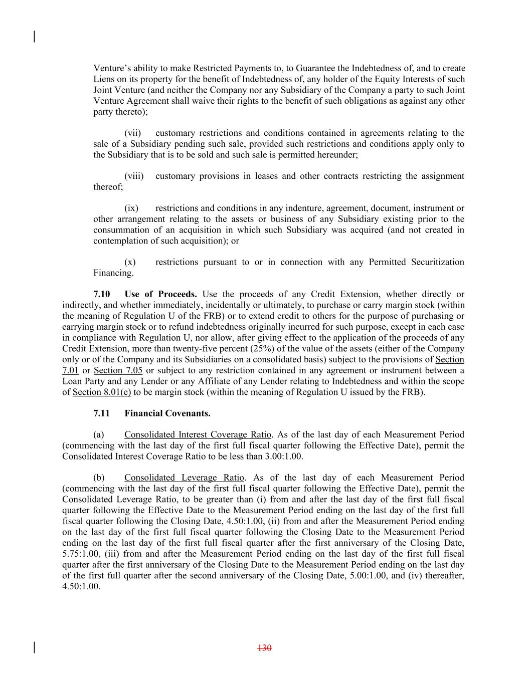 Venture’s ability to make Restricted Payments to, to Guarantee the Indebtedness of, and to create Liens on its property for the benefit of Indebtedness of, any holder of the Equity Interests of such Joint Venture (and neither the Company nor any Subsidiary of the Company a party to such Joint Venture Agreement shall waive their rights to the benefit of such obligations as against any other party thereto); (vii) customary restrictions and conditions contained in agreements relating to the sale of a Subsidiary pending such sale, provided such restrictions and conditions apply only to the Subsidiary that is to be sold and such sale is permitted hereunder; (viii) customary provisions in leases and other contracts restricting the assignment thereof; (ix) restrictions and conditions in any indenture, agreement, document, instrument or other arrangement relating to the assets or business of any Subsidiary existing prior to the consummation of an acquisition in which such Subsidiary was acquired (and not created in contemplation of such acquisition); or (x) restrictions pursuant to or in connection with any Permitted Securitization Financing. 7.10 Use of Proceeds. Use the proceeds of any Credit Extension, whether directly or indirectly, and whether immediately, incidentally or ultimately, to purchase or carry margin stock (within the meaning of Regulation U of the FRB) or to extend credit to others for the purpose of purchasing or carrying margin stock or to refund indebtedness originally incurred for such purpose, except in each case in compliance with Regulation U, nor allow, after giving effect to the application of the proceeds of any Credit Extension, more than twenty-five percent (25%) of the value of the assets (either of the Company only or of the Company and its Subsidiaries on a consolidated basis) subject to the provisions of Section 7.01 or Section 7.05 or subject to any restriction contained in any agreement or instrument between a Loan Party and any Lender or any Affiliate of any Lender relating to Indebtedness and within the scope of Section 8.01(e) to be margin stock (within the meaning of Regulation U issued by the FRB). 7.11 Financial Covenants. (a) Consolidated Interest Coverage Ratio. As of the last day of each Measurement Period (commencing with the last day of the first full fiscal quarter following the Effective Date), permit the Consolidated Interest Coverage Ratio to be less than 3.00:1.00. (b) Consolidated Leverage Ratio. As of the last day of each Measurement Period (commencing with the last day of the first full fiscal quarter following the Effective Date), permit the Consolidated Leverage Ratio, to be greater than (i) from and after the last day of the first full fiscal quarter following the Effective Date to the Measurement Period ending on the last day of the first full fiscal quarter following the Closing Date, 4.50:1.00, (ii) from and after the Measurement Period ending on the last day of the first full fiscal quarter following the Closing Date to the Measurement Period ending on the last day of the first full fiscal quarter after the first anniversary of the Closing Date, 5.75:1.00, (iii) from and after the Measurement Period ending on the last day of the first full fiscal quarter after the first anniversary of the Closing Date to the Measurement Period ending on the last day of the first full quarter after the second anniversary of the Closing Date, 5.00:1.00, and (iv) thereafter, 4.50:1.00. 130