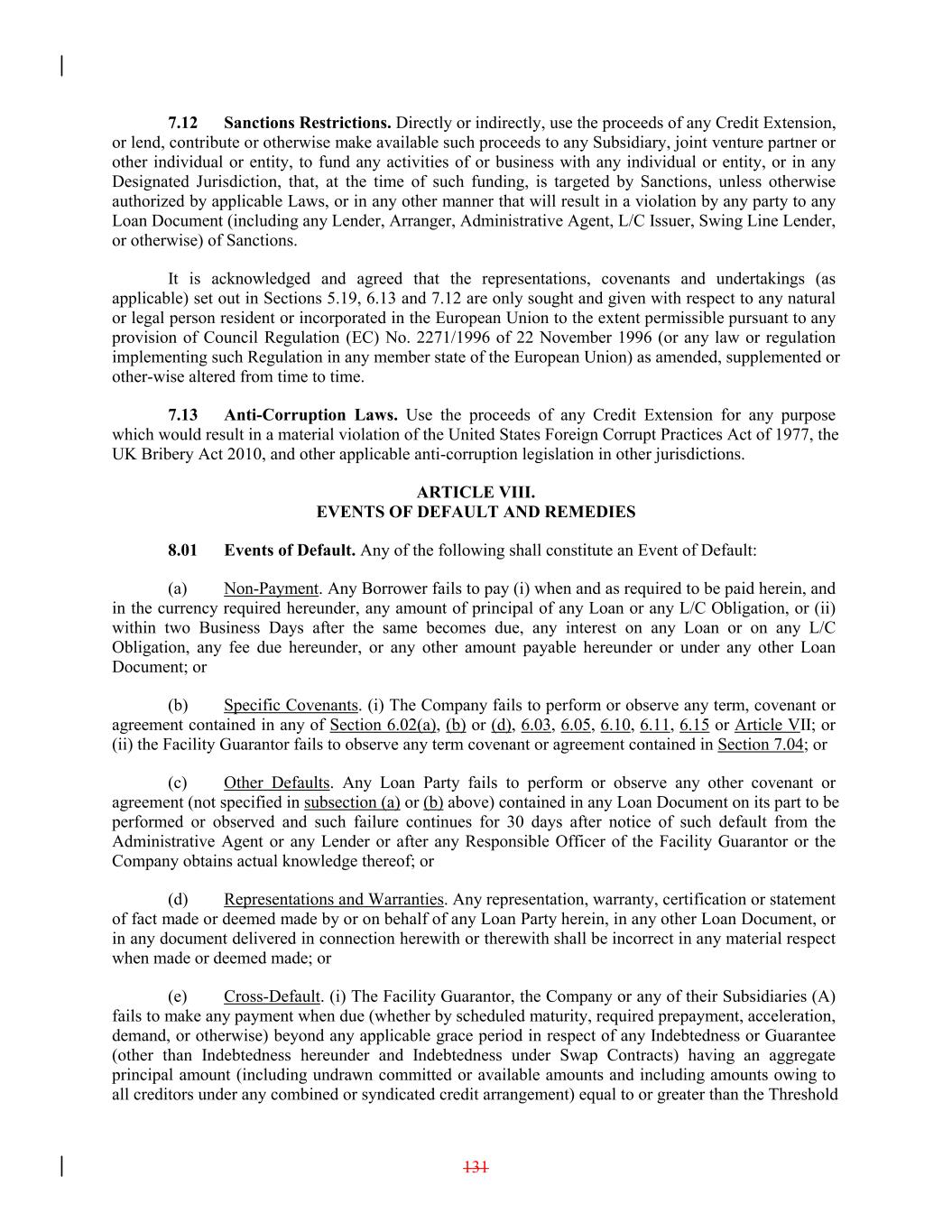 7.12 Sanctions Restrictions. Directly or indirectly, use the proceeds of any Credit Extension, or lend, contribute or otherwise make available such proceeds to any Subsidiary, joint venture partner or other individual or entity, to fund any activities of or business with any individual or entity, or in any Designated Jurisdiction, that, at the time of such funding, is targeted by Sanctions, unless otherwise authorized by applicable Laws, or in any other manner that will result in a violation by any party to any Loan Document (including any Lender, Arranger, Administrative Agent, L/C Issuer, Swing Line Lender, or otherwise) of Sanctions. It is acknowledged and agreed that the representations, covenants and undertakings (as applicable) set out in Sections 5.19, 6.13 and 7.12 are only sought and given with respect to any natural or legal person resident or incorporated in the European Union to the extent permissible pursuant to any provision of Council Regulation (EC) No. 2271/1996 of 22 November 1996 (or any law or regulation implementing such Regulation in any member state of the European Union) as amended, supplemented or other-wise altered from time to time. 7.13 Anti-Corruption Laws. Use the proceeds of any Credit Extension for any purpose which would result in a material violation of the United States Foreign Corrupt Practices Act of 1977, the UK Bribery Act 2010, and other applicable anti-corruption legislation in other jurisdictions. ARTICLE VIII. EVENTS OF DEFAULT AND REMEDIES 8.01 Events of Default. Any of the following shall constitute an Event of Default: (a) Non-Payment. Any Borrower fails to pay (i) when and as required to be paid herein, and in the currency required hereunder, any amount of principal of any Loan or any L/C Obligation, or (ii) within two Business Days after the same becomes due, any interest on any Loan or on any L/C Obligation, any fee due hereunder, or any other amount payable hereunder or under any other Loan Document; or (b) Specific Covenants. (i) The Company fails to perform or observe any term, covenant or agreement contained in any of Section 6.02(a), (b) or (d), 6.03, 6.05, 6.10, 6.11, 6.15 or Article VII; or (ii) the Facility Guarantor fails to observe any term covenant or agreement contained in Section 7.04; or (c) Other Defaults. Any Loan Party fails to perform or observe any other covenant or agreement (not specified in subsection (a) or (b) above) contained in any Loan Document on its part to be performed or observed and such failure continues for 30 days after notice of such default from the Administrative Agent or any Lender or after any Responsible Officer of the Facility Guarantor or the Company obtains actual knowledge thereof; or (d) Representations and Warranties. Any representation, warranty, certification or statement of fact made or deemed made by or on behalf of any Loan Party herein, in any other Loan Document, or in any document delivered in connection herewith or therewith shall be incorrect in any material respect when made or deemed made; or (e) Cross-Default. (i) The Facility Guarantor, the Company or any of their Subsidiaries (A) fails to make any payment when due (whether by scheduled maturity, required prepayment, acceleration, demand, or otherwise) beyond any applicable grace period in respect of any Indebtedness or Guarantee (other than Indebtedness hereunder and Indebtedness under Swap Contracts) having an aggregate principal amount (including undrawn committed or available amounts and including amounts owing to all creditors under any combined or syndicated credit arrangement) equal to or greater than the Threshold 131