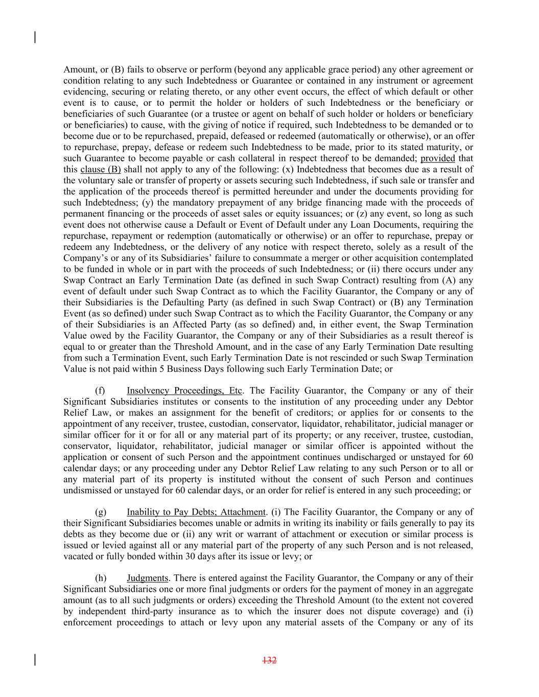 Amount, or (B) fails to observe or perform (beyond any applicable grace period) any other agreement or condition relating to any such Indebtedness or Guarantee or contained in any instrument or agreement evidencing, securing or relating thereto, or any other event occurs, the effect of which default or other event is to cause, or to permit the holder or holders of such Indebtedness or the beneficiary or beneficiaries of such Guarantee (or a trustee or agent on behalf of such holder or holders or beneficiary or beneficiaries) to cause, with the giving of notice if required, such Indebtedness to be demanded or to become due or to be repurchased, prepaid, defeased or redeemed (automatically or otherwise), or an offer to repurchase, prepay, defease or redeem such Indebtedness to be made, prior to its stated maturity, or such Guarantee to become payable or cash collateral in respect thereof to be demanded; provided that this clause (B) shall not apply to any of the following: (x) Indebtedness that becomes due as a result of the voluntary sale or transfer of property or assets securing such Indebtedness, if such sale or transfer and the application of the proceeds thereof is permitted hereunder and under the documents providing for such Indebtedness; (y) the mandatory prepayment of any bridge financing made with the proceeds of permanent financing or the proceeds of asset sales or equity issuances; or (z) any event, so long as such event does not otherwise cause a Default or Event of Default under any Loan Documents, requiring the repurchase, repayment or redemption (automatically or otherwise) or an offer to repurchase, prepay or redeem any Indebtedness, or the delivery of any notice with respect thereto, solely as a result of the Company’s or any of its Subsidiaries’ failure to consummate a merger or other acquisition contemplated to be funded in whole or in part with the proceeds of such Indebtedness; or (ii) there occurs under any Swap Contract an Early Termination Date (as defined in such Swap Contract) resulting from (A) any event of default under such Swap Contract as to which the Facility Guarantor, the Company or any of their Subsidiaries is the Defaulting Party (as defined in such Swap Contract) or (B) any Termination Event (as so defined) under such Swap Contract as to which the Facility Guarantor, the Company or any of their Subsidiaries is an Affected Party (as so defined) and, in either event, the Swap Termination Value owed by the Facility Guarantor, the Company or any of their Subsidiaries as a result thereof is equal to or greater than the Threshold Amount, and in the case of any Early Termination Date resulting from such a Termination Event, such Early Termination Date is not rescinded or such Swap Termination Value is not paid within 5 Business Days following such Early Termination Date; or (f) Insolvency Proceedings, Etc. The Facility Guarantor, the Company or any of their Significant Subsidiaries institutes or consents to the institution of any proceeding under any Debtor Relief Law, or makes an assignment for the benefit of creditors; or applies for or consents to the appointment of any receiver, trustee, custodian, conservator, liquidator, rehabilitator, judicial manager or similar officer for it or for all or any material part of its property; or any receiver, trustee, custodian, conservator, liquidator, rehabilitator, judicial manager or similar officer is appointed without the application or consent of such Person and the appointment continues undischarged or unstayed for 60 calendar days; or any proceeding under any Debtor Relief Law relating to any such Person or to all or any material part of its property is instituted without the consent of such Person and continues undismissed or unstayed for 60 calendar days, or an order for relief is entered in any such proceeding; or (g) Inability to Pay Debts; Attachment. (i) The Facility Guarantor, the Company or any of their Significant Subsidiaries becomes unable or admits in writing its inability or fails generally to pay its debts as they become due or (ii) any writ or warrant of attachment or execution or similar process is issued or levied against all or any material part of the property of any such Person and is not released, vacated or fully bonded within 30 days after its issue or levy; or (h) Judgments. There is entered against the Facility Guarantor, the Company or any of their Significant Subsidiaries one or more final judgments or orders for the payment of money in an aggregate amount (as to all such judgments or orders) exceeding the Threshold Amount (to the extent not covered by independent third-party insurance as to which the insurer does not dispute coverage) and (i) enforcement proceedings to attach or levy upon any material assets of the Company or any of its 132