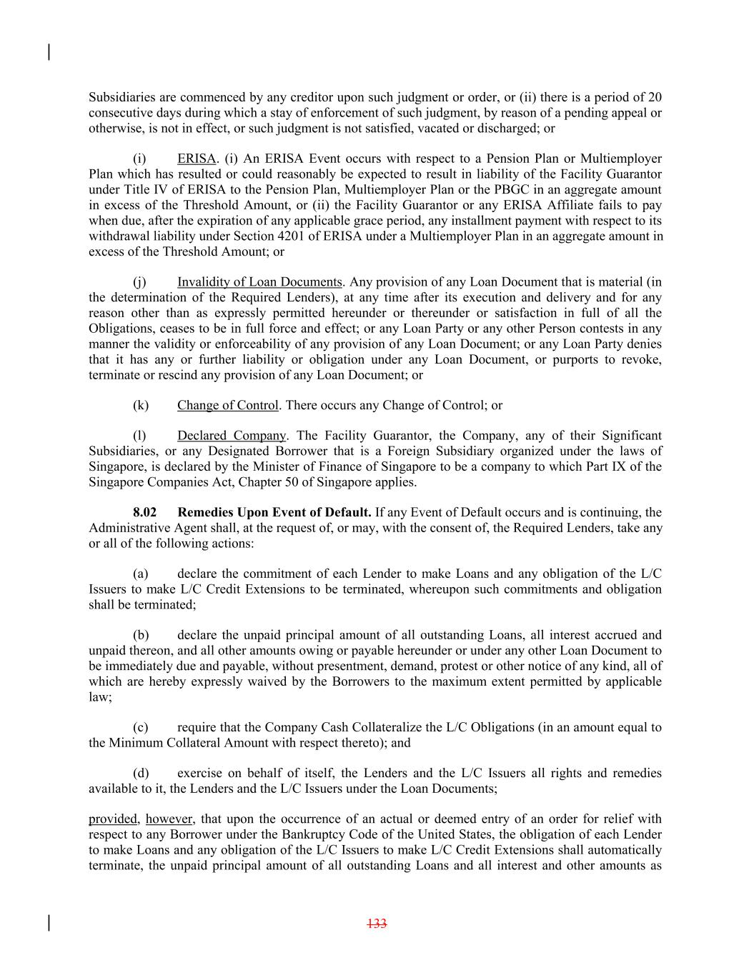 Subsidiaries are commenced by any creditor upon such judgment or order, or (ii) there is a period of 20 consecutive days during which a stay of enforcement of such judgment, by reason of a pending appeal or otherwise, is not in effect, or such judgment is not satisfied, vacated or discharged; or (i) ERISA. (i) An ERISA Event occurs with respect to a Pension Plan or Multiemployer Plan which has resulted or could reasonably be expected to result in liability of the Facility Guarantor under Title IV of ERISA to the Pension Plan, Multiemployer Plan or the PBGC in an aggregate amount in excess of the Threshold Amount, or (ii) the Facility Guarantor or any ERISA Affiliate fails to pay when due, after the expiration of any applicable grace period, any installment payment with respect to its withdrawal liability under Section 4201 of ERISA under a Multiemployer Plan in an aggregate amount in excess of the Threshold Amount; or (j) Invalidity of Loan Documents. Any provision of any Loan Document that is material (in the determination of the Required Lenders), at any time after its execution and delivery and for any reason other than as expressly permitted hereunder or thereunder or satisfaction in full of all the Obligations, ceases to be in full force and effect; or any Loan Party or any other Person contests in any manner the validity or enforceability of any provision of any Loan Document; or any Loan Party denies that it has any or further liability or obligation under any Loan Document, or purports to revoke, terminate or rescind any provision of any Loan Document; or (k) Change of Control. There occurs any Change of Control; or (l) Declared Company. The Facility Guarantor, the Company, any of their Significant Subsidiaries, or any Designated Borrower that is a Foreign Subsidiary organized under the laws of Singapore, is declared by the Minister of Finance of Singapore to be a company to which Part IX of the Singapore Companies Act, Chapter 50 of Singapore applies. 8.02 Remedies Upon Event of Default. If any Event of Default occurs and is continuing, the Administrative Agent shall, at the request of, or may, with the consent of, the Required Lenders, take any or all of the following actions: (a) declare the commitment of each Lender to make Loans and any obligation of the L/C Issuers to make L/C Credit Extensions to be terminated, whereupon such commitments and obligation shall be terminated; (b) declare the unpaid principal amount of all outstanding Loans, all interest accrued and unpaid thereon, and all other amounts owing or payable hereunder or under any other Loan Document to be immediately due and payable, without presentment, demand, protest or other notice of any kind, all of which are hereby expressly waived by the Borrowers to the maximum extent permitted by applicable law; (c) require that the Company Cash Collateralize the L/C Obligations (in an amount equal to the Minimum Collateral Amount with respect thereto); and (d) exercise on behalf of itself, the Lenders and the L/C Issuers all rights and remedies available to it, the Lenders and the L/C Issuers under the Loan Documents; provided, however, that upon the occurrence of an actual or deemed entry of an order for relief with respect to any Borrower under the Bankruptcy Code of the United States, the obligation of each Lender to make Loans and any obligation of the L/C Issuers to make L/C Credit Extensions shall automatically terminate, the unpaid principal amount of all outstanding Loans and all interest and other amounts as 133
