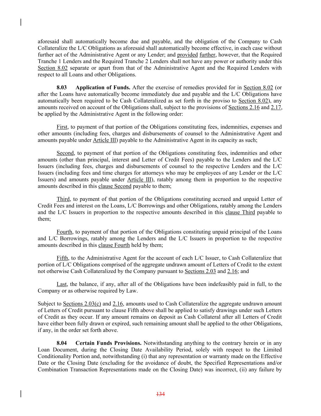 aforesaid shall automatically become due and payable, and the obligation of the Company to Cash Collateralize the L/C Obligations as aforesaid shall automatically become effective, in each case without further act of the Administrative Agent or any Lender; and provided further, however, that the Required Tranche 1 Lenders and the Required Tranche 2 Lenders shall not have any power or authority under this Section 8.02 separate or apart from that of the Administrative Agent and the Required Lenders with respect to all Loans and other Obligations. 8.03 Application of Funds. After the exercise of remedies provided for in Section 8.02 (or after the Loans have automatically become immediately due and payable and the L/C Obligations have automatically been required to be Cash Collateralized as set forth in the proviso to Section 8.02), any amounts received on account of the Obligations shall, subject to the provisions of Sections 2.16 and 2.17, be applied by the Administrative Agent in the following order: First, to payment of that portion of the Obligations constituting fees, indemnities, expenses and other amounts (including fees, charges and disbursements of counsel to the Administrative Agent and amounts payable under Article III) payable to the Administrative Agent in its capacity as such; Second, to payment of that portion of the Obligations constituting fees, indemnities and other amounts (other than principal, interest and Letter of Credit Fees) payable to the Lenders and the L/C Issuers (including fees, charges and disbursements of counsel to the respective Lenders and the L/C Issuers (including fees and time charges for attorneys who may be employees of any Lender or the L/C Issuers) and amounts payable under Article III), ratably among them in proportion to the respective amounts described in this clause Second payable to them; Third, to payment of that portion of the Obligations constituting accrued and unpaid Letter of Credit Fees and interest on the Loans, L/C Borrowings and other Obligations, ratably among the Lenders and the L/C Issuers in proportion to the respective amounts described in this clause Third payable to them; Fourth, to payment of that portion of the Obligations constituting unpaid principal of the Loans and L/C Borrowings, ratably among the Lenders and the L/C Issuers in proportion to the respective amounts described in this clause Fourth held by them; Fifth, to the Administrative Agent for the account of each L/C Issuer, to Cash Collateralize that portion of L/C Obligations comprised of the aggregate undrawn amount of Letters of Credit to the extent not otherwise Cash Collateralized by the Company pursuant to Sections 2.03 and 2.16; and Last, the balance, if any, after all of the Obligations have been indefeasibly paid in full, to the Company or as otherwise required by Law. Subject to Sections 2.03(c) and 2.16, amounts used to Cash Collateralize the aggregate undrawn amount of Letters of Credit pursuant to clause Fifth above shall be applied to satisfy drawings under such Letters of Credit as they occur. If any amount remains on deposit as Cash Collateral after all Letters of Credit have either been fully drawn or expired, such remaining amount shall be applied to the other Obligations, if any, in the order set forth above. 8.04 Certain Funds Provisions. Notwithstanding anything to the contrary herein or in any Loan Document, during the Closing Date Availability Period, solely with respect to the Limited Conditionality Portion and, notwithstanding (i) that any representation or warranty made on the Effective Date or the Closing Date (excluding for the avoidance of doubt, the Specified Representations and/or Combination Transaction Representations made on the Closing Date) was incorrect, (ii) any failure by 134