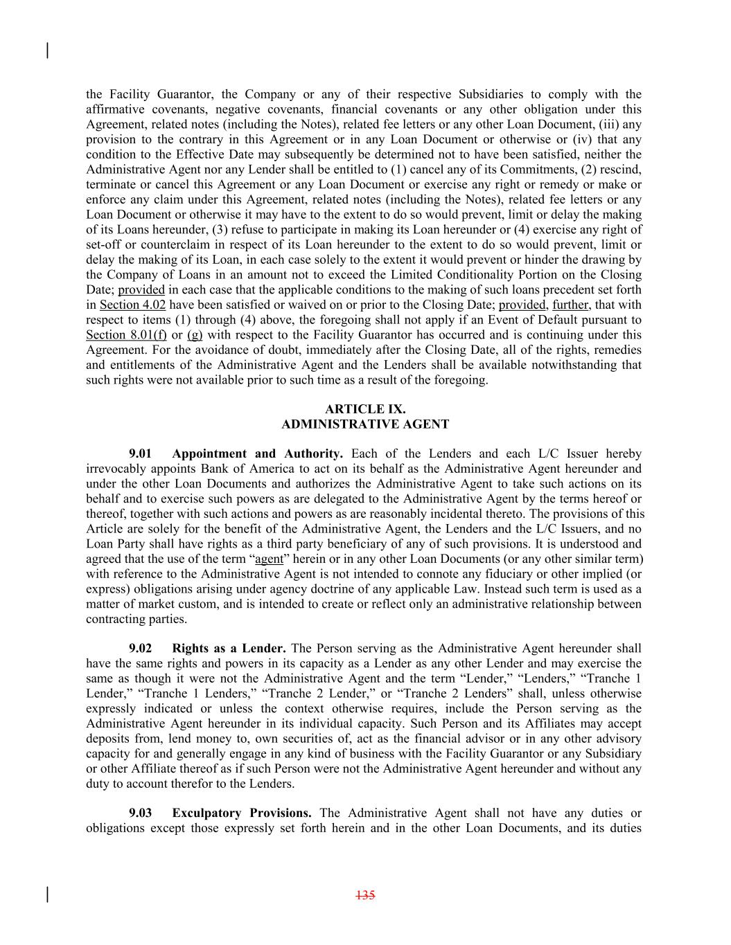 the Facility Guarantor, the Company or any of their respective Subsidiaries to comply with the affirmative covenants, negative covenants, financial covenants or any other obligation under this Agreement, related notes (including the Notes), related fee letters or any other Loan Document, (iii) any provision to the contrary in this Agreement or in any Loan Document or otherwise or (iv) that any condition to the Effective Date may subsequently be determined not to have been satisfied, neither the Administrative Agent nor any Lender shall be entitled to (1) cancel any of its Commitments, (2) rescind, terminate or cancel this Agreement or any Loan Document or exercise any right or remedy or make or enforce any claim under this Agreement, related notes (including the Notes), related fee letters or any Loan Document or otherwise it may have to the extent to do so would prevent, limit or delay the making of its Loans hereunder, (3) refuse to participate in making its Loan hereunder or (4) exercise any right of set-off or counterclaim in respect of its Loan hereunder to the extent to do so would prevent, limit or delay the making of its Loan, in each case solely to the extent it would prevent or hinder the drawing by the Company of Loans in an amount not to exceed the Limited Conditionality Portion on the Closing Date; provided in each case that the applicable conditions to the making of such loans precedent set forth in Section 4.02 have been satisfied or waived on or prior to the Closing Date; provided, further, that with respect to items (1) through (4) above, the foregoing shall not apply if an Event of Default pursuant to Section 8.01(f) or (g) with respect to the Facility Guarantor has occurred and is continuing under this Agreement. For the avoidance of doubt, immediately after the Closing Date, all of the rights, remedies and entitlements of the Administrative Agent and the Lenders shall be available notwithstanding that such rights were not available prior to such time as a result of the foregoing. ARTICLE IX. ADMINISTRATIVE AGENT 9.01 Appointment and Authority. Each of the Lenders and each L/C Issuer hereby irrevocably appoints Bank of America to act on its behalf as the Administrative Agent hereunder and under the other Loan Documents and authorizes the Administrative Agent to take such actions on its behalf and to exercise such powers as are delegated to the Administrative Agent by the terms hereof or thereof, together with such actions and powers as are reasonably incidental thereto. The provisions of this Article are solely for the benefit of the Administrative Agent, the Lenders and the L/C Issuers, and no Loan Party shall have rights as a third party beneficiary of any of such provisions. It is understood and agreed that the use of the term “agent” herein or in any other Loan Documents (or any other similar term) with reference to the Administrative Agent is not intended to connote any fiduciary or other implied (or express) obligations arising under agency doctrine of any applicable Law. Instead such term is used as a matter of market custom, and is intended to create or reflect only an administrative relationship between contracting parties. 9.02 Rights as a Lender. The Person serving as the Administrative Agent hereunder shall have the same rights and powers in its capacity as a Lender as any other Lender and may exercise the same as though it were not the Administrative Agent and the term “Lender,” “Lenders,” “Tranche 1 Lender,” “Tranche 1 Lenders,” “Tranche 2 Lender,” or “Tranche 2 Lenders” shall, unless otherwise expressly indicated or unless the context otherwise requires, include the Person serving as the Administrative Agent hereunder in its individual capacity. Such Person and its Affiliates may accept deposits from, lend money to, own securities of, act as the financial advisor or in any other advisory capacity for and generally engage in any kind of business with the Facility Guarantor or any Subsidiary or other Affiliate thereof as if such Person were not the Administrative Agent hereunder and without any duty to account therefor to the Lenders. 9.03 Exculpatory Provisions. The Administrative Agent shall not have any duties or obligations except those expressly set forth herein and in the other Loan Documents, and its duties 135