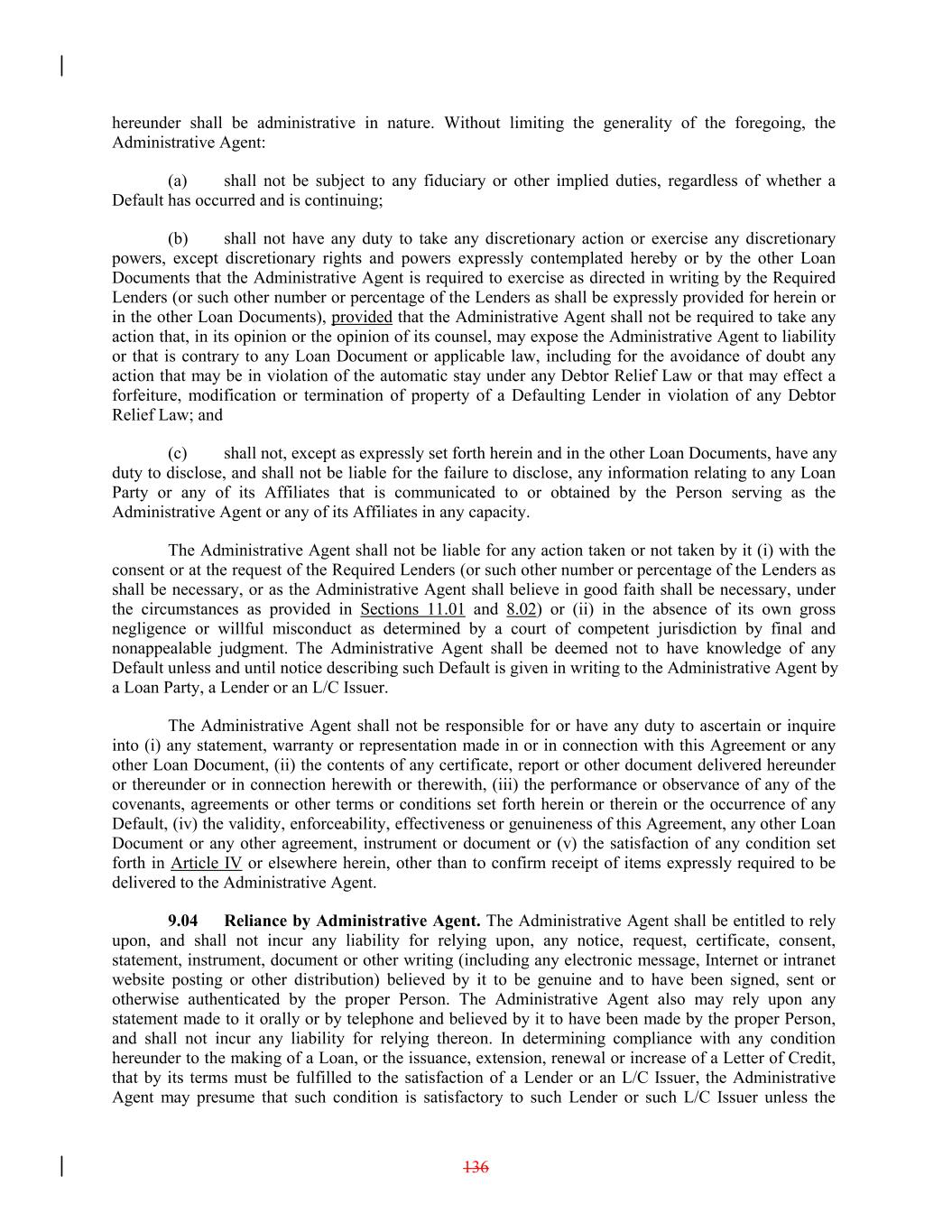 hereunder shall be administrative in nature. Without limiting the generality of the foregoing, the Administrative Agent: (a) shall not be subject to any fiduciary or other implied duties, regardless of whether a Default has occurred and is continuing; (b) shall not have any duty to take any discretionary action or exercise any discretionary powers, except discretionary rights and powers expressly contemplated hereby or by the other Loan Documents that the Administrative Agent is required to exercise as directed in writing by the Required Lenders (or such other number or percentage of the Lenders as shall be expressly provided for herein or in the other Loan Documents), provided that the Administrative Agent shall not be required to take any action that, in its opinion or the opinion of its counsel, may expose the Administrative Agent to liability or that is contrary to any Loan Document or applicable law, including for the avoidance of doubt any action that may be in violation of the automatic stay under any Debtor Relief Law or that may effect a forfeiture, modification or termination of property of a Defaulting Lender in violation of any Debtor Relief Law; and (c) shall not, except as expressly set forth herein and in the other Loan Documents, have any duty to disclose, and shall not be liable for the failure to disclose, any information relating to any Loan Party or any of its Affiliates that is communicated to or obtained by the Person serving as the Administrative Agent or any of its Affiliates in any capacity. The Administrative Agent shall not be liable for any action taken or not taken by it (i) with the consent or at the request of the Required Lenders (or such other number or percentage of the Lenders as shall be necessary, or as the Administrative Agent shall believe in good faith shall be necessary, under the circumstances as provided in Sections 11.01 and 8.02) or (ii) in the absence of its own gross negligence or willful misconduct as determined by a court of competent jurisdiction by final and nonappealable judgment. The Administrative Agent shall be deemed not to have knowledge of any Default unless and until notice describing such Default is given in writing to the Administrative Agent by a Loan Party, a Lender or an L/C Issuer. The Administrative Agent shall not be responsible for or have any duty to ascertain or inquire into (i) any statement, warranty or representation made in or in connection with this Agreement or any other Loan Document, (ii) the contents of any certificate, report or other document delivered hereunder or thereunder or in connection herewith or therewith, (iii) the performance or observance of any of the covenants, agreements or other terms or conditions set forth herein or therein or the occurrence of any Default, (iv) the validity, enforceability, effectiveness or genuineness of this Agreement, any other Loan Document or any other agreement, instrument or document or (v) the satisfaction of any condition set forth in Article IV or elsewhere herein, other than to confirm receipt of items expressly required to be delivered to the Administrative Agent. 9.04 Reliance by Administrative Agent. The Administrative Agent shall be entitled to rely upon, and shall not incur any liability for relying upon, any notice, request, certificate, consent, statement, instrument, document or other writing (including any electronic message, Internet or intranet website posting or other distribution) believed by it to be genuine and to have been signed, sent or otherwise authenticated by the proper Person. The Administrative Agent also may rely upon any statement made to it orally or by telephone and believed by it to have been made by the proper Person, and shall not incur any liability for relying thereon. In determining compliance with any condition hereunder to the making of a Loan, or the issuance, extension, renewal or increase of a Letter of Credit, that by its terms must be fulfilled to the satisfaction of a Lender or an L/C Issuer, the Administrative Agent may presume that such condition is satisfactory to such Lender or such L/C Issuer unless the 136
