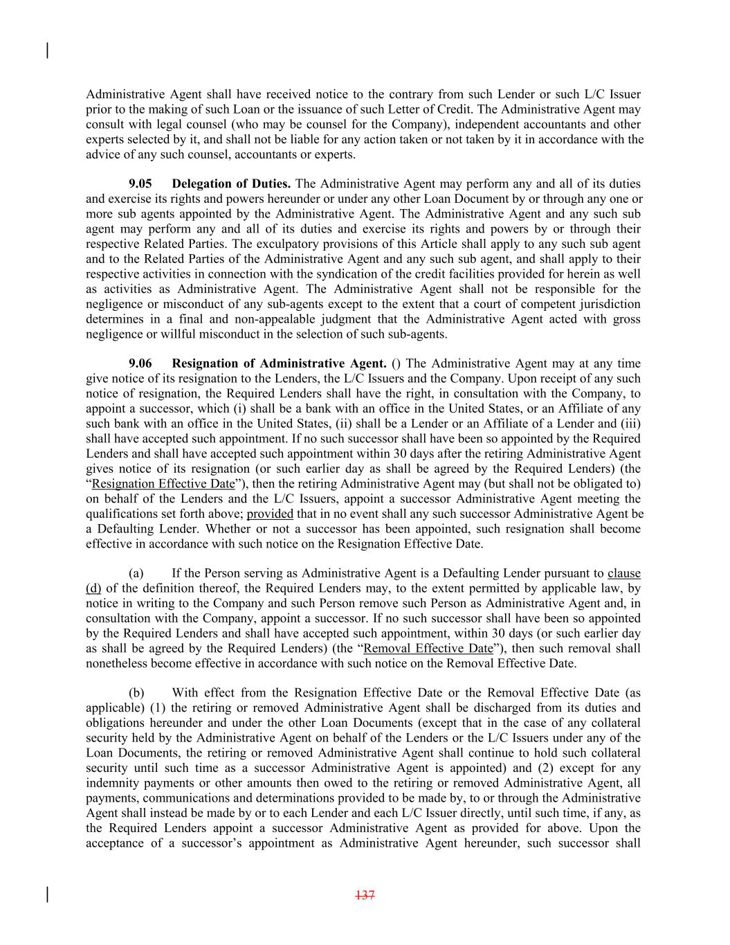 Administrative Agent shall have received notice to the contrary from such Lender or such L/C Issuer prior to the making of such Loan or the issuance of such Letter of Credit. The Administrative Agent may consult with legal counsel (who may be counsel for the Company), independent accountants and other experts selected by it, and shall not be liable for any action taken or not taken by it in accordance with the advice of any such counsel, accountants or experts. 9.05 Delegation of Duties. The Administrative Agent may perform any and all of its duties and exercise its rights and powers hereunder or under any other Loan Document by or through any one or more sub agents appointed by the Administrative Agent. The Administrative Agent and any such sub agent may perform any and all of its duties and exercise its rights and powers by or through their respective Related Parties. The exculpatory provisions of this Article shall apply to any such sub agent and to the Related Parties of the Administrative Agent and any such sub agent, and shall apply to their respective activities in connection with the syndication of the credit facilities provided for herein as well as activities as Administrative Agent. The Administrative Agent shall not be responsible for the negligence or misconduct of any sub-agents except to the extent that a court of competent jurisdiction determines in a final and non-appealable judgment that the Administrative Agent acted with gross negligence or willful misconduct in the selection of such sub-agents. 9.06 Resignation of Administrative Agent. () The Administrative Agent may at any time give notice of its resignation to the Lenders, the L/C Issuers and the Company. Upon receipt of any such notice of resignation, the Required Lenders shall have the right, in consultation with the Company, to appoint a successor, which (i) shall be a bank with an office in the United States, or an Affiliate of any such bank with an office in the United States, (ii) shall be a Lender or an Affiliate of a Lender and (iii) shall have accepted such appointment. If no such successor shall have been so appointed by the Required Lenders and shall have accepted such appointment within 30 days after the retiring Administrative Agent gives notice of its resignation (or such earlier day as shall be agreed by the Required Lenders) (the “Resignation Effective Date”), then the retiring Administrative Agent may (but shall not be obligated to) on behalf of the Lenders and the L/C Issuers, appoint a successor Administrative Agent meeting the qualifications set forth above; provided that in no event shall any such successor Administrative Agent be a Defaulting Lender. Whether or not a successor has been appointed, such resignation shall become effective in accordance with such notice on the Resignation Effective Date. (a) If the Person serving as Administrative Agent is a Defaulting Lender pursuant to clause (d) of the definition thereof, the Required Lenders may, to the extent permitted by applicable law, by notice in writing to the Company and such Person remove such Person as Administrative Agent and, in consultation with the Company, appoint a successor. If no such successor shall have been so appointed by the Required Lenders and shall have accepted such appointment, within 30 days (or such earlier day as shall be agreed by the Required Lenders) (the “Removal Effective Date”), then such removal shall nonetheless become effective in accordance with such notice on the Removal Effective Date. (b) With effect from the Resignation Effective Date or the Removal Effective Date (as applicable) (1) the retiring or removed Administrative Agent shall be discharged from its duties and obligations hereunder and under the other Loan Documents (except that in the case of any collateral security held by the Administrative Agent on behalf of the Lenders or the L/C Issuers under any of the Loan Documents, the retiring or removed Administrative Agent shall continue to hold such collateral security until such time as a successor Administrative Agent is appointed) and (2) except for any indemnity payments or other amounts then owed to the retiring or removed Administrative Agent, all payments, communications and determinations provided to be made by, to or through the Administrative Agent shall instead be made by or to each Lender and each L/C Issuer directly, until such time, if any, as the Required Lenders appoint a successor Administrative Agent as provided for above. Upon the acceptance of a successor’s appointment as Administrative Agent hereunder, such successor shall 137