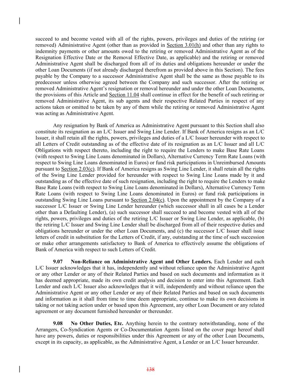 succeed to and become vested with all of the rights, powers, privileges and duties of the retiring (or removed) Administrative Agent (other than as provided in Section 3.01(h) and other than any rights to indemnity payments or other amounts owed to the retiring or removed Administrative Agent as of the Resignation Effective Date or the Removal Effective Date, as applicable) and the retiring or removed Administrative Agent shall be discharged from all of its duties and obligations hereunder or under the other Loan Documents (if not already discharged therefrom as provided above in this Section). The fees payable by the Company to a successor Administrative Agent shall be the same as those payable to its predecessor unless otherwise agreed between the Company and such successor. After the retiring or removed Administrative Agent’s resignation or removal hereunder and under the other Loan Documents, the provisions of this Article and Section 11.04 shall continue in effect for the benefit of such retiring or removed Administrative Agent, its sub agents and their respective Related Parties in respect of any actions taken or omitted to be taken by any of them while the retiring or removed Administrative Agent was acting as Administrative Agent. Any resignation by Bank of America as Administrative Agent pursuant to this Section shall also constitute its resignation as an L/C Issuer and Swing Line Lender. If Bank of America resigns as an L/C Issuer, it shall retain all the rights, powers, privileges and duties of a L/C Issuer hereunder with respect to all Letters of Credit outstanding as of the effective date of its resignation as an L/C Issuer and all L/C Obligations with respect thereto, including the right to require the Lenders to make Base Rate Loans (with respect to Swing Line Loans denominated in Dollars), Alternative Currency Term Rate Loans (with respect to Swing Line Loans denominated in Euros) or fund risk participations in Unreimbursed Amounts pursuant to Section 2.03(c). If Bank of America resigns as Swing Line Lender, it shall retain all the rights of the Swing Line Lender provided for hereunder with respect to Swing Line Loans made by it and outstanding as of the effective date of such resignation, including the right to require the Lenders to make Base Rate Loans (with respect to Swing Line Loans denominated in Dollars), Alternative Currency Term Rate Loans (with respect to Swing Line Loans denominated in Euros) or fund risk participations in outstanding Swing Line Loans pursuant to Section 2.04(c). Upon the appointment by the Company of a successor L/C Issuer or Swing Line Lender hereunder (which successor shall in all cases be a Lender other than a Defaulting Lender), (a) such successor shall succeed to and become vested with all of the rights, powers, privileges and duties of the retiring L/C Issuer or Swing Line Lender, as applicable, (b) the retiring L/C Issuer and Swing Line Lender shall be discharged from all of their respective duties and obligations hereunder or under the other Loan Documents, and (c) the successor L/C Issuer shall issue letters of credit in substitution for the Letters of Credit, if any, outstanding at the time of such succession or make other arrangements satisfactory to Bank of America to effectively assume the obligations of Bank of America with respect to such Letters of Credit. 9.07 Non-Reliance on Administrative Agent and Other Lenders. Each Lender and each L/C Issuer acknowledges that it has, independently and without reliance upon the Administrative Agent or any other Lender or any of their Related Parties and based on such documents and information as it has deemed appropriate, made its own credit analysis and decision to enter into this Agreement. Each Lender and each L/C Issuer also acknowledges that it will, independently and without reliance upon the Administrative Agent or any other Lender or any of their Related Parties and based on such documents and information as it shall from time to time deem appropriate, continue to make its own decisions in taking or not taking action under or based upon this Agreement, any other Loan Document or any related agreement or any document furnished hereunder or thereunder. 9.08 No Other Duties, Etc. Anything herein to the contrary notwithstanding, none of the Arrangers, Co-Syndication Agents or Co-Documentation Agents listed on the cover page hereof shall have any powers, duties or responsibilities under this Agreement or any of the other Loan Documents, except in its capacity, as applicable, as the Administrative Agent, a Lender or an L/C Issuer hereunder. 138