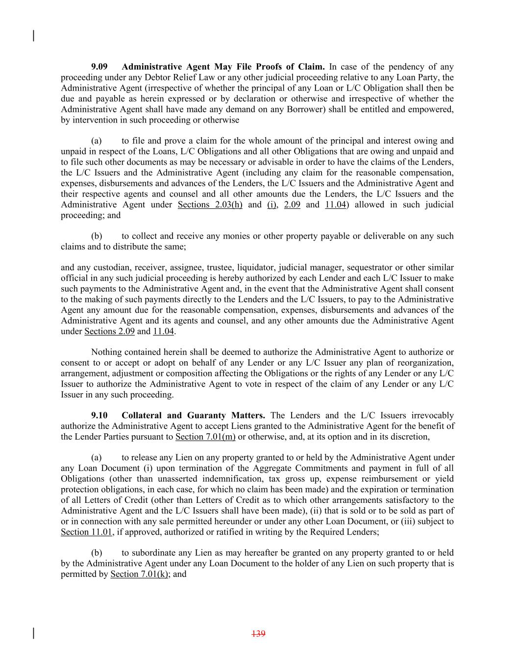 9.09 Administrative Agent May File Proofs of Claim. In case of the pendency of any proceeding under any Debtor Relief Law or any other judicial proceeding relative to any Loan Party, the Administrative Agent (irrespective of whether the principal of any Loan or L/C Obligation shall then be due and payable as herein expressed or by declaration or otherwise and irrespective of whether the Administrative Agent shall have made any demand on any Borrower) shall be entitled and empowered, by intervention in such proceeding or otherwise (a) to file and prove a claim for the whole amount of the principal and interest owing and unpaid in respect of the Loans, L/C Obligations and all other Obligations that are owing and unpaid and to file such other documents as may be necessary or advisable in order to have the claims of the Lenders, the L/C Issuers and the Administrative Agent (including any claim for the reasonable compensation, expenses, disbursements and advances of the Lenders, the L/C Issuers and the Administrative Agent and their respective agents and counsel and all other amounts due the Lenders, the L/C Issuers and the Administrative Agent under Sections 2.03(h) and (i), 2.09 and 11.04) allowed in such judicial proceeding; and (b) to collect and receive any monies or other property payable or deliverable on any such claims and to distribute the same; and any custodian, receiver, assignee, trustee, liquidator, judicial manager, sequestrator or other similar official in any such judicial proceeding is hereby authorized by each Lender and each L/C Issuer to make such payments to the Administrative Agent and, in the event that the Administrative Agent shall consent to the making of such payments directly to the Lenders and the L/C Issuers, to pay to the Administrative Agent any amount due for the reasonable compensation, expenses, disbursements and advances of the Administrative Agent and its agents and counsel, and any other amounts due the Administrative Agent under Sections 2.09 and 11.04. Nothing contained herein shall be deemed to authorize the Administrative Agent to authorize or consent to or accept or adopt on behalf of any Lender or any L/C Issuer any plan of reorganization, arrangement, adjustment or composition affecting the Obligations or the rights of any Lender or any L/C Issuer to authorize the Administrative Agent to vote in respect of the claim of any Lender or any L/C Issuer in any such proceeding. 9.10 Collateral and Guaranty Matters. The Lenders and the L/C Issuers irrevocably authorize the Administrative Agent to accept Liens granted to the Administrative Agent for the benefit of the Lender Parties pursuant to Section 7.01(m) or otherwise, and, at its option and in its discretion, (a) to release any Lien on any property granted to or held by the Administrative Agent under any Loan Document (i) upon termination of the Aggregate Commitments and payment in full of all Obligations (other than unasserted indemnification, tax gross up, expense reimbursement or yield protection obligations, in each case, for which no claim has been made) and the expiration or termination of all Letters of Credit (other than Letters of Credit as to which other arrangements satisfactory to the Administrative Agent and the L/C Issuers shall have been made), (ii) that is sold or to be sold as part of or in connection with any sale permitted hereunder or under any other Loan Document, or (iii) subject to Section 11.01, if approved, authorized or ratified in writing by the Required Lenders; (b) to subordinate any Lien as may hereafter be granted on any property granted to or held by the Administrative Agent under any Loan Document to the holder of any Lien on such property that is permitted by Section 7.01(k); and 139