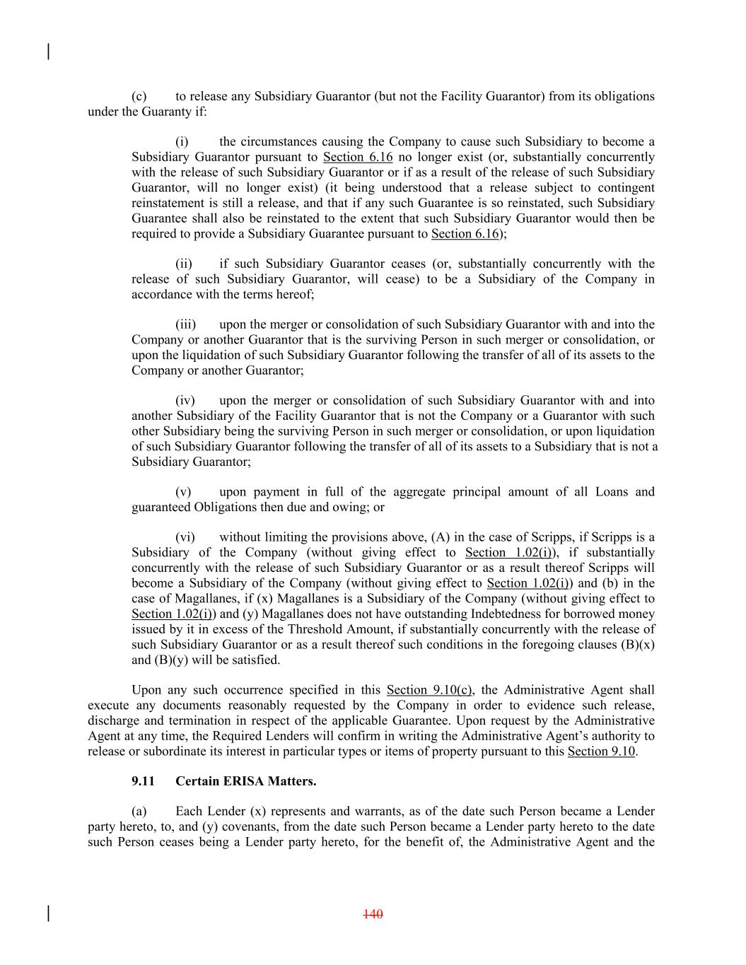 (c) to release any Subsidiary Guarantor (but not the Facility Guarantor) from its obligations under the Guaranty if: (i) the circumstances causing the Company to cause such Subsidiary to become a Subsidiary Guarantor pursuant to Section 6.16 no longer exist (or, substantially concurrently with the release of such Subsidiary Guarantor or if as a result of the release of such Subsidiary Guarantor, will no longer exist) (it being understood that a release subject to contingent reinstatement is still a release, and that if any such Guarantee is so reinstated, such Subsidiary Guarantee shall also be reinstated to the extent that such Subsidiary Guarantor would then be required to provide a Subsidiary Guarantee pursuant to Section 6.16); (ii) if such Subsidiary Guarantor ceases (or, substantially concurrently with the release of such Subsidiary Guarantor, will cease) to be a Subsidiary of the Company in accordance with the terms hereof; (iii) upon the merger or consolidation of such Subsidiary Guarantor with and into the Company or another Guarantor that is the surviving Person in such merger or consolidation, or upon the liquidation of such Subsidiary Guarantor following the transfer of all of its assets to the Company or another Guarantor; (iv) upon the merger or consolidation of such Subsidiary Guarantor with and into another Subsidiary of the Facility Guarantor that is not the Company or a Guarantor with such other Subsidiary being the surviving Person in such merger or consolidation, or upon liquidation of such Subsidiary Guarantor following the transfer of all of its assets to a Subsidiary that is not a Subsidiary Guarantor; (v) upon payment in full of the aggregate principal amount of all Loans and guaranteed Obligations then due and owing; or (vi) without limiting the provisions above, (A) in the case of Scripps, if Scripps is a Subsidiary of the Company (without giving effect to Section 1.02(i)), if substantially concurrently with the release of such Subsidiary Guarantor or as a result thereof Scripps will become a Subsidiary of the Company (without giving effect to Section 1.02(i)) and (b) in the case of Magallanes, if (x) Magallanes is a Subsidiary of the Company (without giving effect to Section 1.02(i)) and (y) Magallanes does not have outstanding Indebtedness for borrowed money issued by it in excess of the Threshold Amount, if substantially concurrently with the release of such Subsidiary Guarantor or as a result thereof such conditions in the foregoing clauses (B)(x) and (B)(y) will be satisfied. Upon any such occurrence specified in this Section 9.10(c), the Administrative Agent shall execute any documents reasonably requested by the Company in order to evidence such release, discharge and termination in respect of the applicable Guarantee. Upon request by the Administrative Agent at any time, the Required Lenders will confirm in writing the Administrative Agent’s authority to release or subordinate its interest in particular types or items of property pursuant to this Section 9.10. 9.11 Certain ERISA Matters. (a) Each Lender (x) represents and warrants, as of the date such Person became a Lender party hereto, to, and (y) covenants, from the date such Person became a Lender party hereto to the date such Person ceases being a Lender party hereto, for the benefit of, the Administrative Agent and the 140