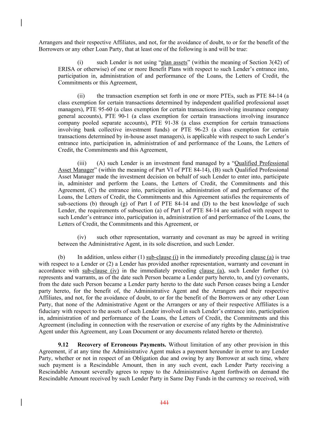 Arrangers and their respective Affiliates, and not, for the avoidance of doubt, to or for the benefit of the Borrowers or any other Loan Party, that at least one of the following is and will be true: (i) such Lender is not using “plan assets” (within the meaning of Section 3(42) of ERISA or otherwise) of one or more Benefit Plans with respect to such Lender’s entrance into, participation in, administration of and performance of the Loans, the Letters of Credit, the Commitments or this Agreement, (ii) the transaction exemption set forth in one or more PTEs, such as PTE 84-14 (a class exemption for certain transactions determined by independent qualified professional asset managers), PTE 95-60 (a class exemption for certain transactions involving insurance company general accounts), PTE 90-1 (a class exemption for certain transactions involving insurance company pooled separate accounts), PTE 91-38 (a class exemption for certain transactions involving bank collective investment funds) or PTE 96-23 (a class exemption for certain transactions determined by in-house asset managers), is applicable with respect to such Lender’s entrance into, participation in, administration of and performance of the Loans, the Letters of Credit, the Commitments and this Agreement, (iii) (A) such Lender is an investment fund managed by a “Qualified Professional Asset Manager” (within the meaning of Part VI of PTE 84-14), (B) such Qualified Professional Asset Manager made the investment decision on behalf of such Lender to enter into, participate in, administer and perform the Loans, the Letters of Credit, the Commitments and this Agreement, (C) the entrance into, participation in, administration of and performance of the Loans, the Letters of Credit, the Commitments and this Agreement satisfies the requirements of sub-sections (b) through (g) of Part I of PTE 84-14 and (D) to the best knowledge of such Lender, the requirements of subsection (a) of Part I of PTE 84-14 are satisfied with respect to such Lender’s entrance into, participation in, administration of and performance of the Loans, the Letters of Credit, the Commitments and this Agreement, or (iv) such other representation, warranty and covenant as may be agreed in writing between the Administrative Agent, in its sole discretion, and such Lender. (b) In addition, unless either (1) sub-clause (i) in the immediately preceding clause (a) is true with respect to a Lender or (2) a Lender has provided another representation, warranty and covenant in accordance with sub-clause (iv) in the immediately preceding clause (a), such Lender further (x) represents and warrants, as of the date such Person became a Lender party hereto, to, and (y) covenants, from the date such Person became a Lender party hereto to the date such Person ceases being a Lender party hereto, for the benefit of, the Administrative Agent and the Arrangers and their respective Affiliates, and not, for the avoidance of doubt, to or for the benefit of the Borrowers or any other Loan Party, that none of the Administrative Agent or the Arrangers or any of their respective Affiliates is a fiduciary with respect to the assets of such Lender involved in such Lender’s entrance into, participation in, administration of and performance of the Loans, the Letters of Credit, the Commitments and this Agreement (including in connection with the reservation or exercise of any rights by the Administrative Agent under this Agreement, any Loan Document or any documents related hereto or thereto). 9.12 Recovery of Erroneous Payments. Without limitation of any other provision in this Agreement, if at any time the Administrative Agent makes a payment hereunder in error to any Lender Party, whether or not in respect of an Obligation due and owing by any Borrower at such time, where such payment is a Rescindable Amount, then in any such event, each Lender Party receiving a Rescindable Amount severally agrees to repay to the Administrative Agent forthwith on demand the Rescindable Amount received by such Lender Party in Same Day Funds in the currency so received, with 141
