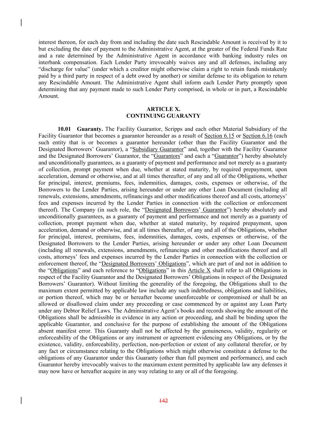 interest thereon, for each day from and including the date such Rescindable Amount is received by it to but excluding the date of payment to the Administrative Agent, at the greater of the Federal Funds Rate and a rate determined by the Administrative Agent in accordance with banking industry rules on interbank compensation. Each Lender Party irrevocably waives any and all defenses, including any “discharge for value” (under which a creditor might otherwise claim a right to retain funds mistakenly paid by a third party in respect of a debt owed by another) or similar defense to its obligation to return any Rescindable Amount. The Administrative Agent shall inform each Lender Party promptly upon determining that any payment made to such Lender Party comprised, in whole or in part, a Rescindable Amount. ARTICLE X. CONTINUING GUARANTY 10.01 Guaranty. The Facility Guarantor, Scripps and each other Material Subsidiary of the Facility Guarantor that becomes a guarantor hereunder as a result of Section 6.15 or Section 6.16 (each such entity that is or becomes a guarantor hereunder (other than the Facility Guarantor and the Designated Borrowers’ Guarantor), a “Subsidiary Guarantor” and, together with the Facility Guarantor and the Designated Borrowers’ Guarantor, the “Guarantors” and each a “Guarantor”) hereby absolutely and unconditionally guarantees, as a guaranty of payment and performance and not merely as a guaranty of collection, prompt payment when due, whether at stated maturity, by required prepayment, upon acceleration, demand or otherwise, and at all times thereafter, of any and all of the Obligations, whether for principal, interest, premiums, fees, indemnities, damages, costs, expenses or otherwise, of the Borrowers to the Lender Parties, arising hereunder or under any other Loan Document (including all renewals, extensions, amendments, refinancings and other modifications thereof and all costs, attorneys’ fees and expenses incurred by the Lender Parties in connection with the collection or enforcement thereof). The Company (in such role, the “Designated Borrowers’ Guarantor”) hereby absolutely and unconditionally guarantees, as a guaranty of payment and performance and not merely as a guaranty of collection, prompt payment when due, whether at stated maturity, by required prepayment, upon acceleration, demand or otherwise, and at all times thereafter, of any and all of the Obligations, whether for principal, interest, premiums, fees, indemnities, damages, costs, expenses or otherwise, of the Designated Borrowers to the Lender Parties, arising hereunder or under any other Loan Document (including all renewals, extensions, amendments, refinancings and other modifications thereof and all costs, attorneys’ fees and expenses incurred by the Lender Parties in connection with the collection or enforcement thereof, the “Designated Borrowers’ Obligations”, which are part of and not in addition to the “Obligations” and each reference to “Obligations” in this Article X shall refer to all Obligations in respect of the Facility Guarantor and the Designated Borrowers’ Obligations in respect of the Designated Borrowers’ Guarantor). Without limiting the generality of the foregoing, the Obligations shall to the maximum extent permitted by applicable law include any such indebtedness, obligations and liabilities, or portion thereof, which may be or hereafter become unenforceable or compromised or shall be an allowed or disallowed claim under any proceeding or case commenced by or against any Loan Party under any Debtor Relief Laws. The Administrative Agent’s books and records showing the amount of the Obligations shall be admissible in evidence in any action or proceeding, and shall be binding upon the applicable Guarantor, and conclusive for the purpose of establishing the amount of the Obligations absent manifest error. This Guaranty shall not be affected by the genuineness, validity, regularity or enforceability of the Obligations or any instrument or agreement evidencing any Obligations, or by the existence, validity, enforceability, perfection, non-perfection or extent of any collateral therefor, or by any fact or circumstance relating to the Obligations which might otherwise constitute a defense to the obligations of any Guarantor under this Guaranty (other than full payment and performance), and each Guarantor hereby irrevocably waives to the maximum extent permitted by applicable law any defenses it may now have or hereafter acquire in any way relating to any or all of the foregoing. 142