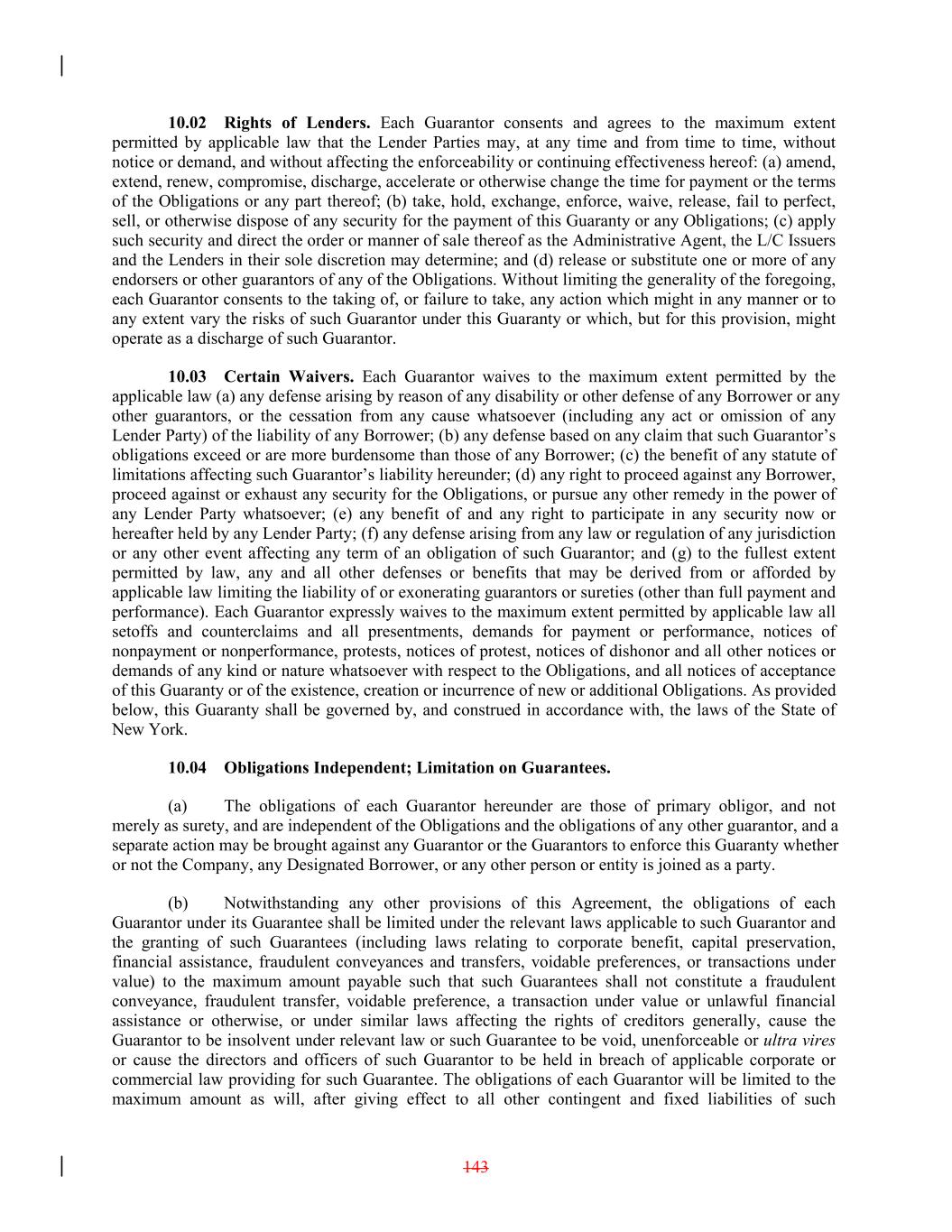 10.02 Rights of Lenders. Each Guarantor consents and agrees to the maximum extent permitted by applicable law that the Lender Parties may, at any time and from time to time, without notice or demand, and without affecting the enforceability or continuing effectiveness hereof: (a) amend, extend, renew, compromise, discharge, accelerate or otherwise change the time for payment or the terms of the Obligations or any part thereof; (b) take, hold, exchange, enforce, waive, release, fail to perfect, sell, or otherwise dispose of any security for the payment of this Guaranty or any Obligations; (c) apply such security and direct the order or manner of sale thereof as the Administrative Agent, the L/C Issuers and the Lenders in their sole discretion may determine; and (d) release or substitute one or more of any endorsers or other guarantors of any of the Obligations. Without limiting the generality of the foregoing, each Guarantor consents to the taking of, or failure to take, any action which might in any manner or to any extent vary the risks of such Guarantor under this Guaranty or which, but for this provision, might operate as a discharge of such Guarantor. 10.03 Certain Waivers. Each Guarantor waives to the maximum extent permitted by the applicable law (a) any defense arising by reason of any disability or other defense of any Borrower or any other guarantors, or the cessation from any cause whatsoever (including any act or omission of any Lender Party) of the liability of any Borrower; (b) any defense based on any claim that such Guarantor’s obligations exceed or are more burdensome than those of any Borrower; (c) the benefit of any statute of limitations affecting such Guarantor’s liability hereunder; (d) any right to proceed against any Borrower, proceed against or exhaust any security for the Obligations, or pursue any other remedy in the power of any Lender Party whatsoever; (e) any benefit of and any right to participate in any security now or hereafter held by any Lender Party; (f) any defense arising from any law or regulation of any jurisdiction or any other event affecting any term of an obligation of such Guarantor; and (g) to the fullest extent permitted by law, any and all other defenses or benefits that may be derived from or afforded by applicable law limiting the liability of or exonerating guarantors or sureties (other than full payment and performance). Each Guarantor expressly waives to the maximum extent permitted by applicable law all setoffs and counterclaims and all presentments, demands for payment or performance, notices of nonpayment or nonperformance, protests, notices of protest, notices of dishonor and all other notices or demands of any kind or nature whatsoever with respect to the Obligations, and all notices of acceptance of this Guaranty or of the existence, creation or incurrence of new or additional Obligations. As provided below, this Guaranty shall be governed by, and construed in accordance with, the laws of the State of New York. 10.04 Obligations Independent; Limitation on Guarantees. (a) The obligations of each Guarantor hereunder are those of primary obligor, and not merely as surety, and are independent of the Obligations and the obligations of any other guarantor, and a separate action may be brought against any Guarantor or the Guarantors to enforce this Guaranty whether or not the Company, any Designated Borrower, or any other person or entity is joined as a party. (b) Notwithstanding any other provisions of this Agreement, the obligations of each Guarantor under its Guarantee shall be limited under the relevant laws applicable to such Guarantor and the granting of such Guarantees (including laws relating to corporate benefit, capital preservation, financial assistance, fraudulent conveyances and transfers, voidable preferences, or transactions under value) to the maximum amount payable such that such Guarantees shall not constitute a fraudulent conveyance, fraudulent transfer, voidable preference, a transaction under value or unlawful financial assistance or otherwise, or under similar laws affecting the rights of creditors generally, cause the Guarantor to be insolvent under relevant law or such Guarantee to be void, unenforceable or ultra vires or cause the directors and officers of such Guarantor to be held in breach of applicable corporate or commercial law providing for such Guarantee. The obligations of each Guarantor will be limited to the maximum amount as will, after giving effect to all other contingent and fixed liabilities of such 143
