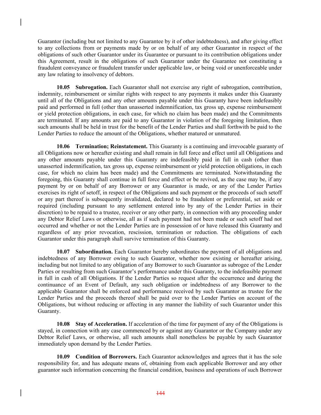 Guarantor (including but not limited to any Guarantee by it of other indebtedness), and after giving effect to any collections from or payments made by or on behalf of any other Guarantor in respect of the obligations of such other Guarantor under its Guarantee or pursuant to its contribution obligations under this Agreement, result in the obligations of such Guarantor under the Guarantee not constituting a fraudulent conveyance or fraudulent transfer under applicable law, or being void or unenforceable under any law relating to insolvency of debtors. 10.05 Subrogation. Each Guarantor shall not exercise any right of subrogation, contribution, indemnity, reimbursement or similar rights with respect to any payments it makes under this Guaranty until all of the Obligations and any other amounts payable under this Guaranty have been indefeasibly paid and performed in full (other than unasserted indemnification, tax gross up, expense reimbursement or yield protection obligations, in each case, for which no claim has been made) and the Commitments are terminated. If any amounts are paid to any Guarantor in violation of the foregoing limitation, then such amounts shall be held in trust for the benefit of the Lender Parties and shall forthwith be paid to the Lender Parties to reduce the amount of the Obligations, whether matured or unmatured. 10.06 Termination; Reinstatement. This Guaranty is a continuing and irrevocable guaranty of all Obligations now or hereafter existing and shall remain in full force and effect until all Obligations and any other amounts payable under this Guaranty are indefeasibly paid in full in cash (other than unasserted indemnification, tax gross up, expense reimbursement or yield protection obligations, in each case, for which no claim has been made) and the Commitments are terminated. Notwithstanding the foregoing, this Guaranty shall continue in full force and effect or be revived, as the case may be, if any payment by or on behalf of any Borrower or any Guarantor is made, or any of the Lender Parties exercises its right of setoff, in respect of the Obligations and such payment or the proceeds of such setoff or any part thereof is subsequently invalidated, declared to be fraudulent or preferential, set aside or required (including pursuant to any settlement entered into by any of the Lender Parties in their discretion) to be repaid to a trustee, receiver or any other party, in connection with any proceeding under any Debtor Relief Laws or otherwise, all as if such payment had not been made or such setoff had not occurred and whether or not the Lender Parties are in possession of or have released this Guaranty and regardless of any prior revocation, rescission, termination or reduction. The obligations of each Guarantor under this paragraph shall survive termination of this Guaranty. 10.07 Subordination. Each Guarantor hereby subordinates the payment of all obligations and indebtedness of any Borrower owing to such Guarantor, whether now existing or hereafter arising, including but not limited to any obligation of any Borrower to such Guarantor as subrogee of the Lender Parties or resulting from such Guarantor’s performance under this Guaranty, to the indefeasible payment in full in cash of all Obligations. If the Lender Parties so request after the occurrence and during the continuance of an Event of Default, any such obligation or indebtedness of any Borrower to the applicable Guarantor shall be enforced and performance received by such Guarantor as trustee for the Lender Parties and the proceeds thereof shall be paid over to the Lender Parties on account of the Obligations, but without reducing or affecting in any manner the liability of such Guarantor under this Guaranty. 10.08 Stay of Acceleration. If acceleration of the time for payment of any of the Obligations is stayed, in connection with any case commenced by or against any Guarantor or the Company under any Debtor Relief Laws, or otherwise, all such amounts shall nonetheless be payable by such Guarantor immediately upon demand by the Lender Parties. 10.09 Condition of Borrowers. Each Guarantor acknowledges and agrees that it has the sole responsibility for, and has adequate means of, obtaining from each applicable Borrower and any other guarantor such information concerning the financial condition, business and operations of such Borrower 144
