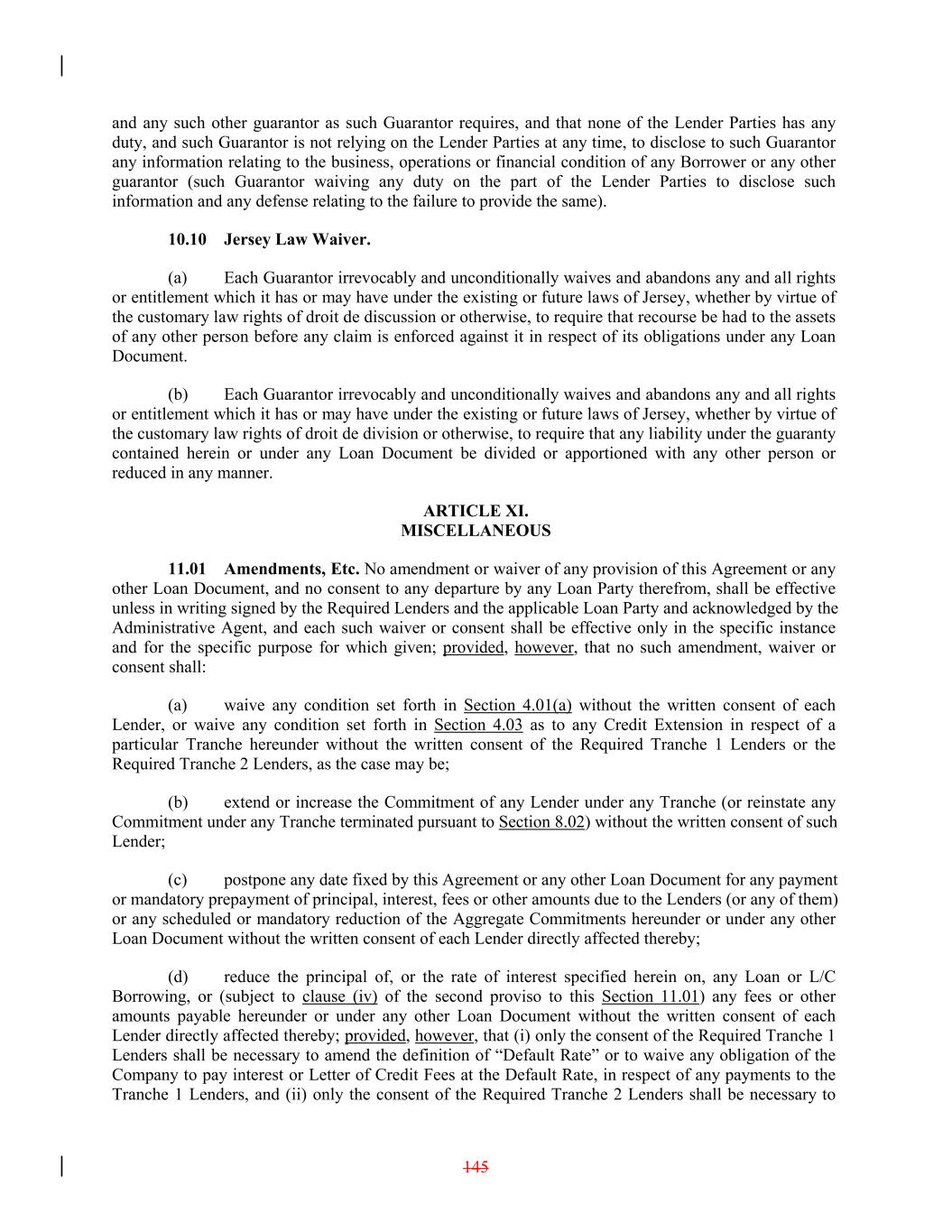 and any such other guarantor as such Guarantor requires, and that none of the Lender Parties has any duty, and such Guarantor is not relying on the Lender Parties at any time, to disclose to such Guarantor any information relating to the business, operations or financial condition of any Borrower or any other guarantor (such Guarantor waiving any duty on the part of the Lender Parties to disclose such information and any defense relating to the failure to provide the same). 10.10 Jersey Law Waiver. (a) Each Guarantor irrevocably and unconditionally waives and abandons any and all rights or entitlement which it has or may have under the existing or future laws of Jersey, whether by virtue of the customary law rights of droit de discussion or otherwise, to require that recourse be had to the assets of any other person before any claim is enforced against it in respect of its obligations under any Loan Document. (b) Each Guarantor irrevocably and unconditionally waives and abandons any and all rights or entitlement which it has or may have under the existing or future laws of Jersey, whether by virtue of the customary law rights of droit de division or otherwise, to require that any liability under the guaranty contained herein or under any Loan Document be divided or apportioned with any other person or reduced in any manner. ARTICLE XI. MISCELLANEOUS 11.01 Amendments, Etc. No amendment or waiver of any provision of this Agreement or any other Loan Document, and no consent to any departure by any Loan Party therefrom, shall be effective unless in writing signed by the Required Lenders and the applicable Loan Party and acknowledged by the Administrative Agent, and each such waiver or consent shall be effective only in the specific instance and for the specific purpose for which given; provided, however, that no such amendment, waiver or consent shall: (a) waive any condition set forth in Section 4.01(a) without the written consent of each Lender, or waive any condition set forth in Section 4.03 as to any Credit Extension in respect of a particular Tranche hereunder without the written consent of the Required Tranche 1 Lenders or the Required Tranche 2 Lenders, as the case may be; (b) extend or increase the Commitment of any Lender under any Tranche (or reinstate any Commitment under any Tranche terminated pursuant to Section 8.02) without the written consent of such Lender; (c) postpone any date fixed by this Agreement or any other Loan Document for any payment or mandatory prepayment of principal, interest, fees or other amounts due to the Lenders (or any of them) or any scheduled or mandatory reduction of the Aggregate Commitments hereunder or under any other Loan Document without the written consent of each Lender directly affected thereby; (d) reduce the principal of, or the rate of interest specified herein on, any Loan or L/C Borrowing, or (subject to clause (iv) of the second proviso to this Section 11.01) any fees or other amounts payable hereunder or under any other Loan Document without the written consent of each Lender directly affected thereby; provided, however, that (i) only the consent of the Required Tranche 1 Lenders shall be necessary to amend the definition of “Default Rate” or to waive any obligation of the Company to pay interest or Letter of Credit Fees at the Default Rate, in respect of any payments to the Tranche 1 Lenders, and (ii) only the consent of the Required Tranche 2 Lenders shall be necessary to 145