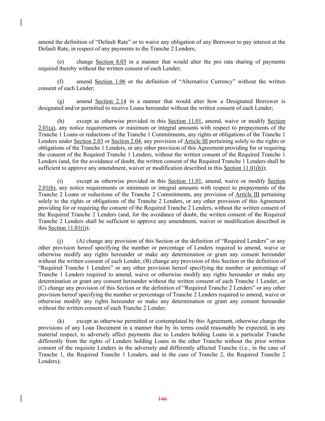 amend the definition of “Default Rate” or to waive any obligation of any Borrower to pay interest at the Default Rate, in respect of any payments to the Tranche 2 Lenders; (e) change Section 8.03 in a manner that would alter the pro rata sharing of payments required thereby without the written consent of each Lender; (f) amend Section 1.06 or the definition of “Alternative Currency” without the written consent of each Lender; (g) amend Section 2.14 in a manner that would alter how a Designated Borrower is designated and/or permitted to receive Loans hereunder without the written consent of each Lender; (h) except as otherwise provided in this Section 11.01, amend, waive or modify Section 2.01(a), any notice requirements or minimum or integral amounts with respect to prepayments of the Tranche 1 Loans or reductions of the Tranche 1 Commitments, any rights or obligations of the Tranche 1 Lenders under Section 2.03 or Section 2.04, any provision of Article III pertaining solely to the rights or obligations of the Tranche 1 Lenders, or any other provision of this Agreement providing for or requiring the consent of the Required Tranche 1 Lenders, without the written consent of the Required Tranche 1 Lenders (and, for the avoidance of doubt, the written consent of the Required Tranche 1 Lenders shall be sufficient to approve any amendment, waiver or modification described in this Section 11.01(h)); (i) except as otherwise provided in this Section 11.01, amend, waive or modify Section 2.01(b), any notice requirements or minimum or integral amounts with respect to prepayments of the Tranche 2 Loans or reductions of the Tranche 2 Commitments, any provision of Article III pertaining solely to the rights or obligations of the Tranche 2 Lenders, or any other provision of this Agreement providing for or requiring the consent of the Required Tranche 2 Lenders, without the written consent of the Required Tranche 2 Lenders (and, for the avoidance of doubt, the written consent of the Required Tranche 2 Lenders shall be sufficient to approve any amendment, waiver or modification described in this Section 11.01(i)); (j) (A) change any provision of this Section or the definition of “Required Lenders” or any other provision hereof specifying the number or percentage of Lenders required to amend, waive or otherwise modify any rights hereunder or make any determination or grant any consent hereunder without the written consent of each Lender, (B) change any provision of this Section or the definition of “Required Tranche 1 Lenders” or any other provision hereof specifying the number or percentage of Tranche 1 Lenders required to amend, waive or otherwise modify any rights hereunder or make any determination or grant any consent hereunder without the written consent of each Tranche 1 Lender, or (C) change any provision of this Section or the definition of “Required Tranche 2 Lenders” or any other provision hereof specifying the number or percentage of Tranche 2 Lenders required to amend, waive or otherwise modify any rights hereunder or make any determination or grant any consent hereunder without the written consent of each Tranche 2 Lender; (k) except as otherwise permitted or contemplated by this Agreement, otherwise change the provisions of any Loan Document in a manner that by its terms could reasonably be expected, in any material respect, to adversely affect payments due to Lenders holding Loans in a particular Tranche differently from the rights of Lenders holding Loans in the other Tranche without the prior written consent of the requisite Lenders in the adversely and differently affected Tranche (i.e., in the case of Tranche 1, the Required Tranche 1 Lenders, and in the case of Tranche 2, the Required Tranche 2 Lenders); 146