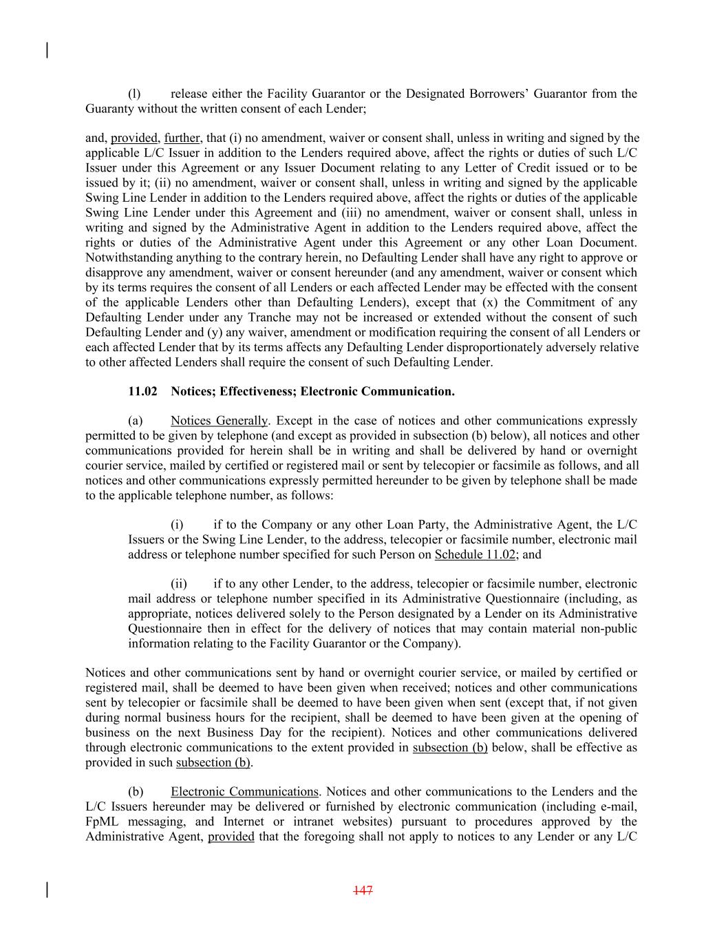 (l) release either the Facility Guarantor or the Designated Borrowers’ Guarantor from the Guaranty without the written consent of each Lender; and, provided, further, that (i) no amendment, waiver or consent shall, unless in writing and signed by the applicable L/C Issuer in addition to the Lenders required above, affect the rights or duties of such L/C Issuer under this Agreement or any Issuer Document relating to any Letter of Credit issued or to be issued by it; (ii) no amendment, waiver or consent shall, unless in writing and signed by the applicable Swing Line Lender in addition to the Lenders required above, affect the rights or duties of the applicable Swing Line Lender under this Agreement and (iii) no amendment, waiver or consent shall, unless in writing and signed by the Administrative Agent in addition to the Lenders required above, affect the rights or duties of the Administrative Agent under this Agreement or any other Loan Document. Notwithstanding anything to the contrary herein, no Defaulting Lender shall have any right to approve or disapprove any amendment, waiver or consent hereunder (and any amendment, waiver or consent which by its terms requires the consent of all Lenders or each affected Lender may be effected with the consent of the applicable Lenders other than Defaulting Lenders), except that (x) the Commitment of any Defaulting Lender under any Tranche may not be increased or extended without the consent of such Defaulting Lender and (y) any waiver, amendment or modification requiring the consent of all Lenders or each affected Lender that by its terms affects any Defaulting Lender disproportionately adversely relative to other affected Lenders shall require the consent of such Defaulting Lender. 11.02 Notices; Effectiveness; Electronic Communication. (a) Notices Generally. Except in the case of notices and other communications expressly permitted to be given by telephone (and except as provided in subsection (b) below), all notices and other communications provided for herein shall be in writing and shall be delivered by hand or overnight courier service, mailed by certified or registered mail or sent by telecopier or facsimile as follows, and all notices and other communications expressly permitted hereunder to be given by telephone shall be made to the applicable telephone number, as follows: (i) if to the Company or any other Loan Party, the Administrative Agent, the L/C Issuers or the Swing Line Lender, to the address, telecopier or facsimile number, electronic mail address or telephone number specified for such Person on Schedule 11.02; and (ii) if to any other Lender, to the address, telecopier or facsimile number, electronic mail address or telephone number specified in its Administrative Questionnaire (including, as appropriate, notices delivered solely to the Person designated by a Lender on its Administrative Questionnaire then in effect for the delivery of notices that may contain material non-public information relating to the Facility Guarantor or the Company). Notices and other communications sent by hand or overnight courier service, or mailed by certified or registered mail, shall be deemed to have been given when received; notices and other communications sent by telecopier or facsimile shall be deemed to have been given when sent (except that, if not given during normal business hours for the recipient, shall be deemed to have been given at the opening of business on the next Business Day for the recipient). Notices and other communications delivered through electronic communications to the extent provided in subsection (b) below, shall be effective as provided in such subsection (b). (b) Electronic Communications. Notices and other communications to the Lenders and the L/C Issuers hereunder may be delivered or furnished by electronic communication (including e-mail, FpML messaging, and Internet or intranet websites) pursuant to procedures approved by the Administrative Agent, provided that the foregoing shall not apply to notices to any Lender or any L/C 147