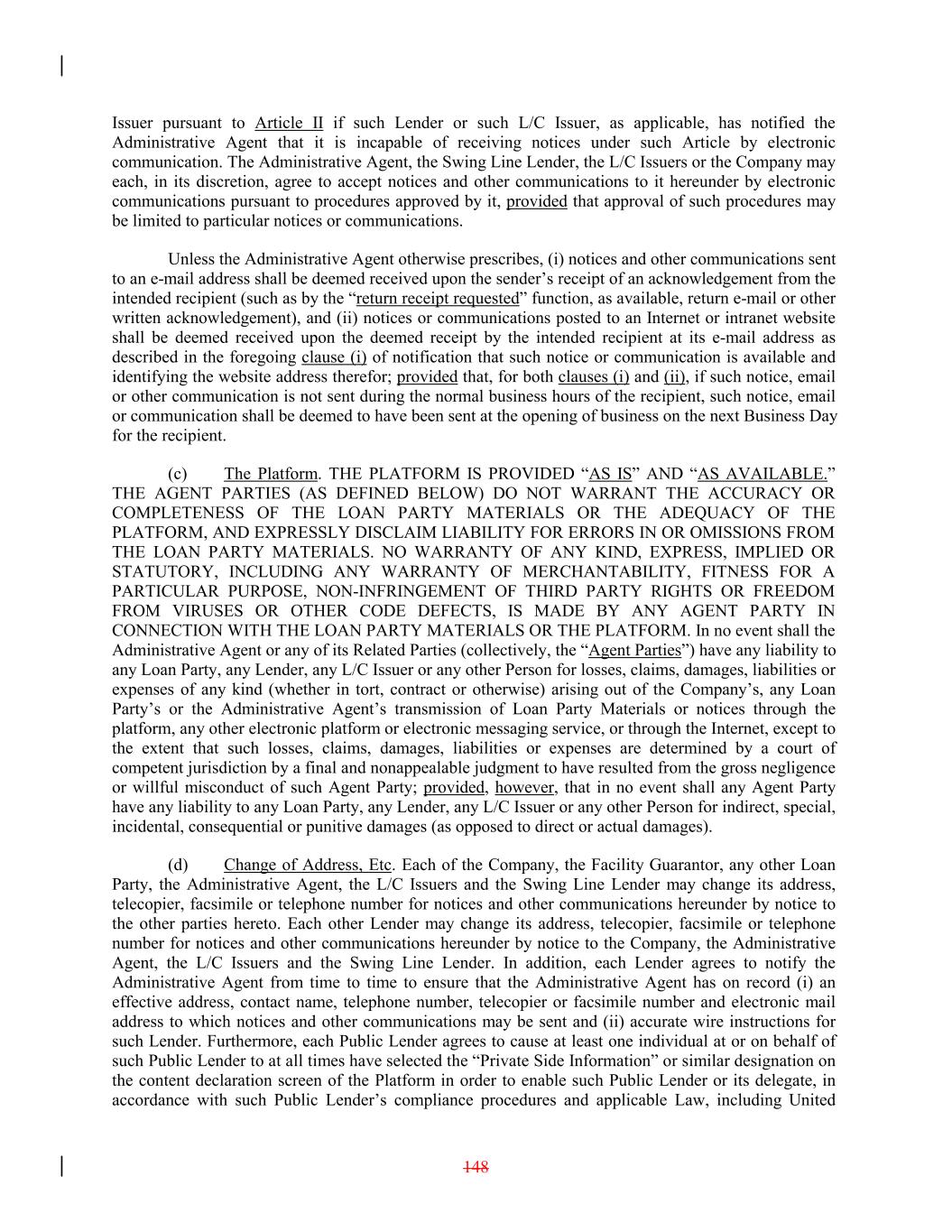Issuer pursuant to Article II if such Lender or such L/C Issuer, as applicable, has notified the Administrative Agent that it is incapable of receiving notices under such Article by electronic communication. The Administrative Agent, the Swing Line Lender, the L/C Issuers or the Company may each, in its discretion, agree to accept notices and other communications to it hereunder by electronic communications pursuant to procedures approved by it, provided that approval of such procedures may be limited to particular notices or communications. Unless the Administrative Agent otherwise prescribes, (i) notices and other communications sent to an e-mail address shall be deemed received upon the sender’s receipt of an acknowledgement from the intended recipient (such as by the “return receipt requested” function, as available, return e-mail or other written acknowledgement), and (ii) notices or communications posted to an Internet or intranet website shall be deemed received upon the deemed receipt by the intended recipient at its e-mail address as described in the foregoing clause (i) of notification that such notice or communication is available and identifying the website address therefor; provided that, for both clauses (i) and (ii), if such notice, email or other communication is not sent during the normal business hours of the recipient, such notice, email or communication shall be deemed to have been sent at the opening of business on the next Business Day for the recipient. (c) The Platform. THE PLATFORM IS PROVIDED “AS IS” AND “AS AVAILABLE.” THE AGENT PARTIES (AS DEFINED BELOW) DO NOT WARRANT THE ACCURACY OR COMPLETENESS OF THE LOAN PARTY MATERIALS OR THE ADEQUACY OF THE PLATFORM, AND EXPRESSLY DISCLAIM LIABILITY FOR ERRORS IN OR OMISSIONS FROM THE LOAN PARTY MATERIALS. NO WARRANTY OF ANY KIND, EXPRESS, IMPLIED OR STATUTORY, INCLUDING ANY WARRANTY OF MERCHANTABILITY, FITNESS FOR A PARTICULAR PURPOSE, NON-INFRINGEMENT OF THIRD PARTY RIGHTS OR FREEDOM FROM VIRUSES OR OTHER CODE DEFECTS, IS MADE BY ANY AGENT PARTY IN CONNECTION WITH THE LOAN PARTY MATERIALS OR THE PLATFORM. In no event shall the Administrative Agent or any of its Related Parties (collectively, the “Agent Parties”) have any liability to any Loan Party, any Lender, any L/C Issuer or any other Person for losses, claims, damages, liabilities or expenses of any kind (whether in tort, contract or otherwise) arising out of the Company’s, any Loan Party’s or the Administrative Agent’s transmission of Loan Party Materials or notices through the platform, any other electronic platform or electronic messaging service, or through the Internet, except to the extent that such losses, claims, damages, liabilities or expenses are determined by a court of competent jurisdiction by a final and nonappealable judgment to have resulted from the gross negligence or willful misconduct of such Agent Party; provided, however, that in no event shall any Agent Party have any liability to any Loan Party, any Lender, any L/C Issuer or any other Person for indirect, special, incidental, consequential or punitive damages (as opposed to direct or actual damages). (d) Change of Address, Etc. Each of the Company, the Facility Guarantor, any other Loan Party, the Administrative Agent, the L/C Issuers and the Swing Line Lender may change its address, telecopier, facsimile or telephone number for notices and other communications hereunder by notice to the other parties hereto. Each other Lender may change its address, telecopier, facsimile or telephone number for notices and other communications hereunder by notice to the Company, the Administrative Agent, the L/C Issuers and the Swing Line Lender. In addition, each Lender agrees to notify the Administrative Agent from time to time to ensure that the Administrative Agent has on record (i) an effective address, contact name, telephone number, telecopier or facsimile number and electronic mail address to which notices and other communications may be sent and (ii) accurate wire instructions for such Lender. Furthermore, each Public Lender agrees to cause at least one individual at or on behalf of such Public Lender to at all times have selected the “Private Side Information” or similar designation on the content declaration screen of the Platform in order to enable such Public Lender or its delegate, in accordance with such Public Lender’s compliance procedures and applicable Law, including United 148