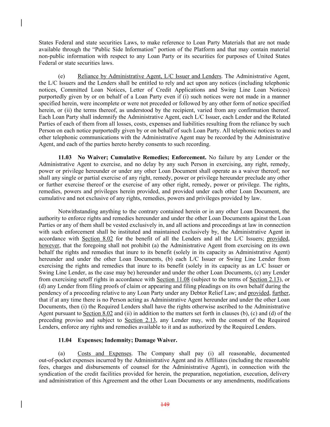 States Federal and state securities Laws, to make reference to Loan Party Materials that are not made available through the “Public Side Information” portion of the Platform and that may contain material non-public information with respect to any Loan Party or its securities for purposes of United States Federal or state securities laws. (e) Reliance by Administrative Agent, L/C Issuer and Lenders. The Administrative Agent, the L/C Issuers and the Lenders shall be entitled to rely and act upon any notices (including telephonic notices, Committed Loan Notices, Letter of Credit Applications and Swing Line Loan Notices) purportedly given by or on behalf of a Loan Party even if (i) such notices were not made in a manner specified herein, were incomplete or were not preceded or followed by any other form of notice specified herein, or (ii) the terms thereof, as understood by the recipient, varied from any confirmation thereof. Each Loan Party shall indemnify the Administrative Agent, each L/C Issuer, each Lender and the Related Parties of each of them from all losses, costs, expenses and liabilities resulting from the reliance by such Person on each notice purportedly given by or on behalf of such Loan Party. All telephonic notices to and other telephonic communications with the Administrative Agent may be recorded by the Administrative Agent, and each of the parties hereto hereby consents to such recording. 11.03 No Waiver; Cumulative Remedies; Enforcement. No failure by any Lender or the Administrative Agent to exercise, and no delay by any such Person in exercising, any right, remedy, power or privilege hereunder or under any other Loan Document shall operate as a waiver thereof; nor shall any single or partial exercise of any right, remedy, power or privilege hereunder preclude any other or further exercise thereof or the exercise of any other right, remedy, power or privilege. The rights, remedies, powers and privileges herein provided, and provided under each other Loan Document, are cumulative and not exclusive of any rights, remedies, powers and privileges provided by law. Notwithstanding anything to the contrary contained herein or in any other Loan Document, the authority to enforce rights and remedies hereunder and under the other Loan Documents against the Loan Parties or any of them shall be vested exclusively in, and all actions and proceedings at law in connection with such enforcement shall be instituted and maintained exclusively by, the Administrative Agent in accordance with Section 8.02 for the benefit of all the Lenders and all the L/C Issuers; provided, however, that the foregoing shall not prohibit (a) the Administrative Agent from exercising on its own behalf the rights and remedies that inure to its benefit (solely in its capacity as Administrative Agent) hereunder and under the other Loan Documents, (b) each L/C Issuer or Swing Line Lender from exercising the rights and remedies that inure to its benefit (solely in its capacity as an L/C Issuer or Swing Line Lender, as the case may be) hereunder and under the other Loan Documents, (c) any Lender from exercising setoff rights in accordance with Section 11.08 (subject to the terms of Section 2.13), or (d) any Lender from filing proofs of claim or appearing and filing pleadings on its own behalf during the pendency of a proceeding relative to any Loan Party under any Debtor Relief Law; and provided, further, that if at any time there is no Person acting as Administrative Agent hereunder and under the other Loan Documents, then (i) the Required Lenders shall have the rights otherwise ascribed to the Administrative Agent pursuant to Section 8.02 and (ii) in addition to the matters set forth in clauses (b), (c) and (d) of the preceding proviso and subject to Section 2.13, any Lender may, with the consent of the Required Lenders, enforce any rights and remedies available to it and as authorized by the Required Lenders. 11.04 Expenses; Indemnity; Damage Waiver. (a) Costs and Expenses. The Company shall pay (i) all reasonable, documented out-of-pocket expenses incurred by the Administrative Agent and its Affiliates (including the reasonable fees, charges and disbursements of counsel for the Administrative Agent), in connection with the syndication of the credit facilities provided for herein, the preparation, negotiation, execution, delivery and administration of this Agreement and the other Loan Documents or any amendments, modifications 149