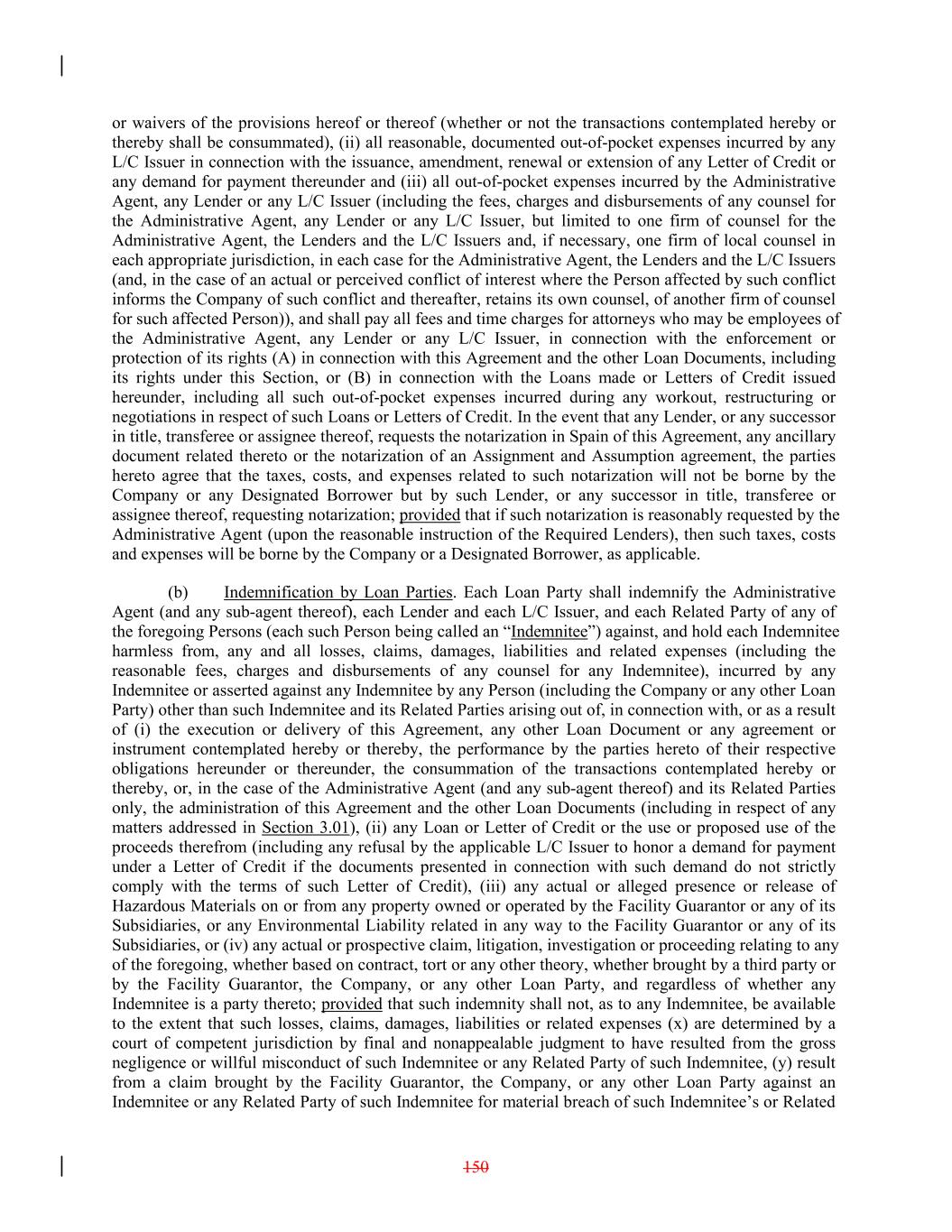 or waivers of the provisions hereof or thereof (whether or not the transactions contemplated hereby or thereby shall be consummated), (ii) all reasonable, documented out-of-pocket expenses incurred by any L/C Issuer in connection with the issuance, amendment, renewal or extension of any Letter of Credit or any demand for payment thereunder and (iii) all out-of-pocket expenses incurred by the Administrative Agent, any Lender or any L/C Issuer (including the fees, charges and disbursements of any counsel for the Administrative Agent, any Lender or any L/C Issuer, but limited to one firm of counsel for the Administrative Agent, the Lenders and the L/C Issuers and, if necessary, one firm of local counsel in each appropriate jurisdiction, in each case for the Administrative Agent, the Lenders and the L/C Issuers (and, in the case of an actual or perceived conflict of interest where the Person affected by such conflict informs the Company of such conflict and thereafter, retains its own counsel, of another firm of counsel for such affected Person)), and shall pay all fees and time charges for attorneys who may be employees of the Administrative Agent, any Lender or any L/C Issuer, in connection with the enforcement or protection of its rights (A) in connection with this Agreement and the other Loan Documents, including its rights under this Section, or (B) in connection with the Loans made or Letters of Credit issued hereunder, including all such out-of-pocket expenses incurred during any workout, restructuring or negotiations in respect of such Loans or Letters of Credit. In the event that any Lender, or any successor in title, transferee or assignee thereof, requests the notarization in Spain of this Agreement, any ancillary document related thereto or the notarization of an Assignment and Assumption agreement, the parties hereto agree that the taxes, costs, and expenses related to such notarization will not be borne by the Company or any Designated Borrower but by such Lender, or any successor in title, transferee or assignee thereof, requesting notarization; provided that if such notarization is reasonably requested by the Administrative Agent (upon the reasonable instruction of the Required Lenders), then such taxes, costs and expenses will be borne by the Company or a Designated Borrower, as applicable. (b) Indemnification by Loan Parties. Each Loan Party shall indemnify the Administrative Agent (and any sub-agent thereof), each Lender and each L/C Issuer, and each Related Party of any of the foregoing Persons (each such Person being called an “Indemnitee”) against, and hold each Indemnitee harmless from, any and all losses, claims, damages, liabilities and related expenses (including the reasonable fees, charges and disbursements of any counsel for any Indemnitee), incurred by any Indemnitee or asserted against any Indemnitee by any Person (including the Company or any other Loan Party) other than such Indemnitee and its Related Parties arising out of, in connection with, or as a result of (i) the execution or delivery of this Agreement, any other Loan Document or any agreement or instrument contemplated hereby or thereby, the performance by the parties hereto of their respective obligations hereunder or thereunder, the consummation of the transactions contemplated hereby or thereby, or, in the case of the Administrative Agent (and any sub-agent thereof) and its Related Parties only, the administration of this Agreement and the other Loan Documents (including in respect of any matters addressed in Section 3.01), (ii) any Loan or Letter of Credit or the use or proposed use of the proceeds therefrom (including any refusal by the applicable L/C Issuer to honor a demand for payment under a Letter of Credit if the documents presented in connection with such demand do not strictly comply with the terms of such Letter of Credit), (iii) any actual or alleged presence or release of Hazardous Materials on or from any property owned or operated by the Facility Guarantor or any of its Subsidiaries, or any Environmental Liability related in any way to the Facility Guarantor or any of its Subsidiaries, or (iv) any actual or prospective claim, litigation, investigation or proceeding relating to any of the foregoing, whether based on contract, tort or any other theory, whether brought by a third party or by the Facility Guarantor, the Company, or any other Loan Party, and regardless of whether any Indemnitee is a party thereto; provided that such indemnity shall not, as to any Indemnitee, be available to the extent that such losses, claims, damages, liabilities or related expenses (x) are determined by a court of competent jurisdiction by final and nonappealable judgment to have resulted from the gross negligence or willful misconduct of such Indemnitee or any Related Party of such Indemnitee, (y) result from a claim brought by the Facility Guarantor, the Company, or any other Loan Party against an Indemnitee or any Related Party of such Indemnitee for material breach of such Indemnitee’s or Related 150