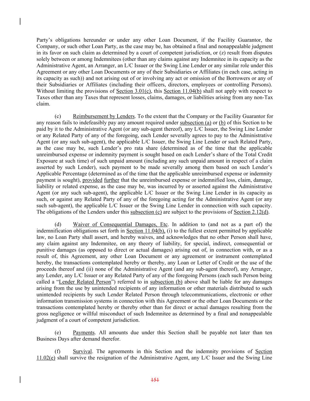Party’s obligations hereunder or under any other Loan Document, if the Facility Guarantor, the Company, or such other Loan Party, as the case may be, has obtained a final and nonappealable judgment in its favor on such claim as determined by a court of competent jurisdiction, or (z) result from disputes solely between or among Indemnitees (other than any claims against any Indemnitee in its capacity as the Administrative Agent, an Arranger, an L/C Issuer or the Swing Line Lender or any similar role under this Agreement or any other Loan Documents or any of their Subsidiaries or Affiliates (in each case, acting in its capacity as such)) and not arising out of or involving any act or omission of the Borrowers or any of their Subsidiaries or Affiliates (including their officers, directors, employees or controlling Persons). Without limiting the provisions of Section 3.01(c), this Section 11.04(b) shall not apply with respect to Taxes other than any Taxes that represent losses, claims, damages, or liabilities arising from any non-Tax claim. (c) Reimbursement by Lenders. To the extent that the Company or the Facility Guarantor for any reason fails to indefeasibly pay any amount required under subsection (a) or (b) of this Section to be paid by it to the Administrative Agent (or any sub-agent thereof), any L/C Issuer, the Swing Line Lender or any Related Party of any of the foregoing, each Lender severally agrees to pay to the Administrative Agent (or any such sub-agent), the applicable L/C Issuer, the Swing Line Lender or such Related Party, as the case may be, such Lender’s pro rata share (determined as of the time that the applicable unreimbursed expense or indemnity payment is sought based on each Lender’s share of the Total Credit Exposure at such time) of such unpaid amount (including any such unpaid amount in respect of a claim asserted by such Lender), such payment to be made severally among them based on such Lender’s Applicable Percentage (determined as of the time that the applicable unreimbursed expense or indemnity payment is sought), provided further that the unreimbursed expense or indemnified loss, claim, damage, liability or related expense, as the case may be, was incurred by or asserted against the Administrative Agent (or any such sub-agent), the applicable L/C Issuer or the Swing Line Lender in its capacity as such, or against any Related Party of any of the foregoing acting for the Administrative Agent (or any such sub-agent), the applicable L/C Issuer or the Swing Line Lender in connection with such capacity. The obligations of the Lenders under this subsection (c) are subject to the provisions of Section 2.12(d). (d) Waiver of Consequential Damages, Etc. In addition to (and not as a part of) the indemnification obligations set forth in Section 11.04(b), (i) to the fullest extent permitted by applicable law, no Loan Party shall assert, and hereby waives, and acknowledges that no other Person shall have, any claim against any Indemnitee, on any theory of liability, for special, indirect, consequential or punitive damages (as opposed to direct or actual damages) arising out of, in connection with, or as a result of, this Agreement, any other Loan Document or any agreement or instrument contemplated hereby, the transactions contemplated hereby or thereby, any Loan or Letter of Credit or the use of the proceeds thereof and (ii) none of the Administrative Agent (and any sub-agent thereof), any Arranger, any Lender, any L/C Issuer or any Related Party of any of the foregoing Persons (each such Person being called a “Lender Related Person”) referred to in subsection (b) above shall be liable for any damages arising from the use by unintended recipients of any information or other materials distributed to such unintended recipients by such Lender Related Person through telecommunications, electronic or other information transmission systems in connection with this Agreement or the other Loan Documents or the transactions contemplated hereby or thereby other than for direct or actual damages resulting from the gross negligence or willful misconduct of such Indemnitee as determined by a final and nonappealable judgment of a court of competent jurisdiction. (e) Payments. All amounts due under this Section shall be payable not later than ten Business Days after demand therefor. (f) Survival. The agreements in this Section and the indemnity provisions of Section 11.02(e) shall survive the resignation of the Administrative Agent, any L/C Issuer and the Swing Line 151