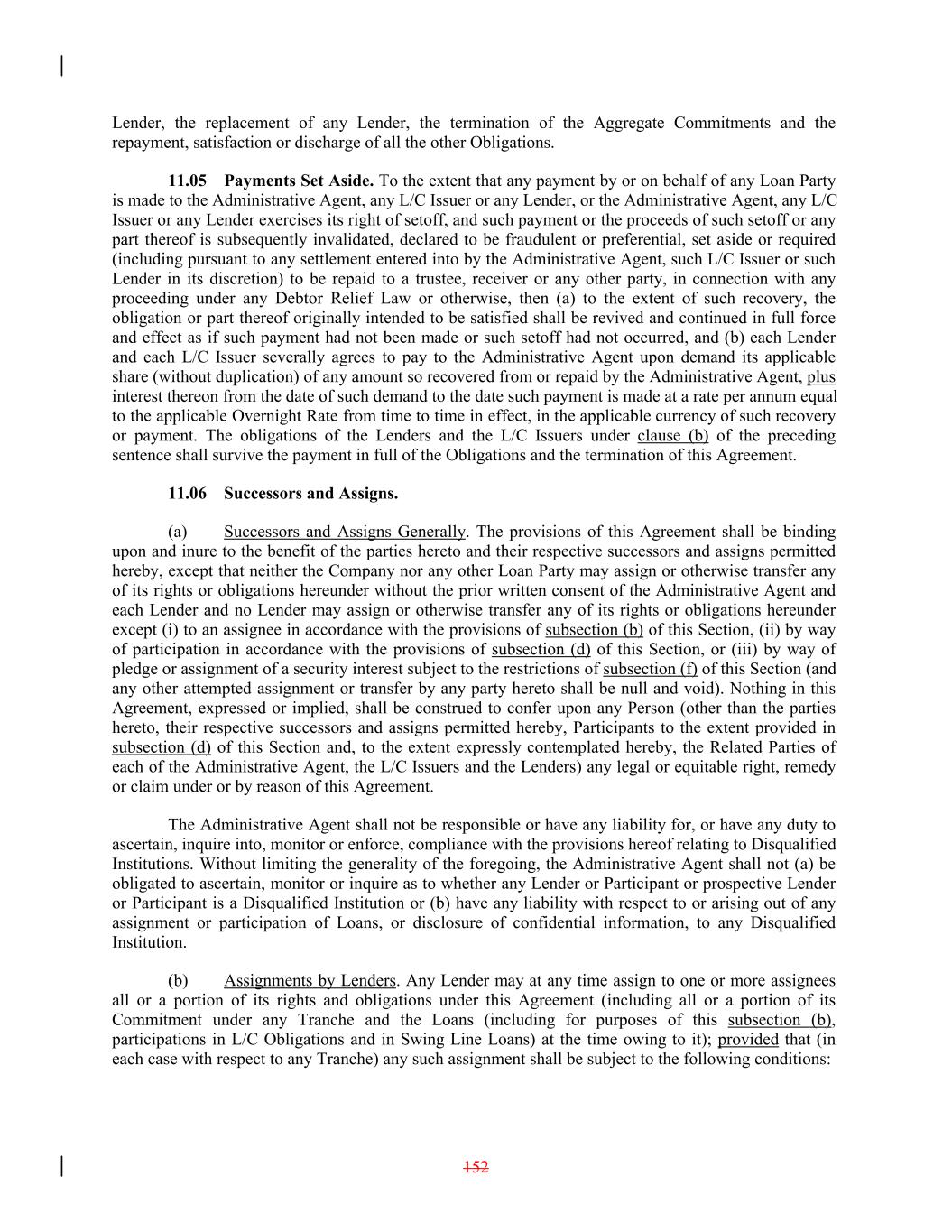 Lender, the replacement of any Lender, the termination of the Aggregate Commitments and the repayment, satisfaction or discharge of all the other Obligations. 11.05 Payments Set Aside. To the extent that any payment by or on behalf of any Loan Party is made to the Administrative Agent, any L/C Issuer or any Lender, or the Administrative Agent, any L/C Issuer or any Lender exercises its right of setoff, and such payment or the proceeds of such setoff or any part thereof is subsequently invalidated, declared to be fraudulent or preferential, set aside or required (including pursuant to any settlement entered into by the Administrative Agent, such L/C Issuer or such Lender in its discretion) to be repaid to a trustee, receiver or any other party, in connection with any proceeding under any Debtor Relief Law or otherwise, then (a) to the extent of such recovery, the obligation or part thereof originally intended to be satisfied shall be revived and continued in full force and effect as if such payment had not been made or such setoff had not occurred, and (b) each Lender and each L/C Issuer severally agrees to pay to the Administrative Agent upon demand its applicable share (without duplication) of any amount so recovered from or repaid by the Administrative Agent, plus interest thereon from the date of such demand to the date such payment is made at a rate per annum equal to the applicable Overnight Rate from time to time in effect, in the applicable currency of such recovery or payment. The obligations of the Lenders and the L/C Issuers under clause (b) of the preceding sentence shall survive the payment in full of the Obligations and the termination of this Agreement. 11.06 Successors and Assigns. (a) Successors and Assigns Generally. The provisions of this Agreement shall be binding upon and inure to the benefit of the parties hereto and their respective successors and assigns permitted hereby, except that neither the Company nor any other Loan Party may assign or otherwise transfer any of its rights or obligations hereunder without the prior written consent of the Administrative Agent and each Lender and no Lender may assign or otherwise transfer any of its rights or obligations hereunder except (i) to an assignee in accordance with the provisions of subsection (b) of this Section, (ii) by way of participation in accordance with the provisions of subsection (d) of this Section, or (iii) by way of pledge or assignment of a security interest subject to the restrictions of subsection (f) of this Section (and any other attempted assignment or transfer by any party hereto shall be null and void). Nothing in this Agreement, expressed or implied, shall be construed to confer upon any Person (other than the parties hereto, their respective successors and assigns permitted hereby, Participants to the extent provided in subsection (d) of this Section and, to the extent expressly contemplated hereby, the Related Parties of each of the Administrative Agent, the L/C Issuers and the Lenders) any legal or equitable right, remedy or claim under or by reason of this Agreement. The Administrative Agent shall not be responsible or have any liability for, or have any duty to ascertain, inquire into, monitor or enforce, compliance with the provisions hereof relating to Disqualified Institutions. Without limiting the generality of the foregoing, the Administrative Agent shall not (a) be obligated to ascertain, monitor or inquire as to whether any Lender or Participant or prospective Lender or Participant is a Disqualified Institution or (b) have any liability with respect to or arising out of any assignment or participation of Loans, or disclosure of confidential information, to any Disqualified Institution. (b) Assignments by Lenders. Any Lender may at any time assign to one or more assignees all or a portion of its rights and obligations under this Agreement (including all or a portion of its Commitment under any Tranche and the Loans (including for purposes of this subsection (b), participations in L/C Obligations and in Swing Line Loans) at the time owing to it); provided that (in each case with respect to any Tranche) any such assignment shall be subject to the following conditions: 152