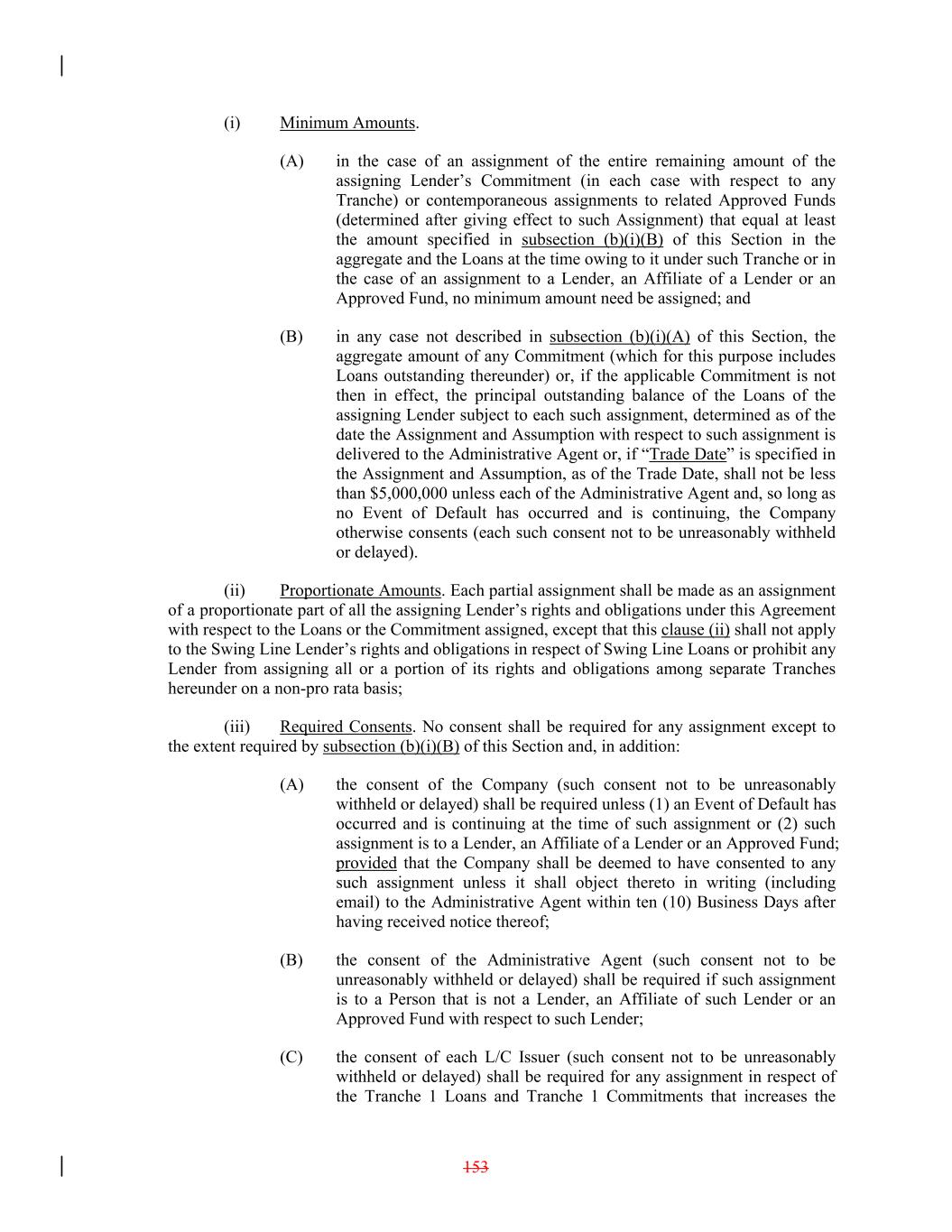 (i) Minimum Amounts. (A) in the case of an assignment of the entire remaining amount of the assigning Lender’s Commitment (in each case with respect to any Tranche) or contemporaneous assignments to related Approved Funds (determined after giving effect to such Assignment) that equal at least the amount specified in subsection (b)(i)(B) of this Section in the aggregate and the Loans at the time owing to it under such Tranche or in the case of an assignment to a Lender, an Affiliate of a Lender or an Approved Fund, no minimum amount need be assigned; and (B) in any case not described in subsection (b)(i)(A) of this Section, the aggregate amount of any Commitment (which for this purpose includes Loans outstanding thereunder) or, if the applicable Commitment is not then in effect, the principal outstanding balance of the Loans of the assigning Lender subject to each such assignment, determined as of the date the Assignment and Assumption with respect to such assignment is delivered to the Administrative Agent or, if “Trade Date” is specified in the Assignment and Assumption, as of the Trade Date, shall not be less than $5,000,000 unless each of the Administrative Agent and, so long as no Event of Default has occurred and is continuing, the Company otherwise consents (each such consent not to be unreasonably withheld or delayed). (ii) Proportionate Amounts. Each partial assignment shall be made as an assignment of a proportionate part of all the assigning Lender’s rights and obligations under this Agreement with respect to the Loans or the Commitment assigned, except that this clause (ii) shall not apply to the Swing Line Lender’s rights and obligations in respect of Swing Line Loans or prohibit any Lender from assigning all or a portion of its rights and obligations among separate Tranches hereunder on a non-pro rata basis; (iii) Required Consents. No consent shall be required for any assignment except to the extent required by subsection (b)(i)(B) of this Section and, in addition: (A) the consent of the Company (such consent not to be unreasonably withheld or delayed) shall be required unless (1) an Event of Default has occurred and is continuing at the time of such assignment or (2) such assignment is to a Lender, an Affiliate of a Lender or an Approved Fund; provided that the Company shall be deemed to have consented to any such assignment unless it shall object thereto in writing (including email) to the Administrative Agent within ten (10) Business Days after having received notice thereof; (B) the consent of the Administrative Agent (such consent not to be unreasonably withheld or delayed) shall be required if such assignment is to a Person that is not a Lender, an Affiliate of such Lender or an Approved Fund with respect to such Lender; (C) the consent of each L/C Issuer (such consent not to be unreasonably withheld or delayed) shall be required for any assignment in respect of the Tranche 1 Loans and Tranche 1 Commitments that increases the 153