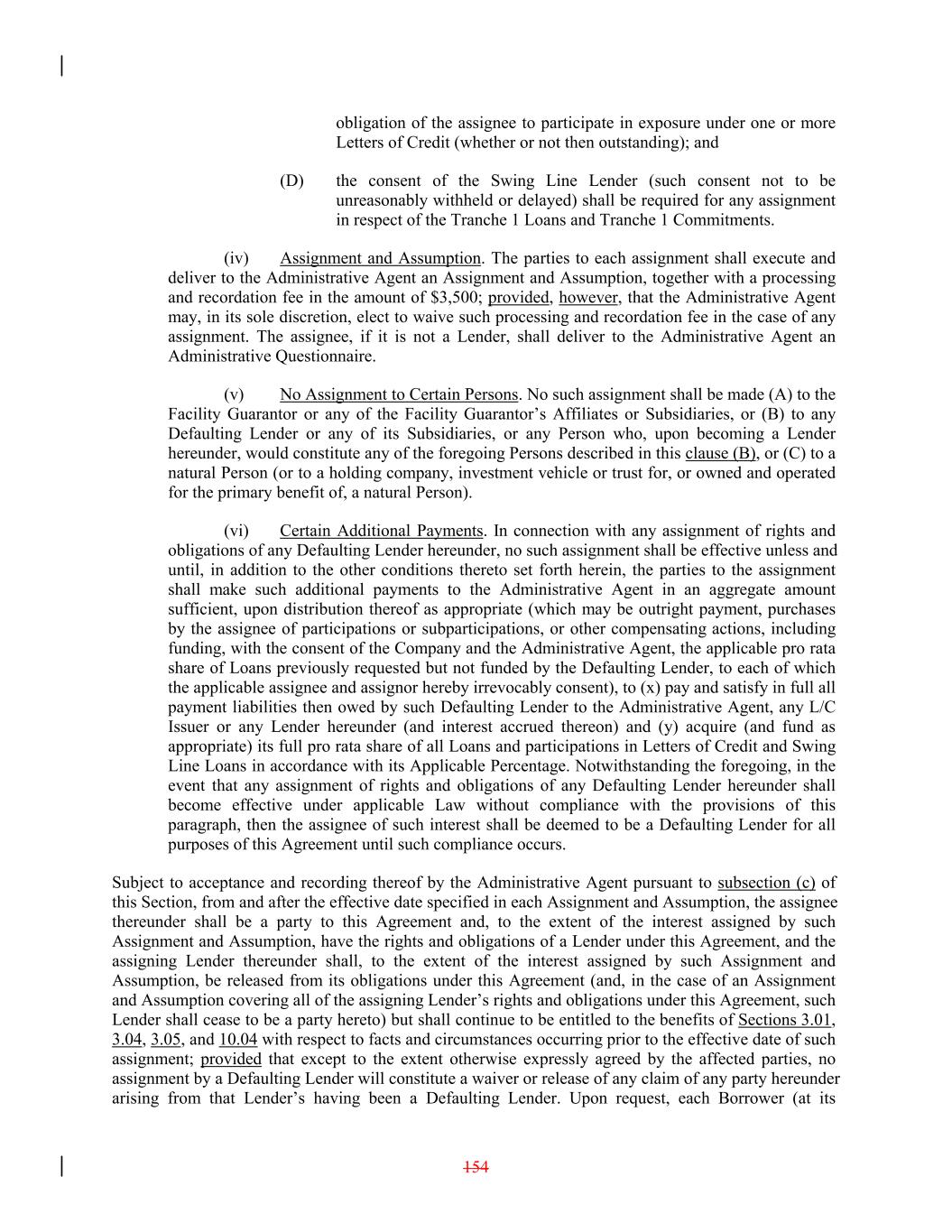 obligation of the assignee to participate in exposure under one or more Letters of Credit (whether or not then outstanding); and (D) the consent of the Swing Line Lender (such consent not to be unreasonably withheld or delayed) shall be required for any assignment in respect of the Tranche 1 Loans and Tranche 1 Commitments. (iv) Assignment and Assumption. The parties to each assignment shall execute and deliver to the Administrative Agent an Assignment and Assumption, together with a processing and recordation fee in the amount of $3,500; provided, however, that the Administrative Agent may, in its sole discretion, elect to waive such processing and recordation fee in the case of any assignment. The assignee, if it is not a Lender, shall deliver to the Administrative Agent an Administrative Questionnaire. (v) No Assignment to Certain Persons. No such assignment shall be made (A) to the Facility Guarantor or any of the Facility Guarantor’s Affiliates or Subsidiaries, or (B) to any Defaulting Lender or any of its Subsidiaries, or any Person who, upon becoming a Lender hereunder, would constitute any of the foregoing Persons described in this clause (B), or (C) to a natural Person (or to a holding company, investment vehicle or trust for, or owned and operated for the primary benefit of, a natural Person). (vi) Certain Additional Payments. In connection with any assignment of rights and obligations of any Defaulting Lender hereunder, no such assignment shall be effective unless and until, in addition to the other conditions thereto set forth herein, the parties to the assignment shall make such additional payments to the Administrative Agent in an aggregate amount sufficient, upon distribution thereof as appropriate (which may be outright payment, purchases by the assignee of participations or subparticipations, or other compensating actions, including funding, with the consent of the Company and the Administrative Agent, the applicable pro rata share of Loans previously requested but not funded by the Defaulting Lender, to each of which the applicable assignee and assignor hereby irrevocably consent), to (x) pay and satisfy in full all payment liabilities then owed by such Defaulting Lender to the Administrative Agent, any L/C Issuer or any Lender hereunder (and interest accrued thereon) and (y) acquire (and fund as appropriate) its full pro rata share of all Loans and participations in Letters of Credit and Swing Line Loans in accordance with its Applicable Percentage. Notwithstanding the foregoing, in the event that any assignment of rights and obligations of any Defaulting Lender hereunder shall become effective under applicable Law without compliance with the provisions of this paragraph, then the assignee of such interest shall be deemed to be a Defaulting Lender for all purposes of this Agreement until such compliance occurs. Subject to acceptance and recording thereof by the Administrative Agent pursuant to subsection (c) of this Section, from and after the effective date specified in each Assignment and Assumption, the assignee thereunder shall be a party to this Agreement and, to the extent of the interest assigned by such Assignment and Assumption, have the rights and obligations of a Lender under this Agreement, and the assigning Lender thereunder shall, to the extent of the interest assigned by such Assignment and Assumption, be released from its obligations under this Agreement (and, in the case of an Assignment and Assumption covering all of the assigning Lender’s rights and obligations under this Agreement, such Lender shall cease to be a party hereto) but shall continue to be entitled to the benefits of Sections 3.01, 3.04, 3.05, and 10.04 with respect to facts and circumstances occurring prior to the effective date of such assignment; provided that except to the extent otherwise expressly agreed by the affected parties, no assignment by a Defaulting Lender will constitute a waiver or release of any claim of any party hereunder arising from that Lender’s having been a Defaulting Lender. Upon request, each Borrower (at its 154