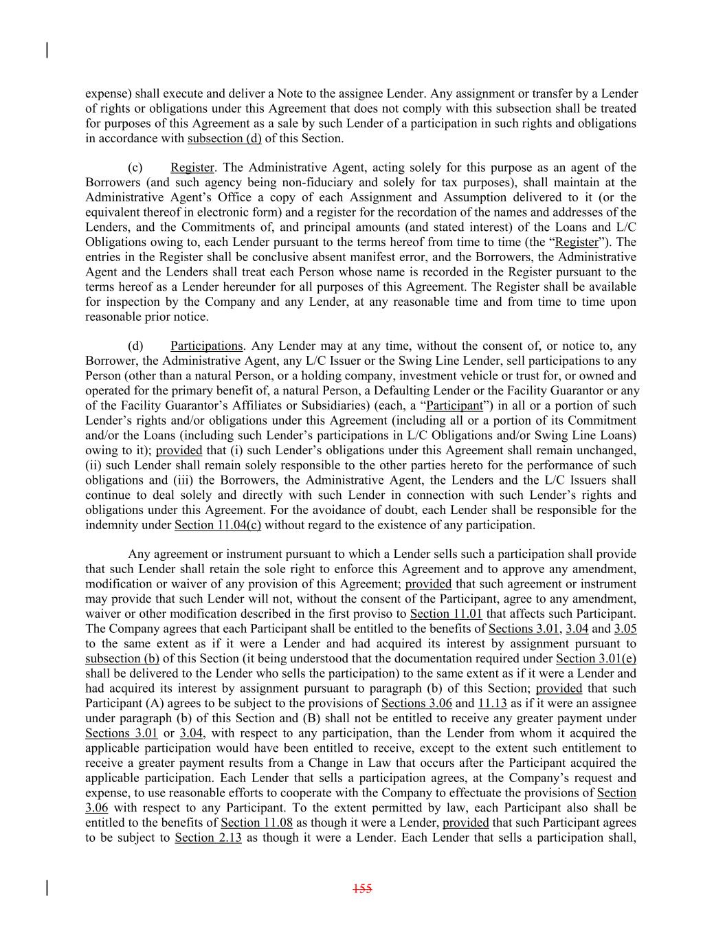 expense) shall execute and deliver a Note to the assignee Lender. Any assignment or transfer by a Lender of rights or obligations under this Agreement that does not comply with this subsection shall be treated for purposes of this Agreement as a sale by such Lender of a participation in such rights and obligations in accordance with subsection (d) of this Section. (c) Register. The Administrative Agent, acting solely for this purpose as an agent of the Borrowers (and such agency being non-fiduciary and solely for tax purposes), shall maintain at the Administrative Agent’s Office a copy of each Assignment and Assumption delivered to it (or the equivalent thereof in electronic form) and a register for the recordation of the names and addresses of the Lenders, and the Commitments of, and principal amounts (and stated interest) of the Loans and L/C Obligations owing to, each Lender pursuant to the terms hereof from time to time (the “Register”). The entries in the Register shall be conclusive absent manifest error, and the Borrowers, the Administrative Agent and the Lenders shall treat each Person whose name is recorded in the Register pursuant to the terms hereof as a Lender hereunder for all purposes of this Agreement. The Register shall be available for inspection by the Company and any Lender, at any reasonable time and from time to time upon reasonable prior notice. (d) Participations. Any Lender may at any time, without the consent of, or notice to, any Borrower, the Administrative Agent, any L/C Issuer or the Swing Line Lender, sell participations to any Person (other than a natural Person, or a holding company, investment vehicle or trust for, or owned and operated for the primary benefit of, a natural Person, a Defaulting Lender or the Facility Guarantor or any of the Facility Guarantor’s Affiliates or Subsidiaries) (each, a “Participant”) in all or a portion of such Lender’s rights and/or obligations under this Agreement (including all or a portion of its Commitment and/or the Loans (including such Lender’s participations in L/C Obligations and/or Swing Line Loans) owing to it); provided that (i) such Lender’s obligations under this Agreement shall remain unchanged, (ii) such Lender shall remain solely responsible to the other parties hereto for the performance of such obligations and (iii) the Borrowers, the Administrative Agent, the Lenders and the L/C Issuers shall continue to deal solely and directly with such Lender in connection with such Lender’s rights and obligations under this Agreement. For the avoidance of doubt, each Lender shall be responsible for the indemnity under Section 11.04(c) without regard to the existence of any participation. Any agreement or instrument pursuant to which a Lender sells such a participation shall provide that such Lender shall retain the sole right to enforce this Agreement and to approve any amendment, modification or waiver of any provision of this Agreement; provided that such agreement or instrument may provide that such Lender will not, without the consent of the Participant, agree to any amendment, waiver or other modification described in the first proviso to Section 11.01 that affects such Participant. The Company agrees that each Participant shall be entitled to the benefits of Sections 3.01, 3.04 and 3.05 to the same extent as if it were a Lender and had acquired its interest by assignment pursuant to subsection (b) of this Section (it being understood that the documentation required under Section 3.01(e) shall be delivered to the Lender who sells the participation) to the same extent as if it were a Lender and had acquired its interest by assignment pursuant to paragraph (b) of this Section; provided that such Participant (A) agrees to be subject to the provisions of Sections 3.06 and 11.13 as if it were an assignee under paragraph (b) of this Section and (B) shall not be entitled to receive any greater payment under Sections 3.01 or 3.04, with respect to any participation, than the Lender from whom it acquired the applicable participation would have been entitled to receive, except to the extent such entitlement to receive a greater payment results from a Change in Law that occurs after the Participant acquired the applicable participation. Each Lender that sells a participation agrees, at the Company’s request and expense, to use reasonable efforts to cooperate with the Company to effectuate the provisions of Section 3.06 with respect to any Participant. To the extent permitted by law, each Participant also shall be entitled to the benefits of Section 11.08 as though it were a Lender, provided that such Participant agrees to be subject to Section 2.13 as though it were a Lender. Each Lender that sells a participation shall, 155