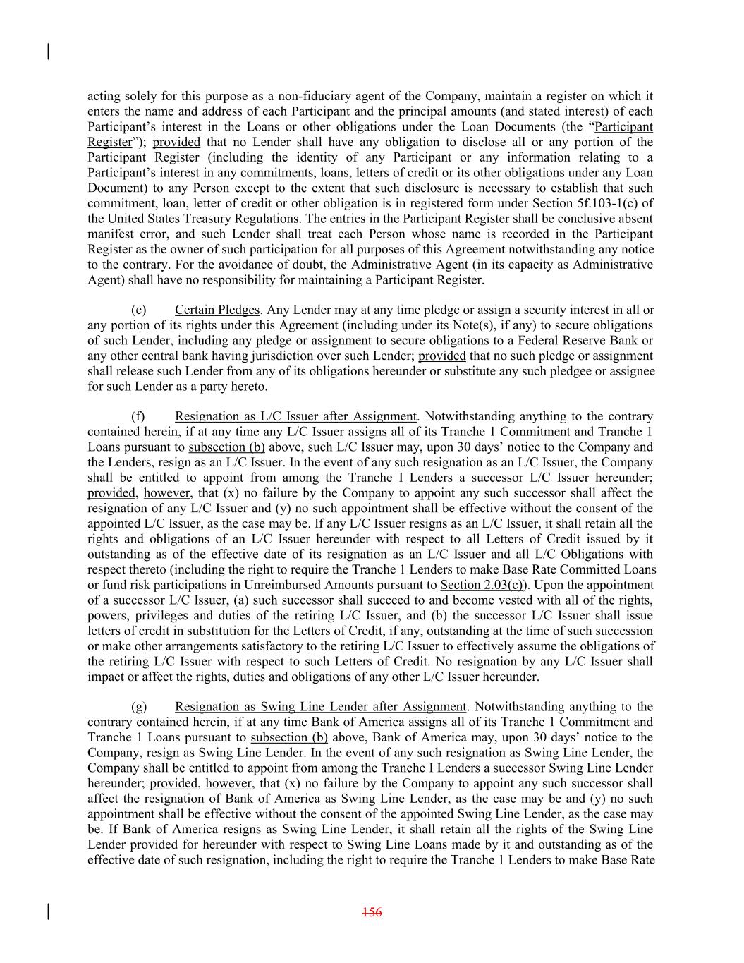 acting solely for this purpose as a non-fiduciary agent of the Company, maintain a register on which it enters the name and address of each Participant and the principal amounts (and stated interest) of each Participant’s interest in the Loans or other obligations under the Loan Documents (the “Participant Register”); provided that no Lender shall have any obligation to disclose all or any portion of the Participant Register (including the identity of any Participant or any information relating to a Participant’s interest in any commitments, loans, letters of credit or its other obligations under any Loan Document) to any Person except to the extent that such disclosure is necessary to establish that such commitment, loan, letter of credit or other obligation is in registered form under Section 5f.103-1(c) of the United States Treasury Regulations. The entries in the Participant Register shall be conclusive absent manifest error, and such Lender shall treat each Person whose name is recorded in the Participant Register as the owner of such participation for all purposes of this Agreement notwithstanding any notice to the contrary. For the avoidance of doubt, the Administrative Agent (in its capacity as Administrative Agent) shall have no responsibility for maintaining a Participant Register. (e) Certain Pledges. Any Lender may at any time pledge or assign a security interest in all or any portion of its rights under this Agreement (including under its Note(s), if any) to secure obligations of such Lender, including any pledge or assignment to secure obligations to a Federal Reserve Bank or any other central bank having jurisdiction over such Lender; provided that no such pledge or assignment shall release such Lender from any of its obligations hereunder or substitute any such pledgee or assignee for such Lender as a party hereto. (f) Resignation as L/C Issuer after Assignment. Notwithstanding anything to the contrary contained herein, if at any time any L/C Issuer assigns all of its Tranche 1 Commitment and Tranche 1 Loans pursuant to subsection (b) above, such L/C Issuer may, upon 30 days’ notice to the Company and the Lenders, resign as an L/C Issuer. In the event of any such resignation as an L/C Issuer, the Company shall be entitled to appoint from among the Tranche I Lenders a successor L/C Issuer hereunder; provided, however, that (x) no failure by the Company to appoint any such successor shall affect the resignation of any L/C Issuer and (y) no such appointment shall be effective without the consent of the appointed L/C Issuer, as the case may be. If any L/C Issuer resigns as an L/C Issuer, it shall retain all the rights and obligations of an L/C Issuer hereunder with respect to all Letters of Credit issued by it outstanding as of the effective date of its resignation as an L/C Issuer and all L/C Obligations with respect thereto (including the right to require the Tranche 1 Lenders to make Base Rate Committed Loans or fund risk participations in Unreimbursed Amounts pursuant to Section 2.03(c)). Upon the appointment of a successor L/C Issuer, (a) such successor shall succeed to and become vested with all of the rights, powers, privileges and duties of the retiring L/C Issuer, and (b) the successor L/C Issuer shall issue letters of credit in substitution for the Letters of Credit, if any, outstanding at the time of such succession or make other arrangements satisfactory to the retiring L/C Issuer to effectively assume the obligations of the retiring L/C Issuer with respect to such Letters of Credit. No resignation by any L/C Issuer shall impact or affect the rights, duties and obligations of any other L/C Issuer hereunder. (g) Resignation as Swing Line Lender after Assignment. Notwithstanding anything to the contrary contained herein, if at any time Bank of America assigns all of its Tranche 1 Commitment and Tranche 1 Loans pursuant to subsection (b) above, Bank of America may, upon 30 days’ notice to the Company, resign as Swing Line Lender. In the event of any such resignation as Swing Line Lender, the Company shall be entitled to appoint from among the Tranche I Lenders a successor Swing Line Lender hereunder; provided, however, that (x) no failure by the Company to appoint any such successor shall affect the resignation of Bank of America as Swing Line Lender, as the case may be and (y) no such appointment shall be effective without the consent of the appointed Swing Line Lender, as the case may be. If Bank of America resigns as Swing Line Lender, it shall retain all the rights of the Swing Line Lender provided for hereunder with respect to Swing Line Loans made by it and outstanding as of the effective date of such resignation, including the right to require the Tranche 1 Lenders to make Base Rate 156