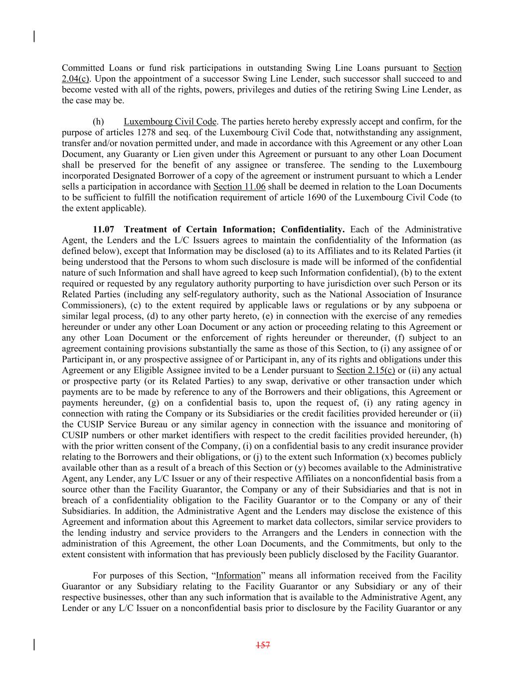 Committed Loans or fund risk participations in outstanding Swing Line Loans pursuant to Section 2.04(c). Upon the appointment of a successor Swing Line Lender, such successor shall succeed to and become vested with all of the rights, powers, privileges and duties of the retiring Swing Line Lender, as the case may be. (h) Luxembourg Civil Code. The parties hereto hereby expressly accept and confirm, for the purpose of articles 1278 and seq. of the Luxembourg Civil Code that, notwithstanding any assignment, transfer and/or novation permitted under, and made in accordance with this Agreement or any other Loan Document, any Guaranty or Lien given under this Agreement or pursuant to any other Loan Document shall be preserved for the benefit of any assignee or transferee. The sending to the Luxembourg incorporated Designated Borrower of a copy of the agreement or instrument pursuant to which a Lender sells a participation in accordance with Section 11.06 shall be deemed in relation to the Loan Documents to be sufficient to fulfill the notification requirement of article 1690 of the Luxembourg Civil Code (to the extent applicable). 11.07 Treatment of Certain Information; Confidentiality. Each of the Administrative Agent, the Lenders and the L/C Issuers agrees to maintain the confidentiality of the Information (as defined below), except that Information may be disclosed (a) to its Affiliates and to its Related Parties (it being understood that the Persons to whom such disclosure is made will be informed of the confidential nature of such Information and shall have agreed to keep such Information confidential), (b) to the extent required or requested by any regulatory authority purporting to have jurisdiction over such Person or its Related Parties (including any self-regulatory authority, such as the National Association of Insurance Commissioners), (c) to the extent required by applicable laws or regulations or by any subpoena or similar legal process, (d) to any other party hereto, (e) in connection with the exercise of any remedies hereunder or under any other Loan Document or any action or proceeding relating to this Agreement or any other Loan Document or the enforcement of rights hereunder or thereunder, (f) subject to an agreement containing provisions substantially the same as those of this Section, to (i) any assignee of or Participant in, or any prospective assignee of or Participant in, any of its rights and obligations under this Agreement or any Eligible Assignee invited to be a Lender pursuant to Section 2.15(c) or (ii) any actual or prospective party (or its Related Parties) to any swap, derivative or other transaction under which payments are to be made by reference to any of the Borrowers and their obligations, this Agreement or payments hereunder, (g) on a confidential basis to, upon the request of, (i) any rating agency in connection with rating the Company or its Subsidiaries or the credit facilities provided hereunder or (ii) the CUSIP Service Bureau or any similar agency in connection with the issuance and monitoring of CUSIP numbers or other market identifiers with respect to the credit facilities provided hereunder, (h) with the prior written consent of the Company, (i) on a confidential basis to any credit insurance provider relating to the Borrowers and their obligations, or (j) to the extent such Information (x) becomes publicly available other than as a result of a breach of this Section or (y) becomes available to the Administrative Agent, any Lender, any L/C Issuer or any of their respective Affiliates on a nonconfidential basis from a source other than the Facility Guarantor, the Company or any of their Subsidiaries and that is not in breach of a confidentiality obligation to the Facility Guarantor or to the Company or any of their Subsidiaries. In addition, the Administrative Agent and the Lenders may disclose the existence of this Agreement and information about this Agreement to market data collectors, similar service providers to the lending industry and service providers to the Arrangers and the Lenders in connection with the administration of this Agreement, the other Loan Documents, and the Commitments, but only to the extent consistent with information that has previously been publicly disclosed by the Facility Guarantor. For purposes of this Section, “Information” means all information received from the Facility Guarantor or any Subsidiary relating to the Facility Guarantor or any Subsidiary or any of their respective businesses, other than any such information that is available to the Administrative Agent, any Lender or any L/C Issuer on a nonconfidential basis prior to disclosure by the Facility Guarantor or any 157