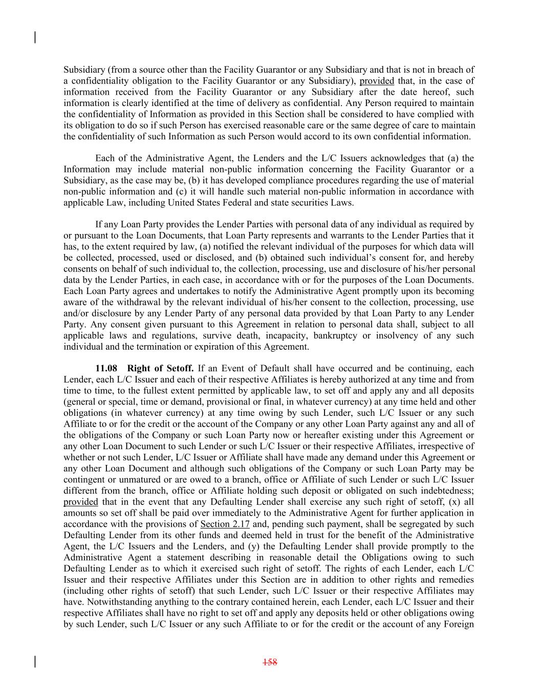 Subsidiary (from a source other than the Facility Guarantor or any Subsidiary and that is not in breach of a confidentiality obligation to the Facility Guarantor or any Subsidiary), provided that, in the case of information received from the Facility Guarantor or any Subsidiary after the date hereof, such information is clearly identified at the time of delivery as confidential. Any Person required to maintain the confidentiality of Information as provided in this Section shall be considered to have complied with its obligation to do so if such Person has exercised reasonable care or the same degree of care to maintain the confidentiality of such Information as such Person would accord to its own confidential information. Each of the Administrative Agent, the Lenders and the L/C Issuers acknowledges that (a) the Information may include material non-public information concerning the Facility Guarantor or a Subsidiary, as the case may be, (b) it has developed compliance procedures regarding the use of material non-public information and (c) it will handle such material non-public information in accordance with applicable Law, including United States Federal and state securities Laws. If any Loan Party provides the Lender Parties with personal data of any individual as required by or pursuant to the Loan Documents, that Loan Party represents and warrants to the Lender Parties that it has, to the extent required by law, (a) notified the relevant individual of the purposes for which data will be collected, processed, used or disclosed, and (b) obtained such individual’s consent for, and hereby consents on behalf of such individual to, the collection, processing, use and disclosure of his/her personal data by the Lender Parties, in each case, in accordance with or for the purposes of the Loan Documents. Each Loan Party agrees and undertakes to notify the Administrative Agent promptly upon its becoming aware of the withdrawal by the relevant individual of his/her consent to the collection, processing, use and/or disclosure by any Lender Party of any personal data provided by that Loan Party to any Lender Party. Any consent given pursuant to this Agreement in relation to personal data shall, subject to all applicable laws and regulations, survive death, incapacity, bankruptcy or insolvency of any such individual and the termination or expiration of this Agreement. 11.08 Right of Setoff. If an Event of Default shall have occurred and be continuing, each Lender, each L/C Issuer and each of their respective Affiliates is hereby authorized at any time and from time to time, to the fullest extent permitted by applicable law, to set off and apply any and all deposits (general or special, time or demand, provisional or final, in whatever currency) at any time held and other obligations (in whatever currency) at any time owing by such Lender, such L/C Issuer or any such Affiliate to or for the credit or the account of the Company or any other Loan Party against any and all of the obligations of the Company or such Loan Party now or hereafter existing under this Agreement or any other Loan Document to such Lender or such L/C Issuer or their respective Affiliates, irrespective of whether or not such Lender, L/C Issuer or Affiliate shall have made any demand under this Agreement or any other Loan Document and although such obligations of the Company or such Loan Party may be contingent or unmatured or are owed to a branch, office or Affiliate of such Lender or such L/C Issuer different from the branch, office or Affiliate holding such deposit or obligated on such indebtedness; provided that in the event that any Defaulting Lender shall exercise any such right of setoff, (x) all amounts so set off shall be paid over immediately to the Administrative Agent for further application in accordance with the provisions of Section 2.17 and, pending such payment, shall be segregated by such Defaulting Lender from its other funds and deemed held in trust for the benefit of the Administrative Agent, the L/C Issuers and the Lenders, and (y) the Defaulting Lender shall provide promptly to the Administrative Agent a statement describing in reasonable detail the Obligations owing to such Defaulting Lender as to which it exercised such right of setoff. The rights of each Lender, each L/C Issuer and their respective Affiliates under this Section are in addition to other rights and remedies (including other rights of setoff) that such Lender, such L/C Issuer or their respective Affiliates may have. Notwithstanding anything to the contrary contained herein, each Lender, each L/C Issuer and their respective Affiliates shall have no right to set off and apply any deposits held or other obligations owing by such Lender, such L/C Issuer or any such Affiliate to or for the credit or the account of any Foreign 158