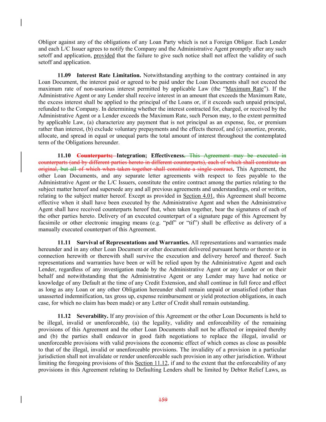 Obligor against any of the obligations of any Loan Party which is not a Foreign Obligor. Each Lender and each L/C Issuer agrees to notify the Company and the Administrative Agent promptly after any such setoff and application, provided that the failure to give such notice shall not affect the validity of such setoff and application. 11.09 Interest Rate Limitation. Notwithstanding anything to the contrary contained in any Loan Document, the interest paid or agreed to be paid under the Loan Documents shall not exceed the maximum rate of non-usurious interest permitted by applicable Law (the “Maximum Rate”). If the Administrative Agent or any Lender shall receive interest in an amount that exceeds the Maximum Rate, the excess interest shall be applied to the principal of the Loans or, if it exceeds such unpaid principal, refunded to the Company. In determining whether the interest contracted for, charged, or received by the Administrative Agent or a Lender exceeds the Maximum Rate, such Person may, to the extent permitted by applicable Law, (a) characterize any payment that is not principal as an expense, fee, or premium rather than interest, (b) exclude voluntary prepayments and the effects thereof, and (c) amortize, prorate, allocate, and spread in equal or unequal parts the total amount of interest throughout the contemplated term of the Obligations hereunder. 11.10 Counterparts; Integration; Effectiveness. This Agreement may be executed in counterparts (and by different parties hereto in different counterparts), each of which shall constitute an original, but all of which when taken together shall constitute a single contract. This Agreement, the other Loan Documents, and any separate letter agreements with respect to fees payable to the Administrative Agent or the L/C Issuers, constitute the entire contract among the parties relating to the subject matter hereof and supersede any and all previous agreements and understandings, oral or written, relating to the subject matter hereof. Except as provided in Section 4.01, this Agreement shall become effective when it shall have been executed by the Administrative Agent and when the Administrative Agent shall have received counterparts hereof that, when taken together, bear the signatures of each of the other parties hereto. Delivery of an executed counterpart of a signature page of this Agreement by facsimile or other electronic imaging means (e.g. “pdf” or “tif”) shall be effective as delivery of a manually executed counterpart of this Agreement. 11.11 Survival of Representations and Warranties. All representations and warranties made hereunder and in any other Loan Document or other document delivered pursuant hereto or thereto or in connection herewith or therewith shall survive the execution and delivery hereof and thereof. Such representations and warranties have been or will be relied upon by the Administrative Agent and each Lender, regardless of any investigation made by the Administrative Agent or any Lender or on their behalf and notwithstanding that the Administrative Agent or any Lender may have had notice or knowledge of any Default at the time of any Credit Extension, and shall continue in full force and effect as long as any Loan or any other Obligation hereunder shall remain unpaid or unsatisfied (other than unasserted indemnification, tax gross up, expense reimbursement or yield protection obligations, in each case, for which no claim has been made) or any Letter of Credit shall remain outstanding. 11.12 Severability. If any provision of this Agreement or the other Loan Documents is held to be illegal, invalid or unenforceable, (a) the legality, validity and enforceability of the remaining provisions of this Agreement and the other Loan Documents shall not be affected or impaired thereby and (b) the parties shall endeavor in good faith negotiations to replace the illegal, invalid or unenforceable provisions with valid provisions the economic effect of which comes as close as possible to that of the illegal, invalid or unenforceable provisions. The invalidity of a provision in a particular jurisdiction shall not invalidate or render unenforceable such provision in any other jurisdiction. Without limiting the foregoing provisions of this Section 11.12, if and to the extent that the enforceability of any provisions in this Agreement relating to Defaulting Lenders shall be limited by Debtor Relief Laws, as 159