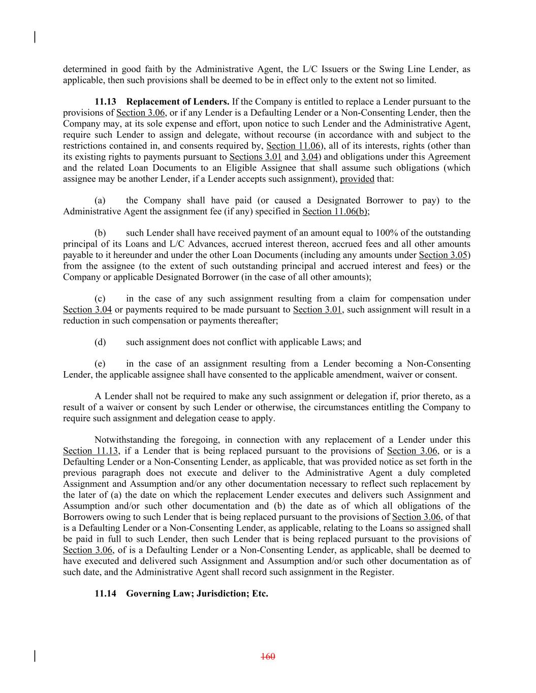 determined in good faith by the Administrative Agent, the L/C Issuers or the Swing Line Lender, as applicable, then such provisions shall be deemed to be in effect only to the extent not so limited. 11.13 Replacement of Lenders. If the Company is entitled to replace a Lender pursuant to the provisions of Section 3.06, or if any Lender is a Defaulting Lender or a Non-Consenting Lender, then the Company may, at its sole expense and effort, upon notice to such Lender and the Administrative Agent, require such Lender to assign and delegate, without recourse (in accordance with and subject to the restrictions contained in, and consents required by, Section 11.06), all of its interests, rights (other than its existing rights to payments pursuant to Sections 3.01 and 3.04) and obligations under this Agreement and the related Loan Documents to an Eligible Assignee that shall assume such obligations (which assignee may be another Lender, if a Lender accepts such assignment), provided that: (a) the Company shall have paid (or caused a Designated Borrower to pay) to the Administrative Agent the assignment fee (if any) specified in Section 11.06(b); (b) such Lender shall have received payment of an amount equal to 100% of the outstanding principal of its Loans and L/C Advances, accrued interest thereon, accrued fees and all other amounts payable to it hereunder and under the other Loan Documents (including any amounts under Section 3.05) from the assignee (to the extent of such outstanding principal and accrued interest and fees) or the Company or applicable Designated Borrower (in the case of all other amounts); (c) in the case of any such assignment resulting from a claim for compensation under Section 3.04 or payments required to be made pursuant to Section 3.01, such assignment will result in a reduction in such compensation or payments thereafter; (d) such assignment does not conflict with applicable Laws; and (e) in the case of an assignment resulting from a Lender becoming a Non-Consenting Lender, the applicable assignee shall have consented to the applicable amendment, waiver or consent. A Lender shall not be required to make any such assignment or delegation if, prior thereto, as a result of a waiver or consent by such Lender or otherwise, the circumstances entitling the Company to require such assignment and delegation cease to apply. Notwithstanding the foregoing, in connection with any replacement of a Lender under this Section 11.13, if a Lender that is being replaced pursuant to the provisions of Section 3.06, or is a Defaulting Lender or a Non-Consenting Lender, as applicable, that was provided notice as set forth in the previous paragraph does not execute and deliver to the Administrative Agent a duly completed Assignment and Assumption and/or any other documentation necessary to reflect such replacement by the later of (a) the date on which the replacement Lender executes and delivers such Assignment and Assumption and/or such other documentation and (b) the date as of which all obligations of the Borrowers owing to such Lender that is being replaced pursuant to the provisions of Section 3.06, of that is a Defaulting Lender or a Non-Consenting Lender, as applicable, relating to the Loans so assigned shall be paid in full to such Lender, then such Lender that is being replaced pursuant to the provisions of Section 3.06, of is a Defaulting Lender or a Non-Consenting Lender, as applicable, shall be deemed to have executed and delivered such Assignment and Assumption and/or such other documentation as of such date, and the Administrative Agent shall record such assignment in the Register. 11.14 Governing Law; Jurisdiction; Etc. 160