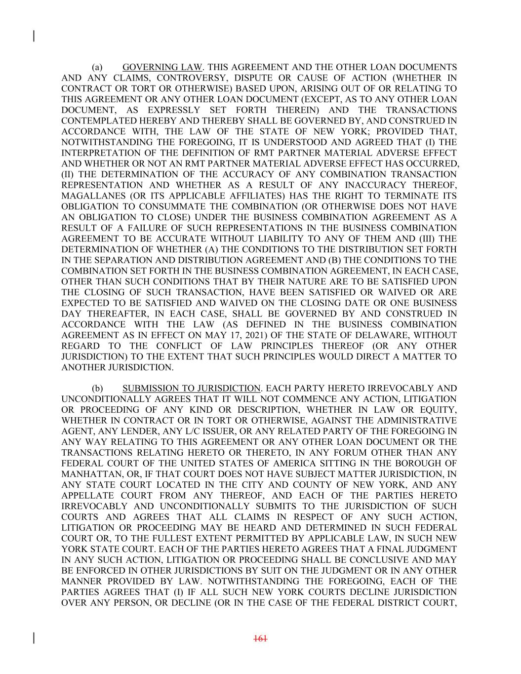 (a) GOVERNING LAW. THIS AGREEMENT AND THE OTHER LOAN DOCUMENTS AND ANY CLAIMS, CONTROVERSY, DISPUTE OR CAUSE OF ACTION (WHETHER IN CONTRACT OR TORT OR OTHERWISE) BASED UPON, ARISING OUT OF OR RELATING TO THIS AGREEMENT OR ANY OTHER LOAN DOCUMENT (EXCEPT, AS TO ANY OTHER LOAN DOCUMENT, AS EXPRESSLY SET FORTH THEREIN) AND THE TRANSACTIONS CONTEMPLATED HEREBY AND THEREBY SHALL BE GOVERNED BY, AND CONSTRUED IN ACCORDANCE WITH, THE LAW OF THE STATE OF NEW YORK; PROVIDED THAT, NOTWITHSTANDING THE FOREGOING, IT IS UNDERSTOOD AND AGREED THAT (I) THE INTERPRETATION OF THE DEFINITION OF RMT PARTNER MATERIAL ADVERSE EFFECT AND WHETHER OR NOT AN RMT PARTNER MATERIAL ADVERSE EFFECT HAS OCCURRED, (II) THE DETERMINATION OF THE ACCURACY OF ANY COMBINATION TRANSACTION REPRESENTATION AND WHETHER AS A RESULT OF ANY INACCURACY THEREOF, MAGALLANES (OR ITS APPLICABLE AFFILIATES) HAS THE RIGHT TO TERMINATE ITS OBLIGATION TO CONSUMMATE THE COMBINATION (OR OTHERWISE DOES NOT HAVE AN OBLIGATION TO CLOSE) UNDER THE BUSINESS COMBINATION AGREEMENT AS A RESULT OF A FAILURE OF SUCH REPRESENTATIONS IN THE BUSINESS COMBINATION AGREEMENT TO BE ACCURATE WITHOUT LIABILITY TO ANY OF THEM AND (III) THE DETERMINATION OF WHETHER (A) THE CONDITIONS TO THE DISTRIBUTION SET FORTH IN THE SEPARATION AND DISTRIBUTION AGREEMENT AND (B) THE CONDITIONS TO THE COMBINATION SET FORTH IN THE BUSINESS COMBINATION AGREEMENT, IN EACH CASE, OTHER THAN SUCH CONDITIONS THAT BY THEIR NATURE ARE TO BE SATISFIED UPON THE CLOSING OF SUCH TRANSACTION, HAVE BEEN SATISFIED OR WAIVED OR ARE EXPECTED TO BE SATISFIED AND WAIVED ON THE CLOSING DATE OR ONE BUSINESS DAY THEREAFTER, IN EACH CASE, SHALL BE GOVERNED BY AND CONSTRUED IN ACCORDANCE WITH THE LAW (AS DEFINED IN THE BUSINESS COMBINATION AGREEMENT AS IN EFFECT ON MAY 17, 2021) OF THE STATE OF DELAWARE, WITHOUT REGARD TO THE CONFLICT OF LAW PRINCIPLES THEREOF (OR ANY OTHER JURISDICTION) TO THE EXTENT THAT SUCH PRINCIPLES WOULD DIRECT A MATTER TO ANOTHER JURISDICTION. (b) SUBMISSION TO JURISDICTION. EACH PARTY HERETO IRREVOCABLY AND UNCONDITIONALLY AGREES THAT IT WILL NOT COMMENCE ANY ACTION, LITIGATION OR PROCEEDING OF ANY KIND OR DESCRIPTION, WHETHER IN LAW OR EQUITY, WHETHER IN CONTRACT OR IN TORT OR OTHERWISE, AGAINST THE ADMINISTRATIVE AGENT, ANY LENDER, ANY L/C ISSUER, OR ANY RELATED PARTY OF THE FOREGOING IN ANY WAY RELATING TO THIS AGREEMENT OR ANY OTHER LOAN DOCUMENT OR THE TRANSACTIONS RELATING HERETO OR THERETO, IN ANY FORUM OTHER THAN ANY FEDERAL COURT OF THE UNITED STATES OF AMERICA SITTING IN THE BOROUGH OF MANHATTAN, OR, IF THAT COURT DOES NOT HAVE SUBJECT MATTER JURISDICTION, IN ANY STATE COURT LOCATED IN THE CITY AND COUNTY OF NEW YORK, AND ANY APPELLATE COURT FROM ANY THEREOF, AND EACH OF THE PARTIES HERETO IRREVOCABLY AND UNCONDITIONALLY SUBMITS TO THE JURISDICTION OF SUCH COURTS AND AGREES THAT ALL CLAIMS IN RESPECT OF ANY SUCH ACTION, LITIGATION OR PROCEEDING MAY BE HEARD AND DETERMINED IN SUCH FEDERAL COURT OR, TO THE FULLEST EXTENT PERMITTED BY APPLICABLE LAW, IN SUCH NEW YORK STATE COURT. EACH OF THE PARTIES HERETO AGREES THAT A FINAL JUDGMENT IN ANY SUCH ACTION, LITIGATION OR PROCEEDING SHALL BE CONCLUSIVE AND MAY BE ENFORCED IN OTHER JURISDICTIONS BY SUIT ON THE JUDGMENT OR IN ANY OTHER MANNER PROVIDED BY LAW. NOTWITHSTANDING THE FOREGOING, EACH OF THE PARTIES AGREES THAT (I) IF ALL SUCH NEW YORK COURTS DECLINE JURISDICTION OVER ANY PERSON, OR DECLINE (OR IN THE CASE OF THE FEDERAL DISTRICT COURT, 161