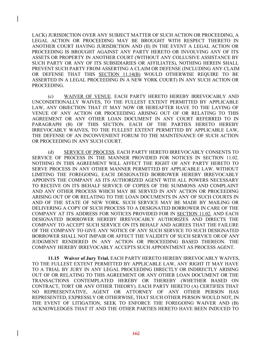 LACK) JURISDICTION OVER ANY SUBJECT MATTER OF SUCH ACTION OR PROCEEDING, A LEGAL ACTION OR PROCEEDING MAY BE BROUGHT WITH RESPECT THERETO IN ANOTHER COURT HAVING JURISDICTION AND (II) IN THE EVENT A LEGAL ACTION OR PROCEEDING IS BROUGHT AGAINST ANY PARTY HERETO OR INVOLVING ANY OF ITS ASSETS OR PROPERTY IN ANOTHER COURT (WITHOUT ANY COLLUSIVE ASSISTANCE BY SUCH PARTY OR ANY OF ITS SUBSIDIARIES OR AFFILIATES), NOTHING HEREIN SHALL PREVENT SUCH PARTY FROM ASSERTING A CLAIM OR DEFENSE (INCLUDING ANY CLAIM OR DEFENSE THAT THIS SECTION 11.14(B) WOULD OTHERWISE REQUIRE TO BE ASSERTED IN A LEGAL PROCEEDING IN A NEW YORK COURT) IN ANY SUCH ACTION OR PROCEEDING. (c) WAIVER OF VENUE. EACH PARTY HERETO HEREBY IRREVOCABLY AND UNCONDITIONALLY WAIVES, TO THE FULLEST EXTENT PERMITTED BY APPLICABLE LAW, ANY OBJECTION THAT IT MAY NOW OR HEREAFTER HAVE TO THE LAYING OF VENUE OF ANY ACTION OR PROCEEDING ARISING OUT OF OR RELATING TO THIS AGREEMENT OR ANY OTHER LOAN DOCUMENT IN ANY COURT REFERRED TO IN PARAGRAPH (B) OF THIS SECTION. EACH OF THE PARTIES HERETO HEREBY IRREVOCABLY WAIVES, TO THE FULLEST EXTENT PERMITTED BY APPLICABLE LAW, THE DEFENSE OF AN INCONVENIENT FORUM TO THE MAINTENANCE OF SUCH ACTION OR PROCEEDING IN ANY SUCH COURT. (d) SERVICE OF PROCESS. EACH PARTY HERETO IRREVOCABLY CONSENTS TO SERVICE OF PROCESS IN THE MANNER PROVIDED FOR NOTICES IN SECTION 11.02. NOTHING IN THIS AGREEMENT WILL AFFECT THE RIGHT OF ANY PARTY HERETO TO SERVE PROCESS IN ANY OTHER MANNER PERMITTED BY APPLICABLE LAW. WITHOUT LIMITING THE FOREGOING, EACH DESIGNATED BORROWER HEREBY IRREVOCABLY APPOINTS THE COMPANY AS ITS AUTHORIZED AGENT WITH ALL POWERS NECESSARY TO RECEIVE ON ITS BEHALF SERVICE OF COPIES OF THE SUMMONS AND COMPLAINT AND ANY OTHER PROCESS WHICH MAY BE SERVED IN ANY ACTION OR PROCEEDING ARISING OUT OF OR RELATING TO THE LOAN DOCUMENTS IN ANY OF SUCH COURTS IN AND OF THE STATE OF NEW YORK. SUCH SERVICE MAY BE MADE BY MAILING OR DELIVERING A COPY OF SUCH PROCESS TO A DESIGNATED BORROWER IN CARE OF THE COMPANY AT ITS ADDRESS FOR NOTICES PROVIDED FOR IN SECTION 11.02, AND EACH DESIGNATED BORROWER HEREBY IRREVOCABLY AUTHORIZES AND DIRECTS THE COMPANY TO ACCEPT SUCH SERVICE ON ITS BEHALF AND AGREES THAT THE FAILURE OF THE COMPANY TO GIVE ANY NOTICE OF ANY SUCH SERVICE TO SUCH DESIGNATED BORROWER SHALL NOT IMPAIR OR AFFECT THE VALIDITY OF SUCH SERVICE OR OF ANY JUDGMENT RENDERED IN ANY ACTION OR PROCEEDING BASED THEREON. THE COMPANY HEREBY IRREVOCABLY ACCEPTS SUCH APPOINTMENT AS PROCESS AGENT. 11.15 Waiver of Jury Trial. EACH PARTY HERETO HEREBY IRREVOCABLY WAIVES, TO THE FULLEST EXTENT PERMITTED BY APPLICABLE LAW, ANY RIGHT IT MAY HAVE TO A TRIAL BY JURY IN ANY LEGAL PROCEEDING DIRECTLY OR INDIRECTLY ARISING OUT OF OR RELATING TO THIS AGREEMENT OR ANY OTHER LOAN DOCUMENT OR THE TRANSACTIONS CONTEMPLATED HEREBY OR THEREBY (WHETHER BASED ON CONTRACT, TORT OR ANY OTHER THEORY). EACH PARTY HERETO (A) CERTIFIES THAT NO REPRESENTATIVE, AGENT OR ATTORNEY OF ANY OTHER PERSON HAS REPRESENTED, EXPRESSLY OR OTHERWISE, THAT SUCH OTHER PERSON WOULD NOT, IN THE EVENT OF LITIGATION, SEEK TO ENFORCE THE FOREGOING WAIVER AND (B) ACKNOWLEDGES THAT IT AND THE OTHER PARTIES HERETO HAVE BEEN INDUCED TO 162
