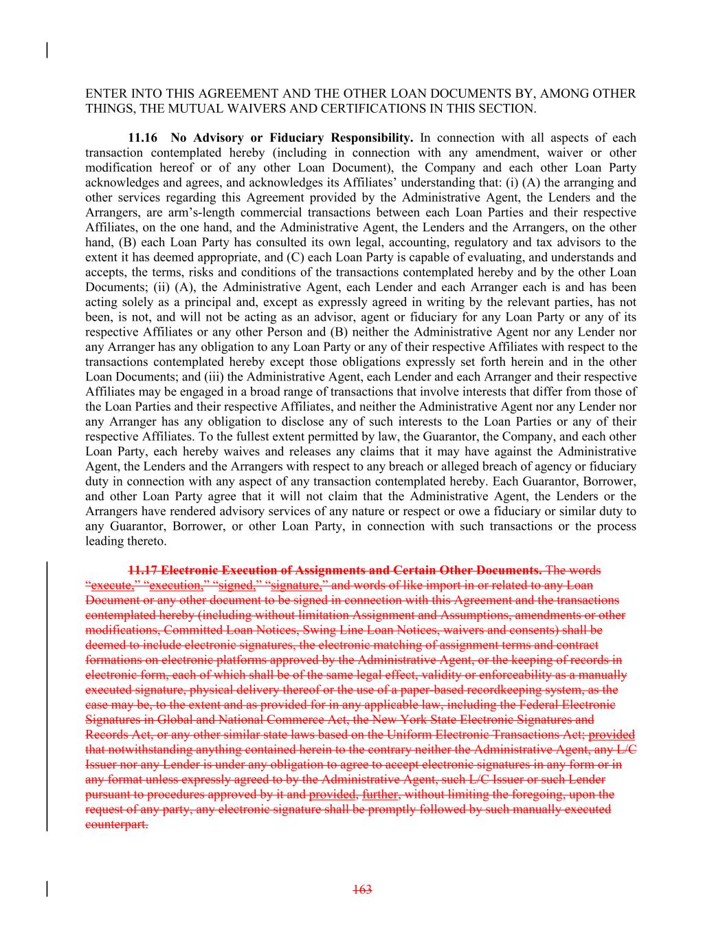 ENTER INTO THIS AGREEMENT AND THE OTHER LOAN DOCUMENTS BY, AMONG OTHER THINGS, THE MUTUAL WAIVERS AND CERTIFICATIONS IN THIS SECTION. 11.16 No Advisory or Fiduciary Responsibility. In connection with all aspects of each transaction contemplated hereby (including in connection with any amendment, waiver or other modification hereof or of any other Loan Document), the Company and each other Loan Party acknowledges and agrees, and acknowledges its Affiliates’ understanding that: (i) (A) the arranging and other services regarding this Agreement provided by the Administrative Agent, the Lenders and the Arrangers, are arm’s-length commercial transactions between each Loan Parties and their respective Affiliates, on the one hand, and the Administrative Agent, the Lenders and the Arrangers, on the other hand, (B) each Loan Party has consulted its own legal, accounting, regulatory and tax advisors to the extent it has deemed appropriate, and (C) each Loan Party is capable of evaluating, and understands and accepts, the terms, risks and conditions of the transactions contemplated hereby and by the other Loan Documents; (ii) (A), the Administrative Agent, each Lender and each Arranger each is and has been acting solely as a principal and, except as expressly agreed in writing by the relevant parties, has not been, is not, and will not be acting as an advisor, agent or fiduciary for any Loan Party or any of its respective Affiliates or any other Person and (B) neither the Administrative Agent nor any Lender nor any Arranger has any obligation to any Loan Party or any of their respective Affiliates with respect to the transactions contemplated hereby except those obligations expressly set forth herein and in the other Loan Documents; and (iii) the Administrative Agent, each Lender and each Arranger and their respective Affiliates may be engaged in a broad range of transactions that involve interests that differ from those of the Loan Parties and their respective Affiliates, and neither the Administrative Agent nor any Lender nor any Arranger has any obligation to disclose any of such interests to the Loan Parties or any of their respective Affiliates. To the fullest extent permitted by law, the Guarantor, the Company, and each other Loan Party, each hereby waives and releases any claims that it may have against the Administrative Agent, the Lenders and the Arrangers with respect to any breach or alleged breach of agency or fiduciary duty in connection with any aspect of any transaction contemplated hereby. Each Guarantor, Borrower, and other Loan Party agree that it will not claim that the Administrative Agent, the Lenders or the Arrangers have rendered advisory services of any nature or respect or owe a fiduciary or similar duty to any Guarantor, Borrower, or other Loan Party, in connection with such transactions or the process leading thereto. 11.17 Electronic Execution of Assignments and Certain Other Documents. The words “execute,” “execution,” “signed,” “signature,” and words of like import in or related to any Loan Document or any other document to be signed in connection with this Agreement and the transactions contemplated hereby (including without limitation Assignment and Assumptions, amendments or other modifications, Committed Loan Notices, Swing Line Loan Notices, waivers and consents) shall be deemed to include electronic signatures, the electronic matching of assignment terms and contract formations on electronic platforms approved by the Administrative Agent, or the keeping of records in electronic form, each of which shall be of the same legal effect, validity or enforceability as a manually executed signature, physical delivery thereof or the use of a paper-based recordkeeping system, as the case may be, to the extent and as provided for in any applicable law, including the Federal Electronic Signatures in Global and National Commerce Act, the New York State Electronic Signatures and Records Act, or any other similar state laws based on the Uniform Electronic Transactions Act; provided that notwithstanding anything contained herein to the contrary neither the Administrative Agent, any L/C Issuer nor any Lender is under any obligation to agree to accept electronic signatures in any form or in any format unless expressly agreed to by the Administrative Agent, such L/C Issuer or such Lender pursuant to procedures approved by it and provided, further, without limiting the foregoing, upon the request of any party, any electronic signature shall be promptly followed by such manually executed counterpart. 163