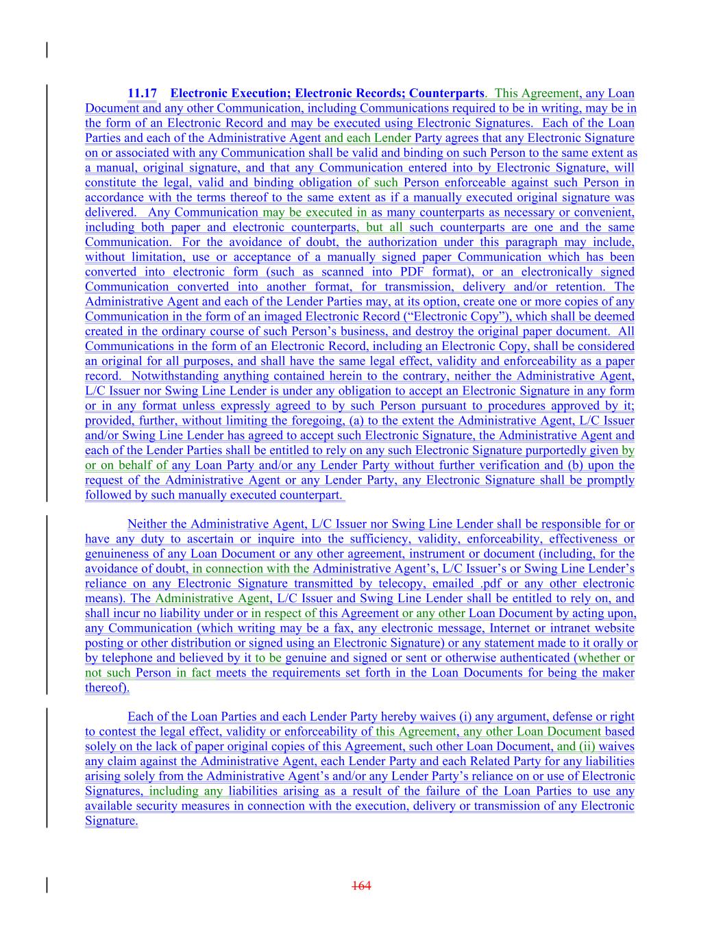 11.17 Electronic Execution; Electronic Records; Counterparts. This Agreement, any Loan Document and any other Communication, including Communications required to be in writing, may be in the form of an Electronic Record and may be executed using Electronic Signatures. Each of the Loan Parties and each of the Administrative Agent and each Lender Party agrees that any Electronic Signature on or associated with any Communication shall be valid and binding on such Person to the same extent as a manual, original signature, and that any Communication entered into by Electronic Signature, will constitute the legal, valid and binding obligation of such Person enforceable against such Person in accordance with the terms thereof to the same extent as if a manually executed original signature was delivered. Any Communication may be executed in as many counterparts as necessary or convenient, including both paper and electronic counterparts, but all such counterparts are one and the same Communication. For the avoidance of doubt, the authorization under this paragraph may include, without limitation, use or acceptance of a manually signed paper Communication which has been converted into electronic form (such as scanned into PDF format), or an electronically signed Communication converted into another format, for transmission, delivery and/or retention. The Administrative Agent and each of the Lender Parties may, at its option, create one or more copies of any Communication in the form of an imaged Electronic Record (“Electronic Copy”), which shall be deemed created in the ordinary course of such Person’s business, and destroy the original paper document. All Communications in the form of an Electronic Record, including an Electronic Copy, shall be considered an original for all purposes, and shall have the same legal effect, validity and enforceability as a paper record. Notwithstanding anything contained herein to the contrary, neither the Administrative Agent, L/C Issuer nor Swing Line Lender is under any obligation to accept an Electronic Signature in any form or in any format unless expressly agreed to by such Person pursuant to procedures approved by it; provided, further, without limiting the foregoing, (a) to the extent the Administrative Agent, L/C Issuer and/or Swing Line Lender has agreed to accept such Electronic Signature, the Administrative Agent and each of the Lender Parties shall be entitled to rely on any such Electronic Signature purportedly given by or on behalf of any Loan Party and/or any Lender Party without further verification and (b) upon the request of the Administrative Agent or any Lender Party, any Electronic Signature shall be promptly followed by such manually executed counterpart. Neither the Administrative Agent, L/C Issuer nor Swing Line Lender shall be responsible for or have any duty to ascertain or inquire into the sufficiency, validity, enforceability, effectiveness or genuineness of any Loan Document or any other agreement, instrument or document (including, for the avoidance of doubt, in connection with the Administrative Agent’s, L/C Issuer’s or Swing Line Lender’s reliance on any Electronic Signature transmitted by telecopy, emailed .pdf or any other electronic means). The Administrative Agent, L/C Issuer and Swing Line Lender shall be entitled to rely on, and shall incur no liability under or in respect of this Agreement or any other Loan Document by acting upon, any Communication (which writing may be a fax, any electronic message, Internet or intranet website posting or other distribution or signed using an Electronic Signature) or any statement made to it orally or by telephone and believed by it to be genuine and signed or sent or otherwise authenticated (whether or not such Person in fact meets the requirements set forth in the Loan Documents for being the maker thereof). Each of the Loan Parties and each Lender Party hereby waives (i) any argument, defense or right to contest the legal effect, validity or enforceability of this Agreement, any other Loan Document based solely on the lack of paper original copies of this Agreement, such other Loan Document, and (ii) waives any claim against the Administrative Agent, each Lender Party and each Related Party for any liabilities arising solely from the Administrative Agent’s and/or any Lender Party’s reliance on or use of Electronic Signatures, including any liabilities arising as a result of the failure of the Loan Parties to use any available security measures in connection with the execution, delivery or transmission of any Electronic Signature. 164