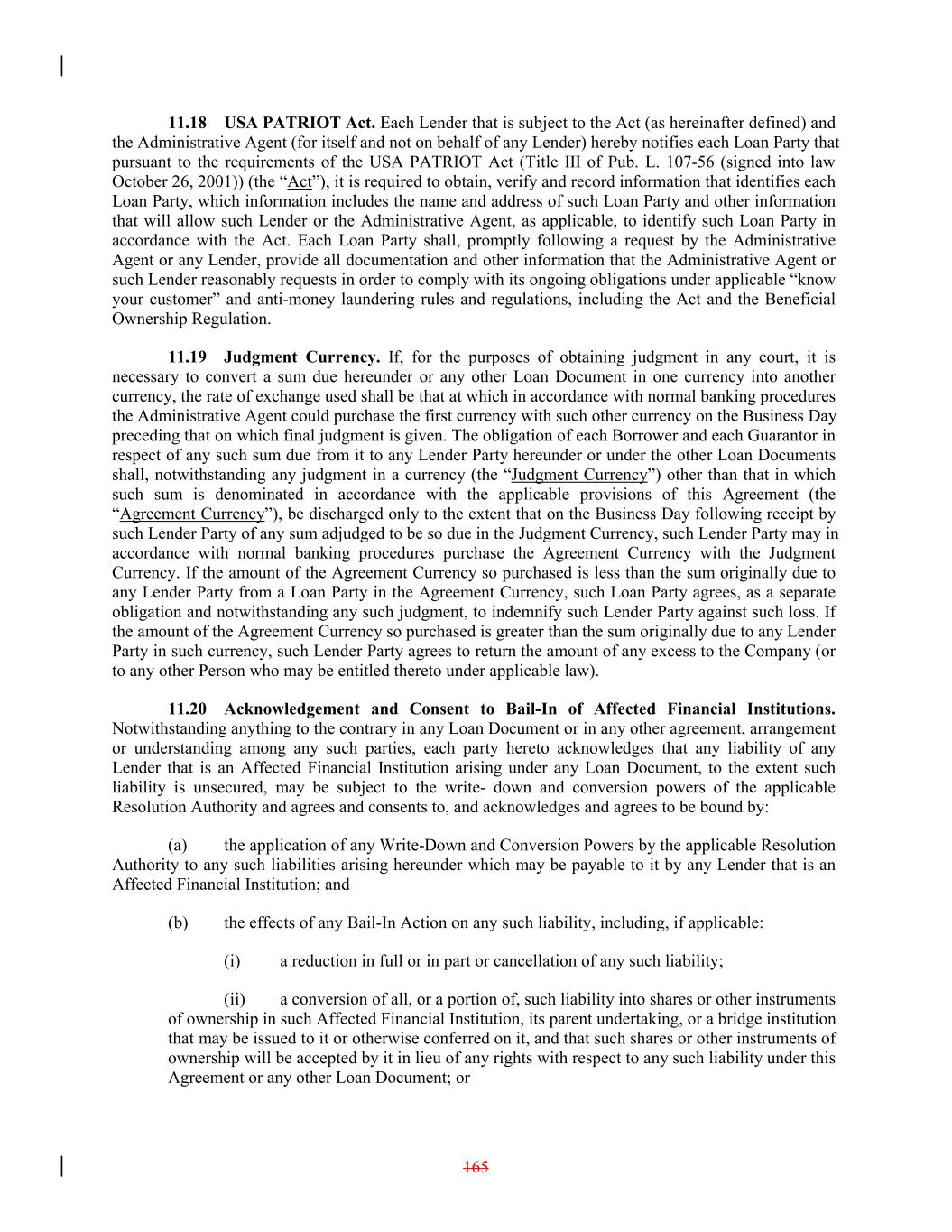 11.18 USA PATRIOT Act. Each Lender that is subject to the Act (as hereinafter defined) and the Administrative Agent (for itself and not on behalf of any Lender) hereby notifies each Loan Party that pursuant to the requirements of the USA PATRIOT Act (Title III of Pub. L. 107-56 (signed into law October 26, 2001)) (the “Act”), it is required to obtain, verify and record information that identifies each Loan Party, which information includes the name and address of such Loan Party and other information that will allow such Lender or the Administrative Agent, as applicable, to identify such Loan Party in accordance with the Act. Each Loan Party shall, promptly following a request by the Administrative Agent or any Lender, provide all documentation and other information that the Administrative Agent or such Lender reasonably requests in order to comply with its ongoing obligations under applicable “know your customer” and anti-money laundering rules and regulations, including the Act and the Beneficial Ownership Regulation. 11.19 Judgment Currency. If, for the purposes of obtaining judgment in any court, it is necessary to convert a sum due hereunder or any other Loan Document in one currency into another currency, the rate of exchange used shall be that at which in accordance with normal banking procedures the Administrative Agent could purchase the first currency with such other currency on the Business Day preceding that on which final judgment is given. The obligation of each Borrower and each Guarantor in respect of any such sum due from it to any Lender Party hereunder or under the other Loan Documents shall, notwithstanding any judgment in a currency (the “Judgment Currency”) other than that in which such sum is denominated in accordance with the applicable provisions of this Agreement (the “Agreement Currency”), be discharged only to the extent that on the Business Day following receipt by such Lender Party of any sum adjudged to be so due in the Judgment Currency, such Lender Party may in accordance with normal banking procedures purchase the Agreement Currency with the Judgment Currency. If the amount of the Agreement Currency so purchased is less than the sum originally due to any Lender Party from a Loan Party in the Agreement Currency, such Loan Party agrees, as a separate obligation and notwithstanding any such judgment, to indemnify such Lender Party against such loss. If the amount of the Agreement Currency so purchased is greater than the sum originally due to any Lender Party in such currency, such Lender Party agrees to return the amount of any excess to the Company (or to any other Person who may be entitled thereto under applicable law). 11.20 Acknowledgement and Consent to Bail-In of Affected Financial Institutions. Notwithstanding anything to the contrary in any Loan Document or in any other agreement, arrangement or understanding among any such parties, each party hereto acknowledges that any liability of any Lender that is an Affected Financial Institution arising under any Loan Document, to the extent such liability is unsecured, may be subject to the write- down and conversion powers of the applicable Resolution Authority and agrees and consents to, and acknowledges and agrees to be bound by: (a) the application of any Write-Down and Conversion Powers by the applicable Resolution Authority to any such liabilities arising hereunder which may be payable to it by any Lender that is an Affected Financial Institution; and (b) the effects of any Bail-In Action on any such liability, including, if applicable: (i) a reduction in full or in part or cancellation of any such liability; (ii) a conversion of all, or a portion of, such liability into shares or other instruments of ownership in such Affected Financial Institution, its parent undertaking, or a bridge institution that may be issued to it or otherwise conferred on it, and that such shares or other instruments of ownership will be accepted by it in lieu of any rights with respect to any such liability under this Agreement or any other Loan Document; or 165