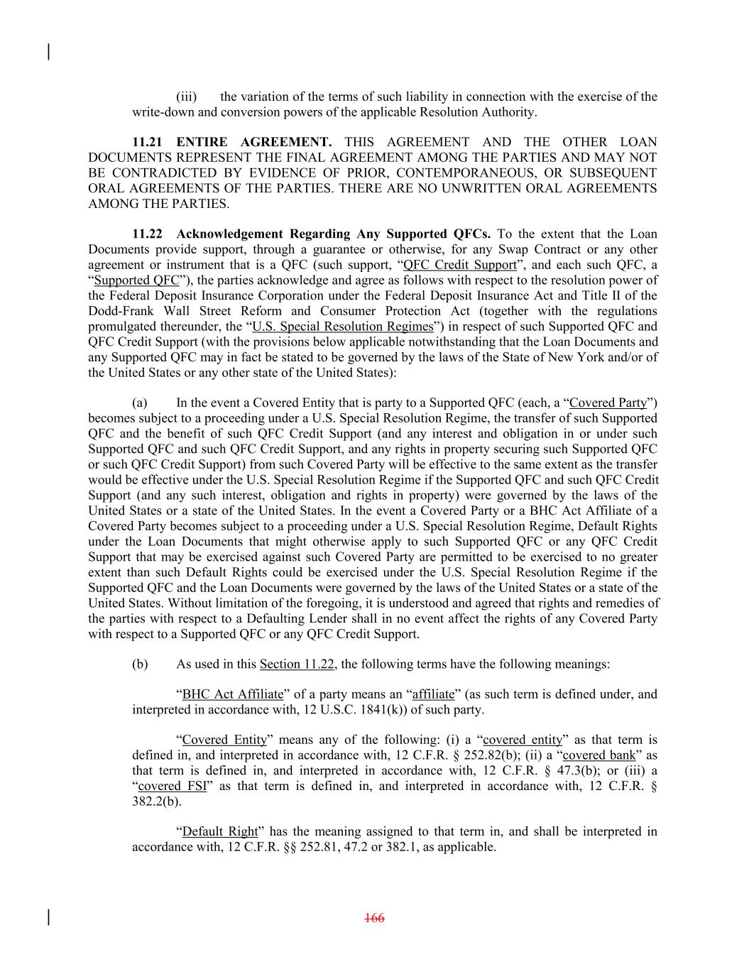 (iii) the variation of the terms of such liability in connection with the exercise of the write-down and conversion powers of the applicable Resolution Authority. 11.21 ENTIRE AGREEMENT. THIS AGREEMENT AND THE OTHER LOAN DOCUMENTS REPRESENT THE FINAL AGREEMENT AMONG THE PARTIES AND MAY NOT BE CONTRADICTED BY EVIDENCE OF PRIOR, CONTEMPORANEOUS, OR SUBSEQUENT ORAL AGREEMENTS OF THE PARTIES. THERE ARE NO UNWRITTEN ORAL AGREEMENTS AMONG THE PARTIES. 11.22 Acknowledgement Regarding Any Supported QFCs. To the extent that the Loan Documents provide support, through a guarantee or otherwise, for any Swap Contract or any other agreement or instrument that is a QFC (such support, “QFC Credit Support”, and each such QFC, a “Supported QFC”), the parties acknowledge and agree as follows with respect to the resolution power of the Federal Deposit Insurance Corporation under the Federal Deposit Insurance Act and Title II of the Dodd-Frank Wall Street Reform and Consumer Protection Act (together with the regulations promulgated thereunder, the “U.S. Special Resolution Regimes”) in respect of such Supported QFC and QFC Credit Support (with the provisions below applicable notwithstanding that the Loan Documents and any Supported QFC may in fact be stated to be governed by the laws of the State of New York and/or of the United States or any other state of the United States): (a) In the event a Covered Entity that is party to a Supported QFC (each, a “Covered Party”) becomes subject to a proceeding under a U.S. Special Resolution Regime, the transfer of such Supported QFC and the benefit of such QFC Credit Support (and any interest and obligation in or under such Supported QFC and such QFC Credit Support, and any rights in property securing such Supported QFC or such QFC Credit Support) from such Covered Party will be effective to the same extent as the transfer would be effective under the U.S. Special Resolution Regime if the Supported QFC and such QFC Credit Support (and any such interest, obligation and rights in property) were governed by the laws of the United States or a state of the United States. In the event a Covered Party or a BHC Act Affiliate of a Covered Party becomes subject to a proceeding under a U.S. Special Resolution Regime, Default Rights under the Loan Documents that might otherwise apply to such Supported QFC or any QFC Credit Support that may be exercised against such Covered Party are permitted to be exercised to no greater extent than such Default Rights could be exercised under the U.S. Special Resolution Regime if the Supported QFC and the Loan Documents were governed by the laws of the United States or a state of the United States. Without limitation of the foregoing, it is understood and agreed that rights and remedies of the parties with respect to a Defaulting Lender shall in no event affect the rights of any Covered Party with respect to a Supported QFC or any QFC Credit Support. (b) As used in this Section 11.22, the following terms have the following meanings: “BHC Act Affiliate” of a party means an “affiliate” (as such term is defined under, and interpreted in accordance with, 12 U.S.C. 1841(k)) of such party. “Covered Entity” means any of the following: (i) a “covered entity” as that term is defined in, and interpreted in accordance with, 12 C.F.R. § 252.82(b); (ii) a “covered bank” as that term is defined in, and interpreted in accordance with, 12 C.F.R. § 47.3(b); or (iii) a “covered FSI” as that term is defined in, and interpreted in accordance with, 12 C.F.R. § 382.2(b). “Default Right” has the meaning assigned to that term in, and shall be interpreted in accordance with, 12 C.F.R. §§ 252.81, 47.2 or 382.1, as applicable. 166
