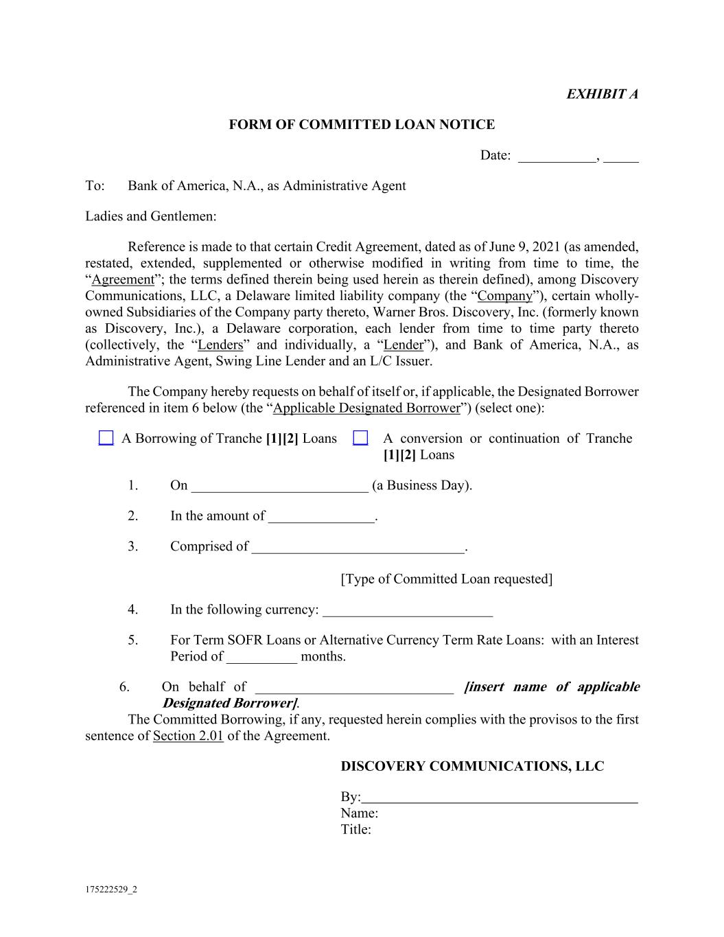 175222529_2 EXHIBIT A FORM OF COMMITTED LOAN NOTICE Date: ___________, _____ To: Bank of America, N.A., as Administrative Agent Ladies and Gentlemen: Reference is made to that certain Credit Agreement, dated as of June 9, 2021 (as amended, restated, extended, supplemented or otherwise modified in writing from time to time, the “Agreement”; the terms defined therein being used herein as therein defined), among Discovery Communications, LLC, a Delaware limited liability company (the “Company”), certain wholly- owned Subsidiaries of the Company party thereto, Warner Bros. Discovery, Inc. (formerly known as Discovery, Inc.), a Delaware corporation, each lender from time to time party thereto (collectively, the “Lenders” and individually, a “Lender”), and Bank of America, N.A., as Administrative Agent, Swing Line Lender and an L/C Issuer. The Company hereby requests on behalf of itself or, if applicable, the Designated Borrower referenced in item 6 below (the “Applicable Designated Borrower”) (select one): A Borrowing of Tranche [1][2] Loans A conversion or continuation of Tranche [1][2] Loans 1. On _________________________ (a Business Day). 2. In the amount of _______________. 3. Comprised of ______________________________. [Type of Committed Loan requested] 4. In the following currency: ________________________ 5. For Term SOFR Loans or Alternative Currency Term Rate Loans: with an Interest Period of __________ months. 6. On behalf of ____________________________ [insert name of applicable Designated Borrower]. The Committed Borrowing, if any, requested herein complies with the provisos to the first sentence of Section 2.01 of the Agreement. DISCOVERY COMMUNICATIONS, LLC By: Name: Title: