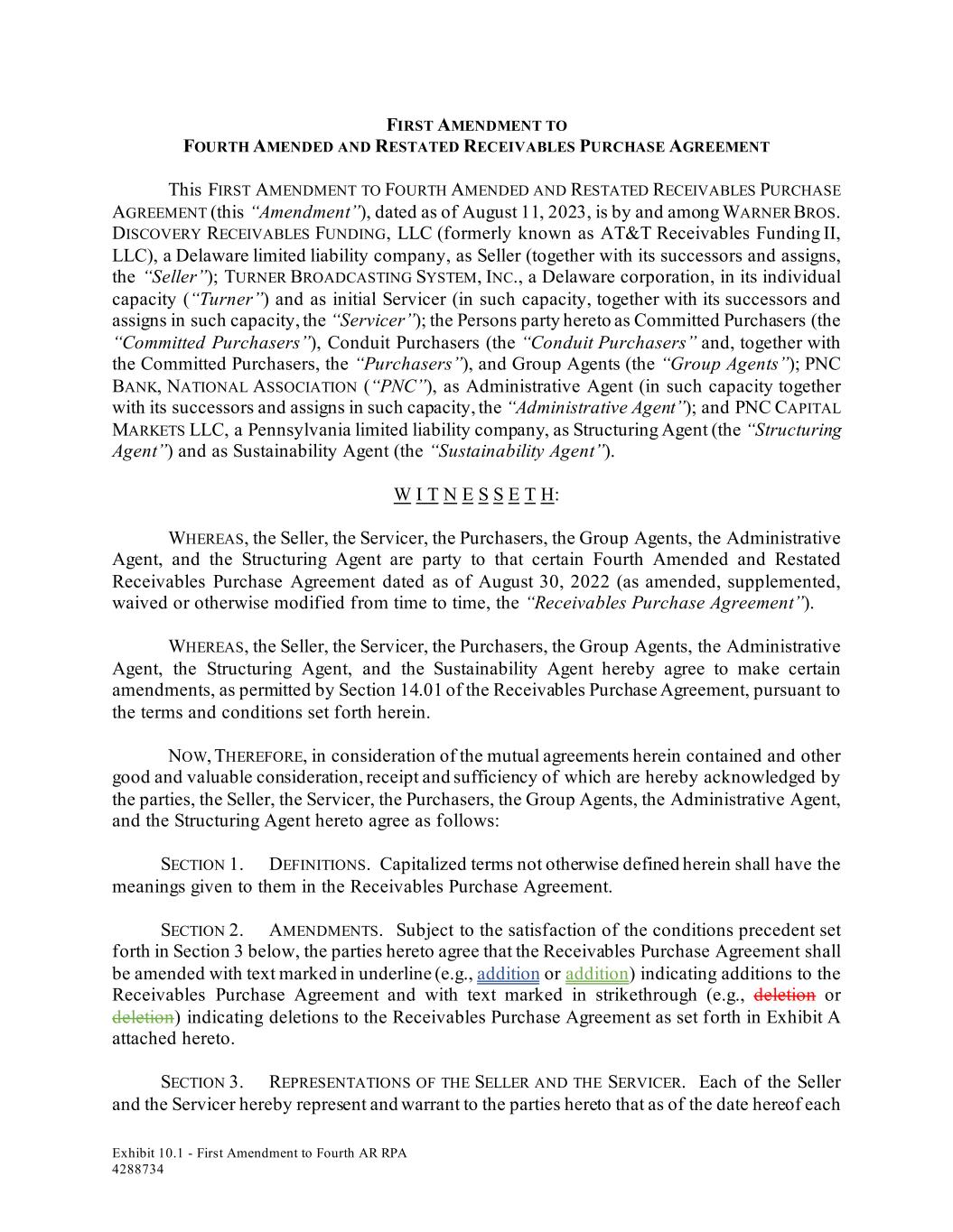 Exhibit 10.1 - First Amendment to Fourth AR RPA 4288734 FIRST AMENDMENT TO FOURTH AMENDED AND RESTATED RECEIVABLES PURCHASE AGREEMENT This FIRST AMENDMENT TO FOURTH AMENDED AND RESTATED RECEIVABLES PURCHASE AGREEMENT (this “Amendment”), dated as of August 11, 2023, is by and among WARNER BROS. DISCOVERY RECEIVABLES FUNDING, LLC (formerly known as AT&T Receivables Funding II, LLC), a Delaware limited liability company, as Seller (together with its successors and assigns, the “Seller”); TURNER BROADCASTING SYSTEM, INC., a Delaware corporation, in its individual capacity (“Turner”) and as initial Servicer (in such capacity, together with its successors and assigns in such capacity, the “Servicer”); the Persons party hereto as Committed Purchasers (the “Committed Purchasers”), Conduit Purchasers (the “Conduit Purchasers” and, together with the Committed Purchasers, the “Purchasers”), and Group Agents (the “Group Agents”); PNC BANK, NATIONAL ASSOCIATION (“PNC”), as Administrative Agent (in such capacity together with its successors and assigns in such capacity, the “Administrative Agent”); and PNC CAPITAL MARKETS LLC, a Pennsylvania limited liability company, as Structuring Agent (the “Structuring Agent”) and as Sustainability Agent (the “Sustainability Agent”). W I T N E S S E T H: WHEREAS, the Seller, the Servicer, the Purchasers, the Group Agents, the Administrative Agent, and the Structuring Agent are party to that certain Fourth Amended and Restated Receivables Purchase Agreement dated as of August 30, 2022 (as amended, supplemented, waived or otherwise modified from time to time, the “Receivables Purchase Agreement”). WHEREAS, the Seller, the Servicer, the Purchasers, the Group Agents, the Administrative Agent, the Structuring Agent, and the Sustainability Agent hereby agree to make certain amendments, as permitted by Section 14.01 of the Receivables Purchase Agreement, pursuant to the terms and conditions set forth herein. NOW, THEREFORE, in consideration of the mutual agreements herein contained and other good and valuable consideration, receipt and sufficiency of which are hereby acknowledged by the parties, the Seller, the Servicer, the Purchasers, the Group Agents, the Administrative Agent, and the Structuring Agent hereto agree as follows: SECTION 1. DEFINITIONS. Capitalized terms not otherwise defined herein shall have the meanings given to them in the Receivables Purchase Agreement. SECTION 2. AMENDMENTS. Subject to the satisfaction of the conditions precedent set forth in Section 3 below, the parties hereto agree that the Receivables Purchase Agreement shall be amended with text marked in underline (e.g., addition or addition) indicating additions to the Receivables Purchase Agreement and with text marked in strikethrough (e.g., deletion or deletion) indicating deletions to the Receivables Purchase Agreement as set forth in Exhibit A attached hereto. SECTION 3. REPRESENTATIONS OF THE SELLER AND THE SERVICER. Each of the Seller and the Servicer hereby represent and warrant to the parties hereto that as of the date hereof each