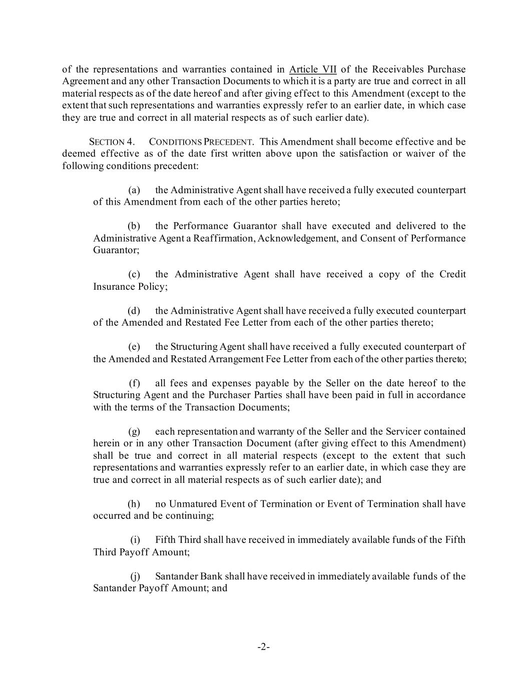 -2- of the representations and warranties contained in Article VII of the Receivables Purchase Agreement and any other Transaction Documents to which it is a party are true and correct in all material respects as of the date hereof and after giving effect to this Amendment (except to the extent that such representations and warranties expressly refer to an earlier date, in which case they are true and correct in all material respects as of such earlier date). SECTION 4. CONDITIONS PRECEDENT. This Amendment shall become effective and be deemed effective as of the date first written above upon the satisfaction or waiver of the following conditions precedent: (a) the Administrative Agent shall have received a fully executed counterpart of this Amendment from each of the other parties hereto; (b) the Performance Guarantor shall have executed and delivered to the Administrative Agent a Reaffirmation, Acknowledgement, and Consent of Performance Guarantor; (c) the Administrative Agent shall have received a copy of the Credit Insurance Policy; (d) the Administrative Agent shall have received a fully executed counterpart of the Amended and Restated Fee Letter from each of the other parties thereto; (e) the Structuring Agent shall have received a fully executed counterpart of the Amended and Restated Arrangement Fee Letter from each of the other parties thereto; (f) all fees and expenses payable by the Seller on the date hereof to the Structuring Agent and the Purchaser Parties shall have been paid in full in accordance with the terms of the Transaction Documents; (g) each representation and warranty of the Seller and the Servicer contained herein or in any other Transaction Document (after giving effect to this Amendment) shall be true and correct in all material respects (except to the extent that such representations and warranties expressly refer to an earlier date, in which case they are true and correct in all material respects as of such earlier date); and (h) no Unmatured Event of Termination or Event of Termination shall have occurred and be continuing; (i) Fifth Third shall have received in immediately available funds of the Fifth Third Payoff Amount; (j) Santander Bank shall have received in immediately available funds of the Santander Payoff Amount; and