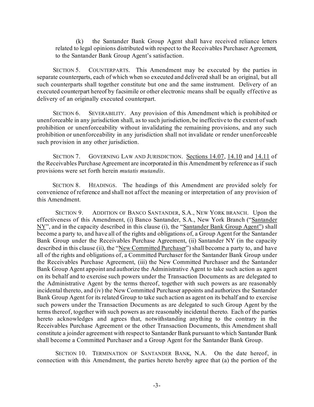 -3- (k) the Santander Bank Group Agent shall have received reliance letters related to legal opinions distributed with respect to the Receivables Purchaser Agreement, to the Santander Bank Group Agent’s satisfaction. SECTION 5. COUNTERPARTS. This Amendment may be executed by the parties in separate counterparts, each of which when so executed and delivered shall be an original, but all such counterparts shall together constitute but one and the same instrument. Delivery of an executed counterpart hereof by facsimile or other electronic means shall be equally effective as delivery of an originally executed counterpart. SECTION 6. SEVERABILITY. Any provision of this Amendment which is prohibited or unenforceable in any jurisdiction shall, as to such jurisdiction, be ineffective to the extent of such prohibition or unenforceability without invalidating the remaining provisions, and any such prohibition or unenforceability in any jurisdiction shall not invalidate or render unenforceable such provision in any other jurisdiction. SECTION 7. GOVERNING LAW AND JURISDICTION. Sections 14.07, 14.10 and 14.11 of the Receivables Purchase Agreement are incorporated in this Amendment by reference as if such provisions were set forth herein mutatis mutandis. SECTION 8. HEADINGS. The headings of this Amendment are provided solely for convenience of reference and shall not affect the meaning or interpretation of any provision of this Amendment. SECTION 9. ADDITION OF BANCO SANTANDER, S.A., NEW YORK BRANCH. Upon the effectiveness of this Amendment, (i) Banco Santander, S.A., New York Branch (“Santander NY”, and in the capacity described in this clause (i), the “Santander Bank Group Agent”) shall become a party to, and have all of the rights and obligations of, a Group Agent for the Santander Bank Group under the Receivables Purchase Agreement, (ii) Santander NY (in the capacity described in this clause (ii), the “New Committed Purchaser”) shall become a party to, and have all of the rights and obligations of, a Committed Purchaser for the Santander Bank Group under the Receivables Purchase Agreement, (iii) the New Committed Purchaser and the Santander Bank Group Agent appoint and authorize the Administrative Agent to take such action as agent on its behalf and to exercise such powers under the Transaction Documents as are delegated to the Administrative Agent by the terms thereof, together with such powers as are reasonably incidental thereto, and (iv) the New Committed Purchaser appoints and authorizes the Santander Bank Group Agent for its related Group to take such action as agent on its behalf and to exercise such powers under the Transaction Documents as are delegated to such Group Agent by the terms thereof, together with such powers as are reasonably incidental thereto. Each of the parties hereto acknowledges and agrees that, notwithstanding anything to the contrary in the Receivables Purchase Agreement or the other Transaction Documents, this Amendment shall constitute a joinder agreement with respect to Santander Bank pursuant to which Santander Bank shall become a Committed Purchaser and a Group Agent for the Santander Bank Group. SECTION 10. TERMINATION OF SANTANDER BANK, N.A. On the date hereof, in connection with this Amendment, the parties hereto hereby agree that (a) the portion of the