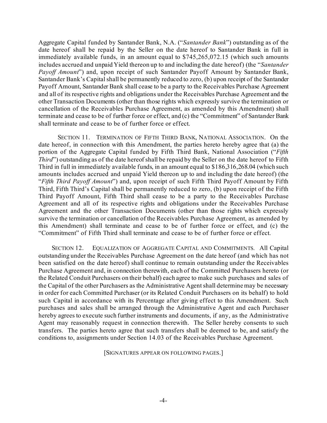 -4- Aggregate Capital funded by Santander Bank, N.A. (“Santander Bank”) outstanding as of the date hereof shall be repaid by the Seller on the date hereof to Santander Bank in full in immediately available funds, in an amount equal to $745,265,072.15 (which such amounts includes accrued and unpaid Yield thereon up to and including the date hereof) (the “Santander Payoff Amount”) and, upon receipt of such Santander Payoff Amount by Santander Bank, Santander Bank’s Capital shall be permanently reduced to zero, (b) upon receipt of the Santander Payoff Amount, Santander Bank shall cease to be a party to the Receivables Purchase Agreement and all of its respective rights and obligations under the Receivables Purchase Agreement and the other Transaction Documents (other than those rights which expressly survive the termination or cancellation of the Receivables Purchase Agreement, as amended by this Amendment) shall terminate and cease to be of further force or effect, and (c) the “Commitment” of Santander Bank shall terminate and cease to be of further force or effect. SECTION 11. TERMINATION OF FIFTH THIRD BANK, NATIONAL ASSOCIATION. On the date hereof, in connection with this Amendment, the parties hereto hereby agree that (a) the portion of the Aggregate Capital funded by Fifth Third Bank, National Association (“Fifth Third”) outstanding as of the date hereof shall be repaid by the Seller on the date hereof to Fifth Third in full in immediately available funds, in an amount equal to $186,316,268.04 (which such amounts includes accrued and unpaid Yield thereon up to and including the date hereof) (the “Fifth Third Payoff Amount”) and, upon receipt of such Fifth Third Payoff Amount by Fifth Third, Fifth Third’s Capital shall be permanently reduced to zero, (b) upon receipt of the Fifth Third Payoff Amount, Fifth Third shall cease to be a party to the Receivables Purchase Agreement and all of its respective rights and obligations under the Receivables Purchase Agreement and the other Transaction Documents (other than those rights which expressly survive the termination or cancellation of the Receivables Purchase Agreement, as amended by this Amendment) shall terminate and cease to be of further force or effect, and (c) the “Commitment” of Fifth Third shall terminate and cease to be of further force or effect. SECTION 12. EQUALIZATION OF AGGREGATE CAPITAL AND COMMITMENTS. All Capital outstanding under the Receivables Purchase Agreement on the date hereof (and which has not been satisfied on the date hereof) shall continue to remain outstanding under the Receivables Purchase Agreement and, in connection therewith, each of the Committed Purchasers hereto (or the Related Conduit Purchasers on their behalf) each agree to make such purchases and sales of the Capital of the other Purchasers as the Administrative Agent shall determine may be necessary in order for each Committed Purchaser (or its Related Conduit Purchasers on its behalf) to hold such Capital in accordance with its Percentage after giving effect to this Amendment. Such purchases and sales shall be arranged through the Administrative Agent and each Purchaser hereby agrees to execute such further instruments and documents, if any, as the Administrative Agent may reasonably request in connection therewith. The Seller hereby consents to such transfers. The parties hereto agree that such transfers shall be deemed to be, and satisfy the conditions to, assignments under Section 14.03 of the Receivables Purchase Agreement. [SIGNATURES APPEAR ON FOLLOWING PAGES.]
