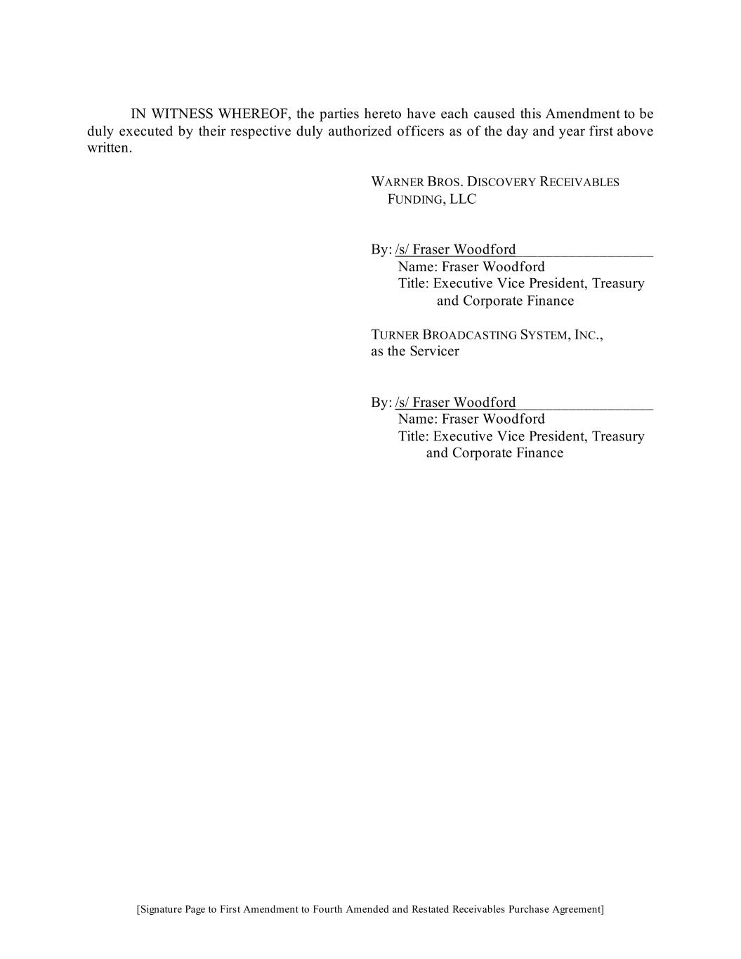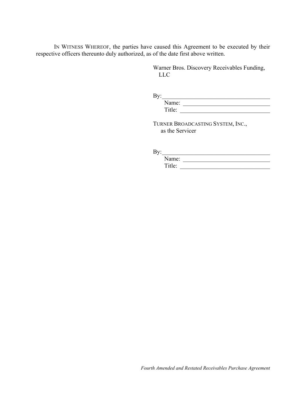 Fourth Amended and Restated Receivables Purchase Agreement IN WITNESS WHEREOF, the parties have caused this Agreement to be executed by their respective officers thereunto duly authorized, as of the date first above written. Warner Bros. Discovery Receivables Funding, LLC By:____________________________________ Name: _____________________________ Title: ______________________________ TURNER BROADCASTING SYSTEM, INC., as the Servicer By:____________________________________ Name: _____________________________ Title: ______________________________