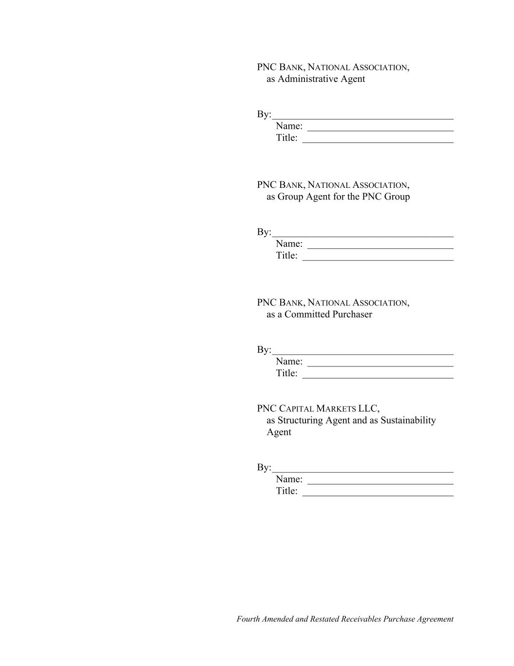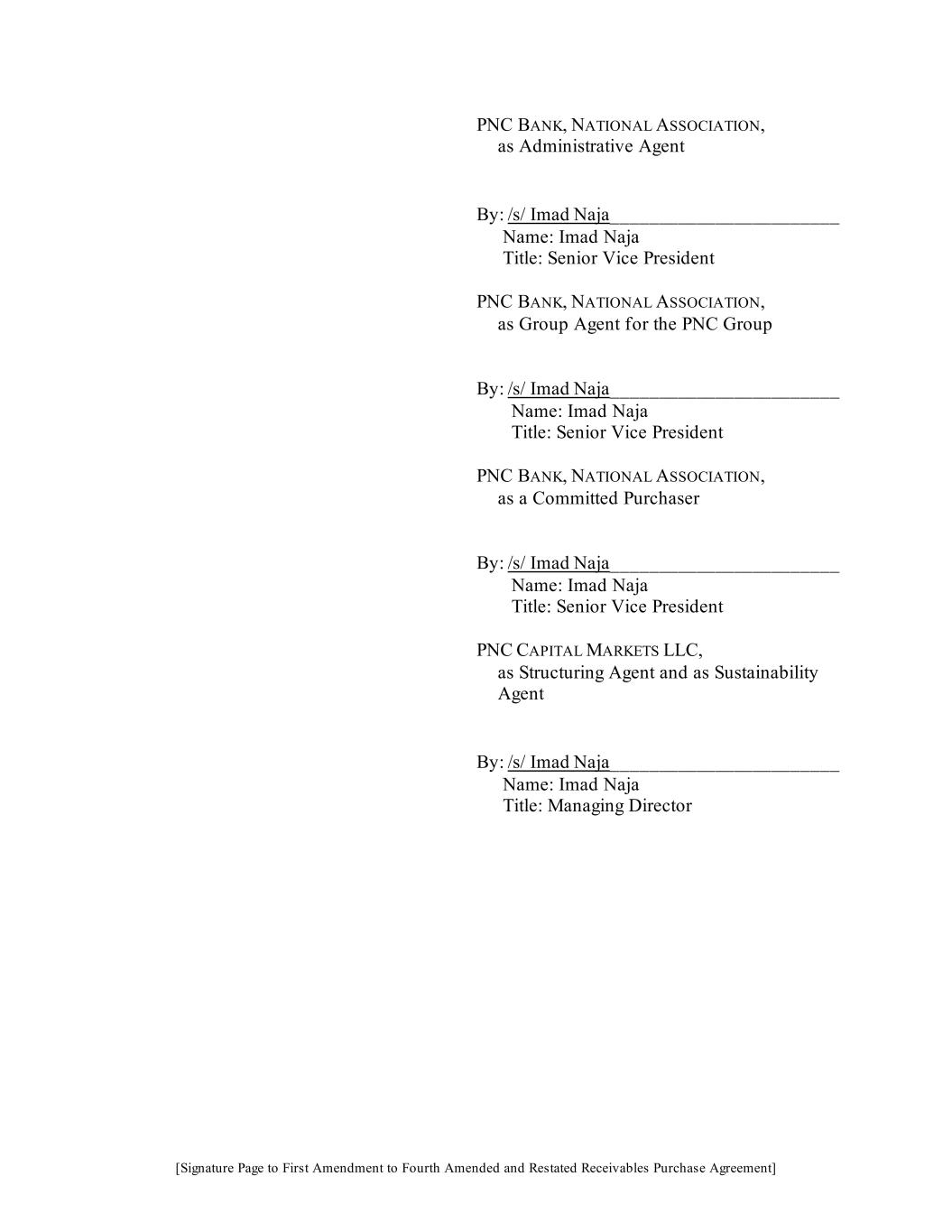 Fourth Amended and Restated Receivables Purchase Agreement PNC BANK, NATIONAL ASSOCIATION, as Administrative Agent By:____________________________________ Name: _____________________________ Title: ______________________________ PNC BANK, NATIONAL ASSOCIATION, as Group Agent for the PNC Group By:____________________________________ Name: _____________________________ Title: ______________________________ PNC BANK, NATIONAL ASSOCIATION, as a Committed Purchaser By:____________________________________ Name: _____________________________ Title: ______________________________ PNC CAPITAL MARKETS LLC, as Structuring Agent and as Sustainability Agent By:____________________________________ Name: _____________________________ Title: ______________________________