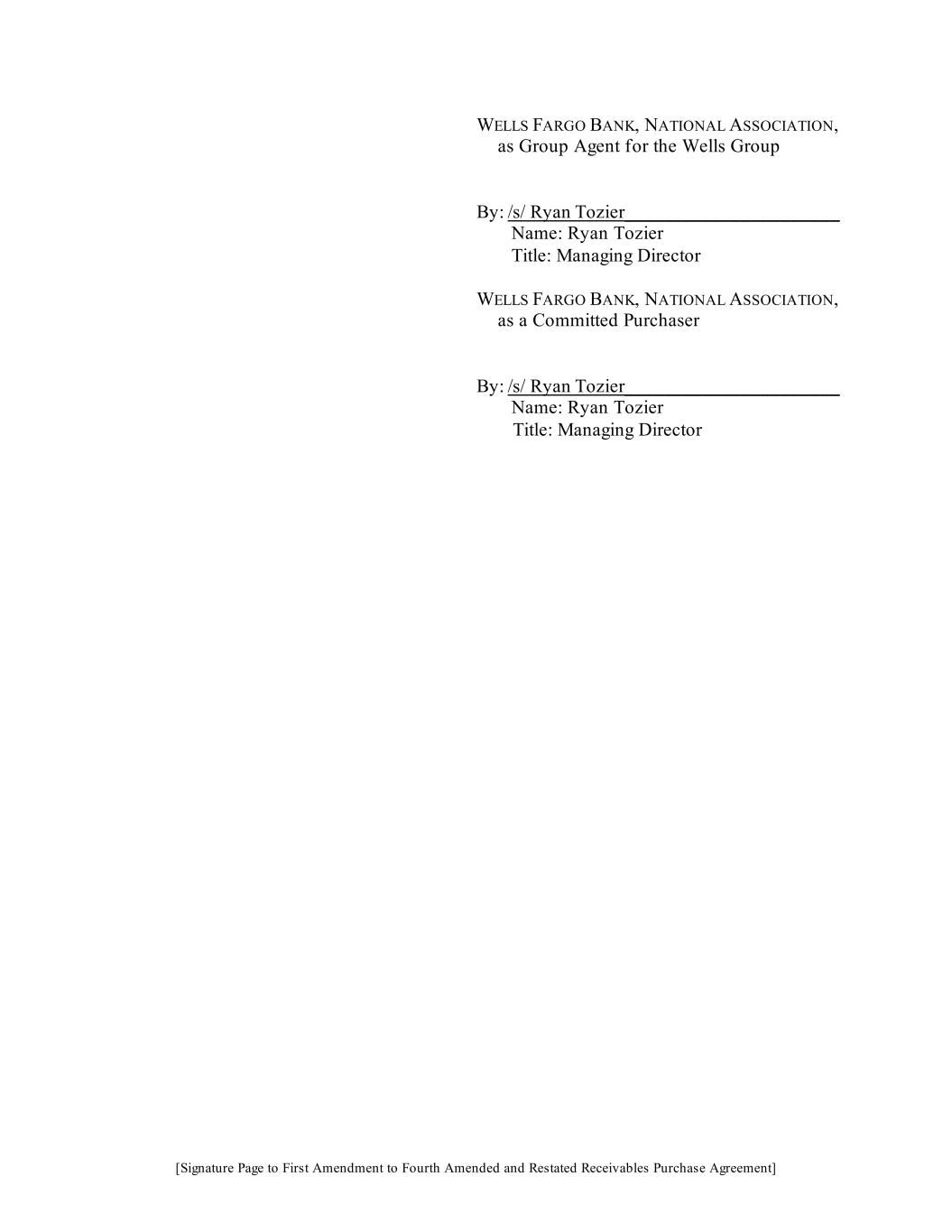 [Signature Page to First Amendment to Fourth Amended and Restated Receivables Purchase Agreement] WELLS FARGO BANK, NATIONAL ASSOCIATION, as Group Agent for the Wells Group By: /s/ Ryan Tozier______________________ Name: Ryan Tozier Title: Managing Director WELLS FARGO BANK, NATIONAL ASSOCIATION, as a Committed Purchaser By: /s/ Ryan Tozier______________________ Name: Ryan Tozier Title: Managing Director