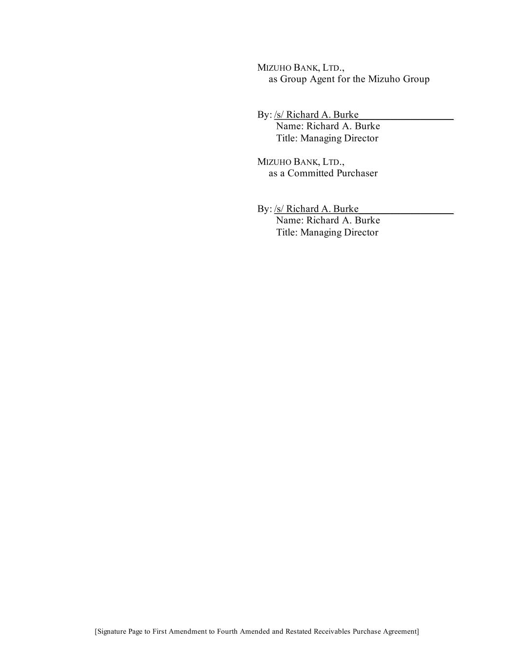 [Signature Page to First Amendment to Fourth Amended and Restated Receivables Purchase Agreement] MIZUHO BANK, LTD., as Group Agent for the Mizuho Group By: /s/ Richard A. Burke___________________ Name: Richard A. Burke Title: Managing Director MIZUHO BANK, LTD., as a Committed Purchaser By: /s/ Richard A. Burke___________________ Name: Richard A. Burke Title: Managing Director