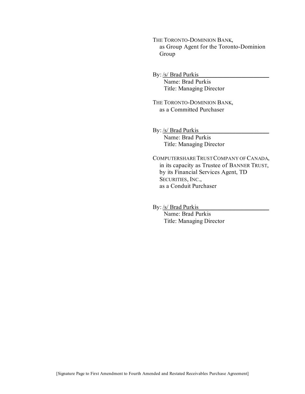 [Signature Page to First Amendment to Fourth Amended and Restated Receivables Purchase Agreement] THE TORONTO-DOMINION BANK, as Group Agent for the Toronto-Dominion Group By: /s/ Brad Purkis_______________________ Name: Brad Purkis Title: Managing Director THE TORONTO-DOMINION BANK, as a Committed Purchaser By: /s/ Brad Purkis_______________________ Name: Brad Purkis Title: Managing Director COMPUTERSHARE TRUST COMPANY OF CANADA, in its capacity as Trustee of BANNER TRUST, by its Financial Services Agent, TD SECURITIES, INC., as a Conduit Purchaser By: /s/ Brad Purkis_______________________ Name: Brad Purkis Title: Managing Director